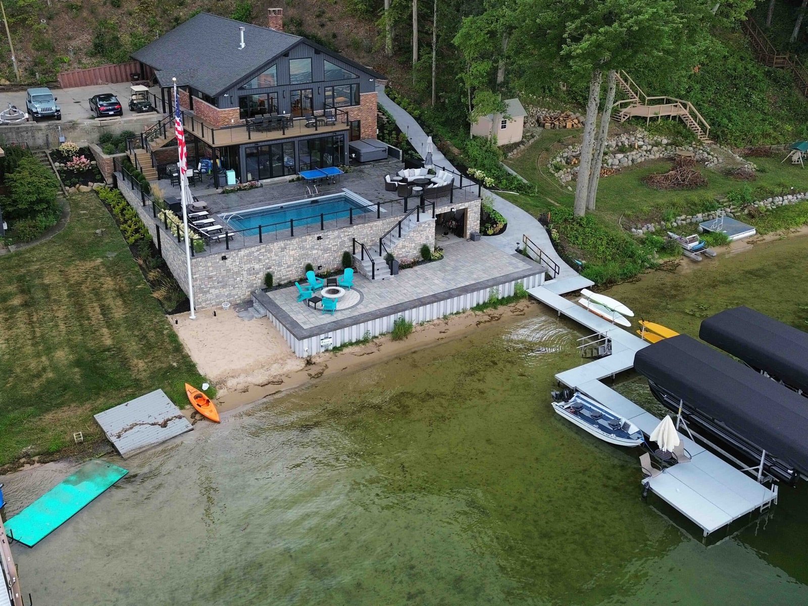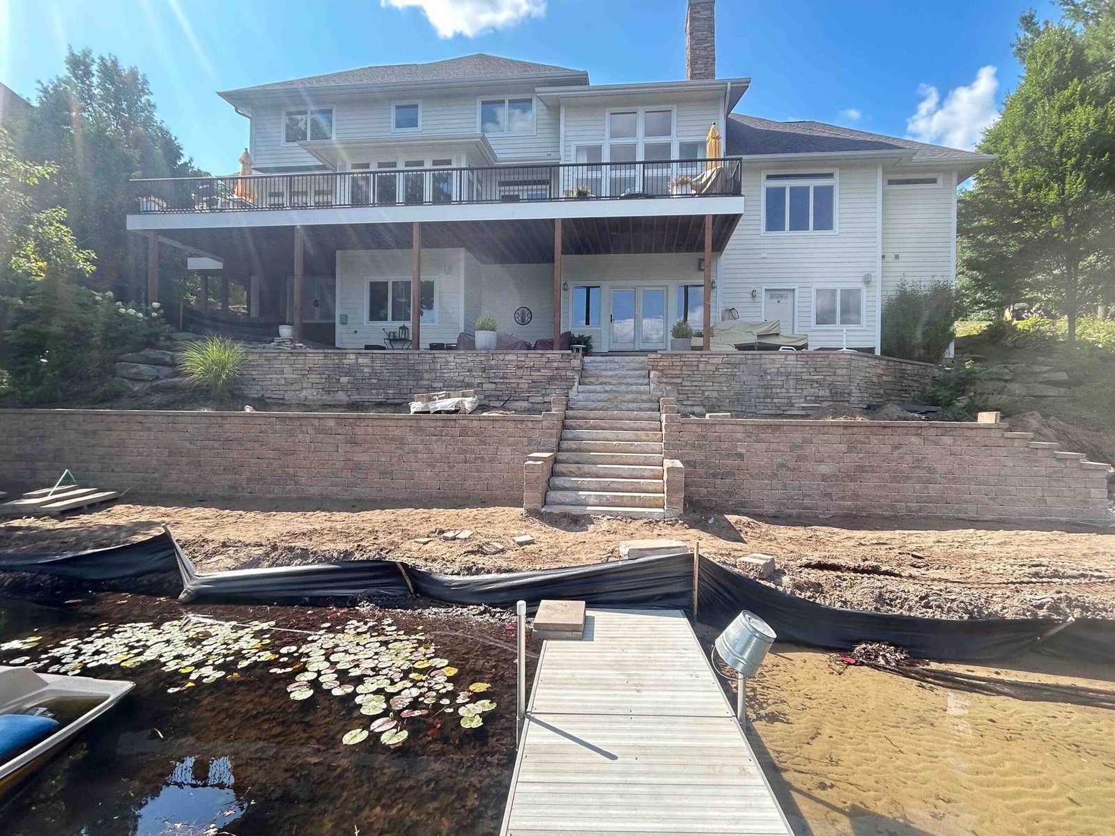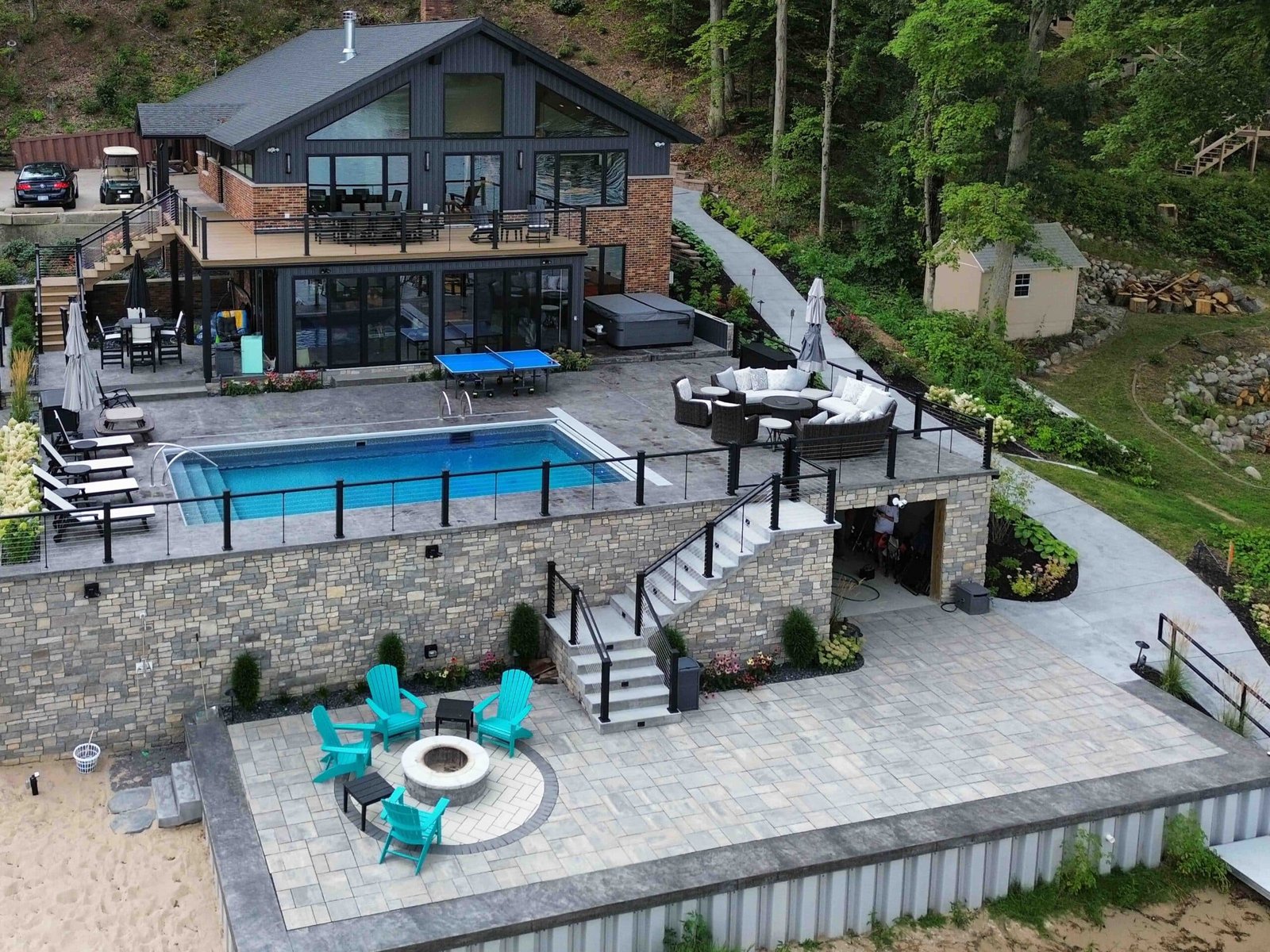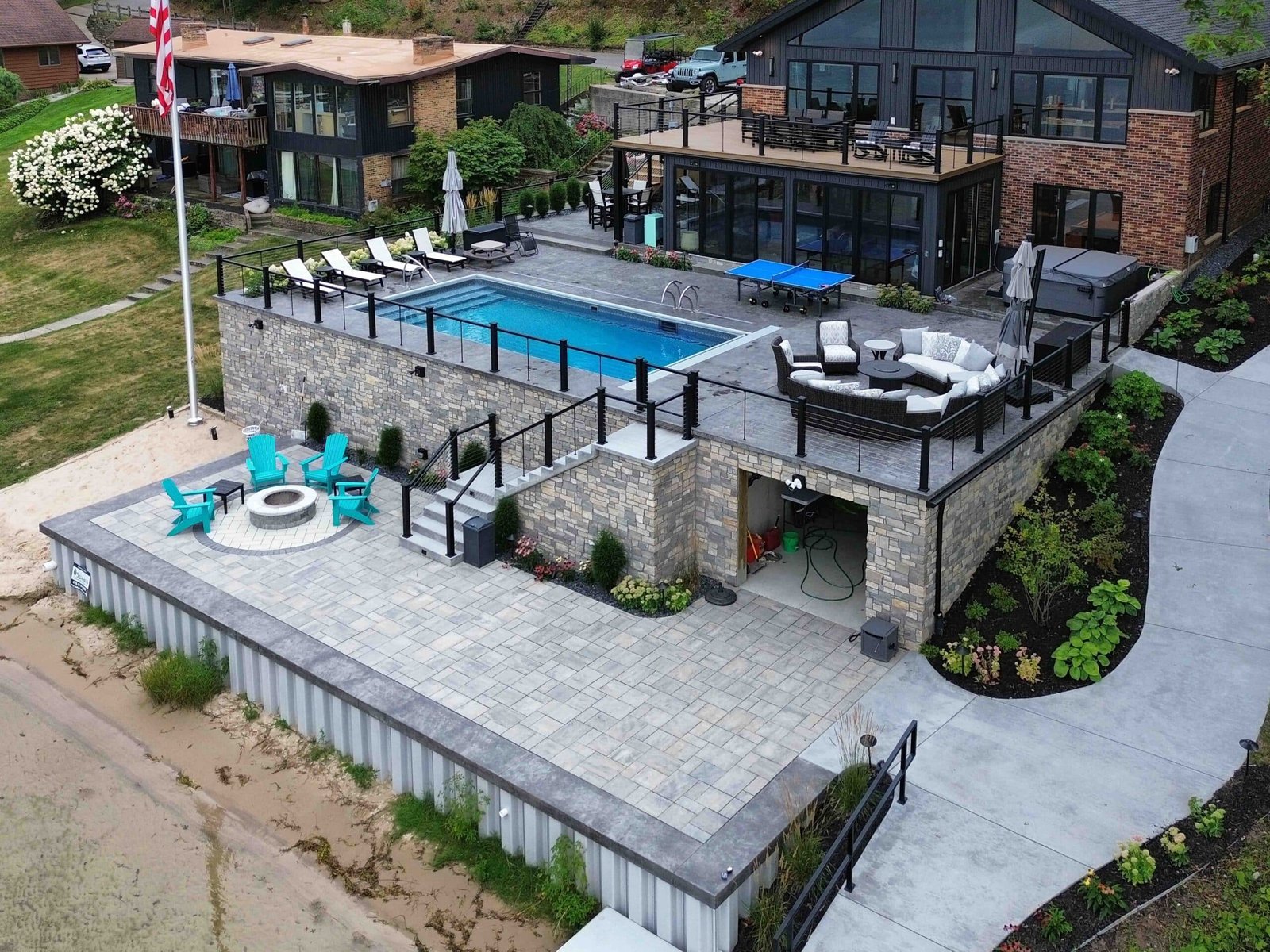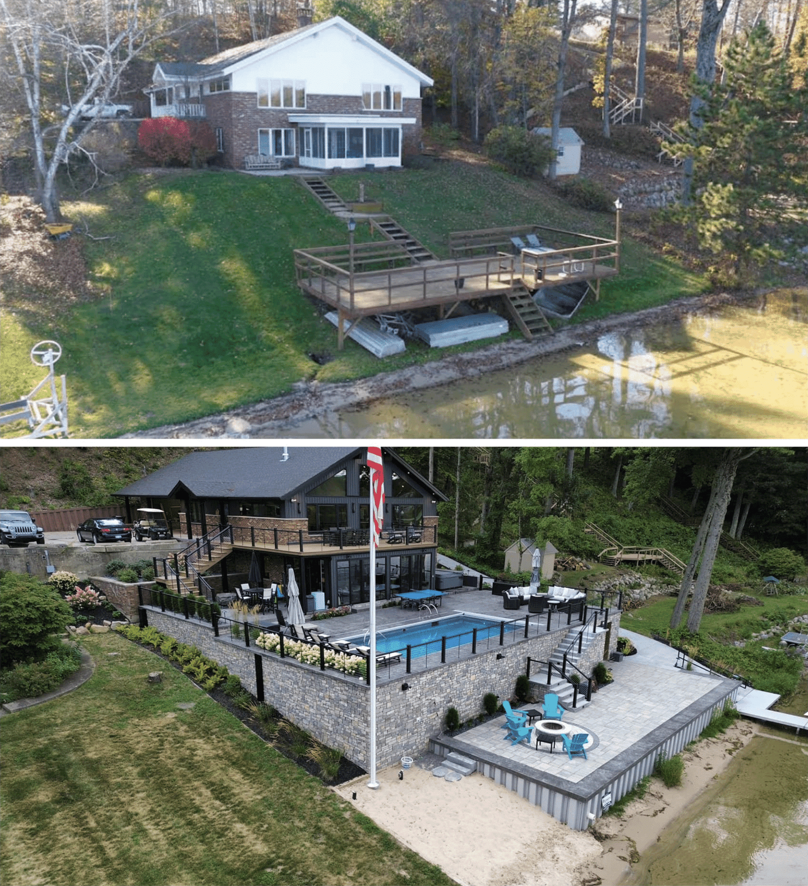 The property was transformed with multi-tiered stone retaining walls, expansive paver patios, a pool, modern railings, lush plantings, a fire pit area, and integrated beach access—creating a stunning, resort-style lakefront retreat.