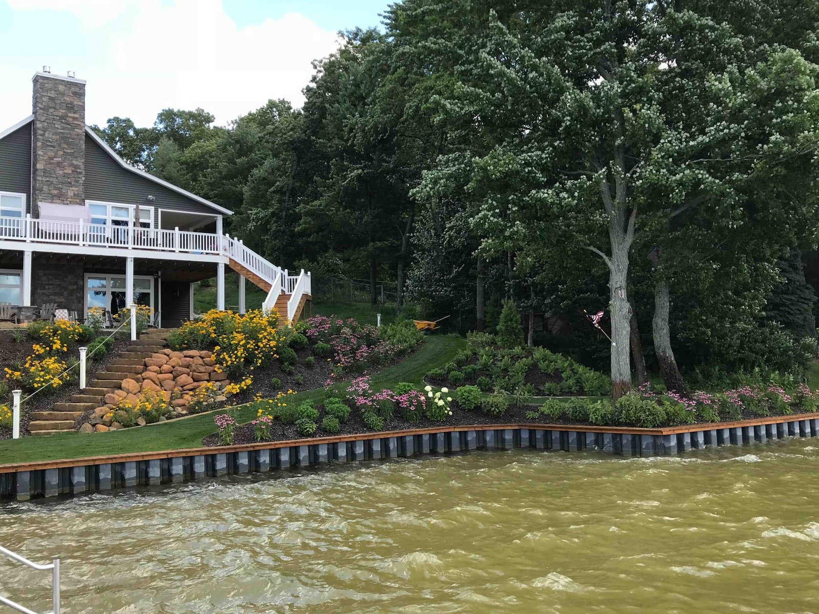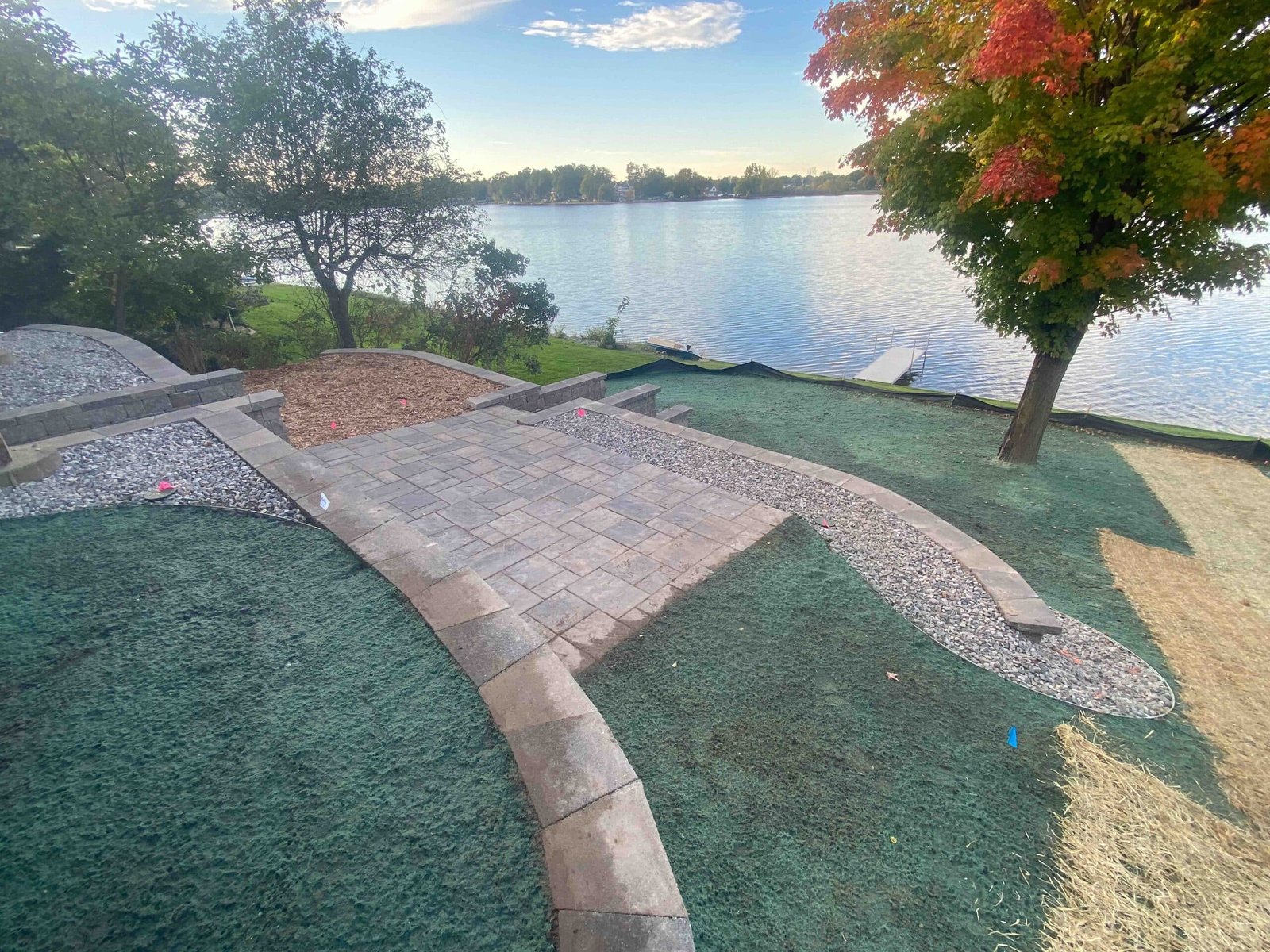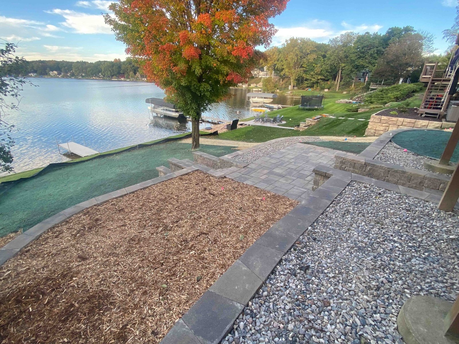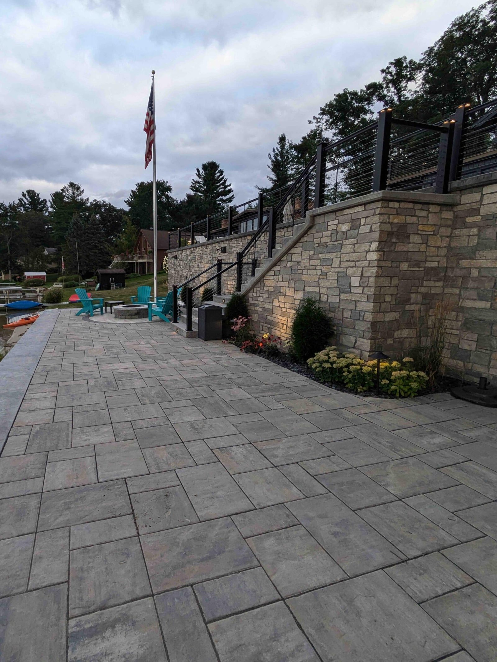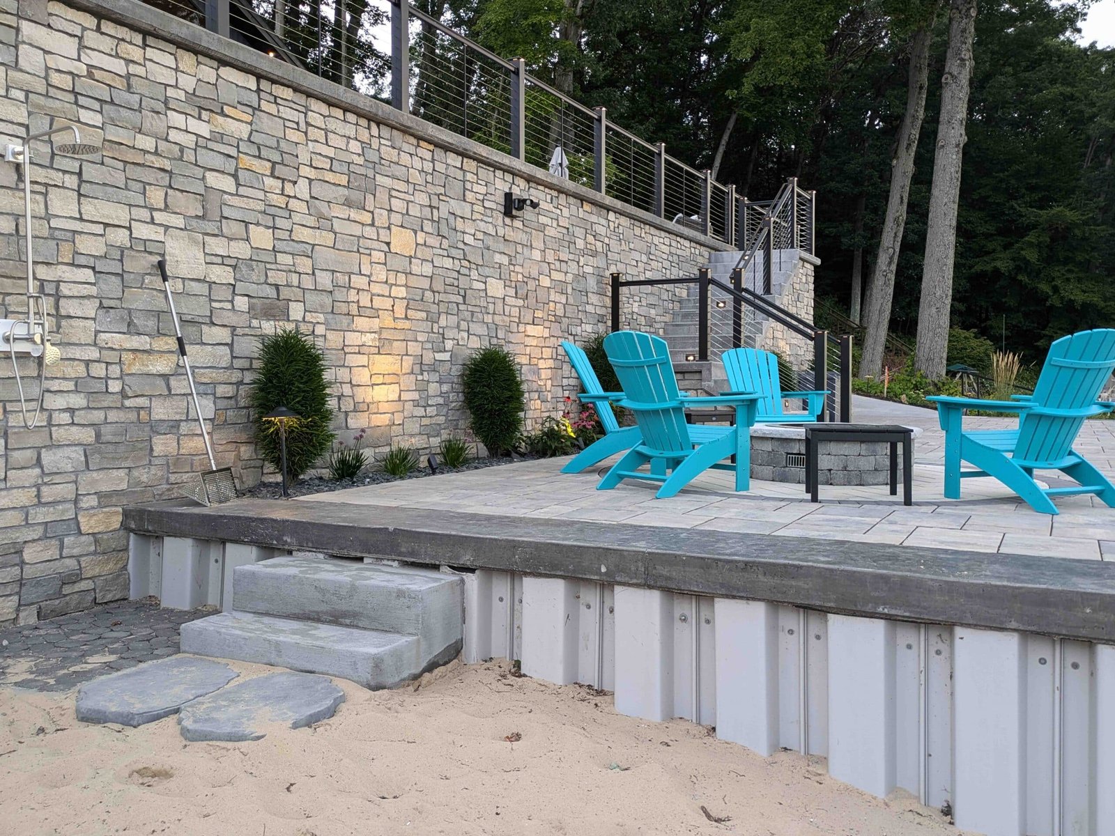 The property was transformed with multi-tiered stone retaining walls, expansive paver patios, a pool, modern railings, lush plantings, a fire pit area, and integrated beach access—creating a stunning, resort-style lakefront retreat.