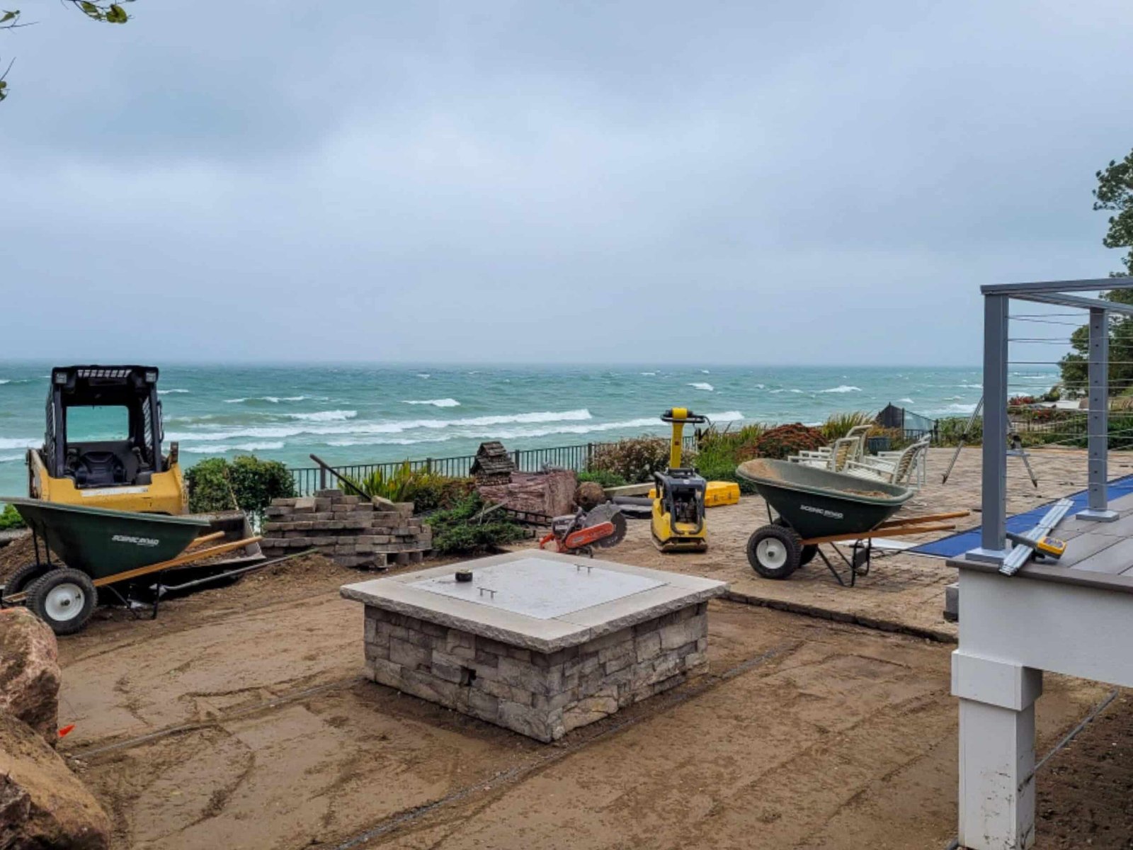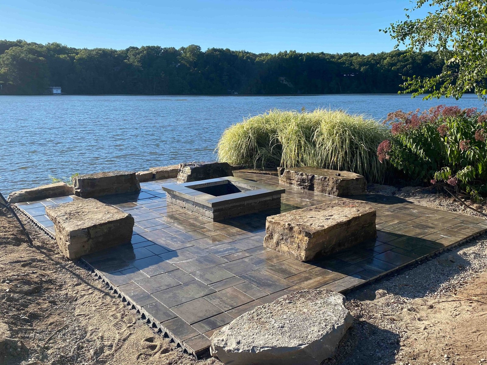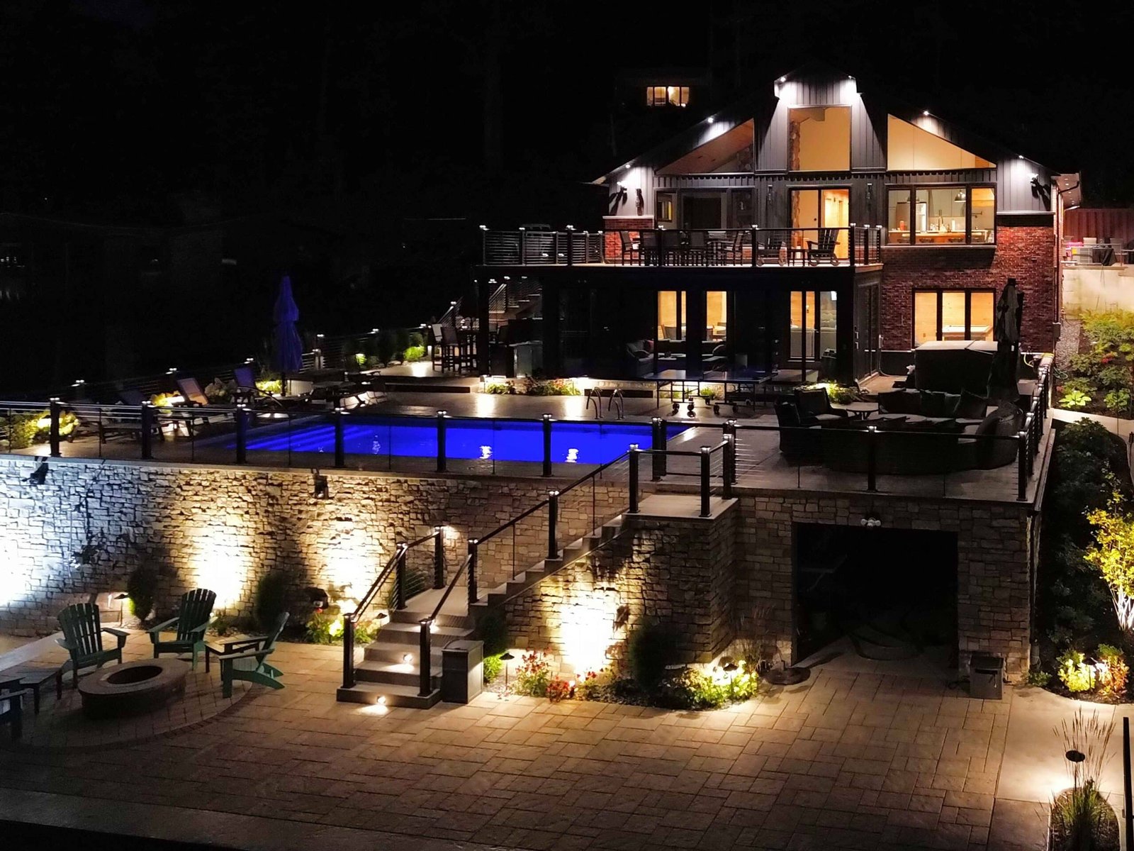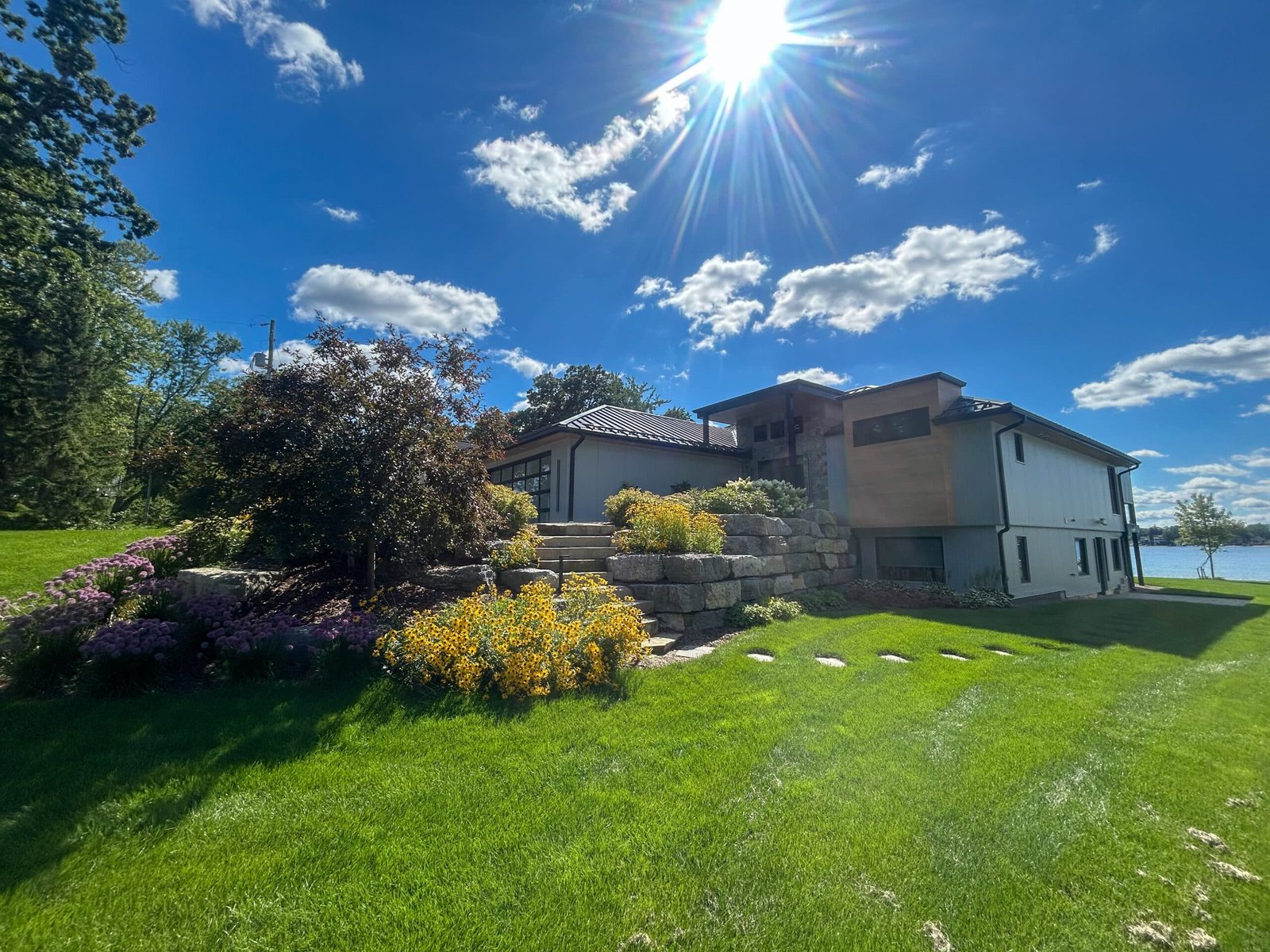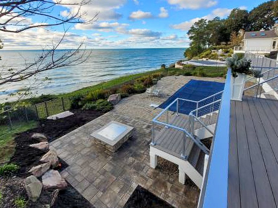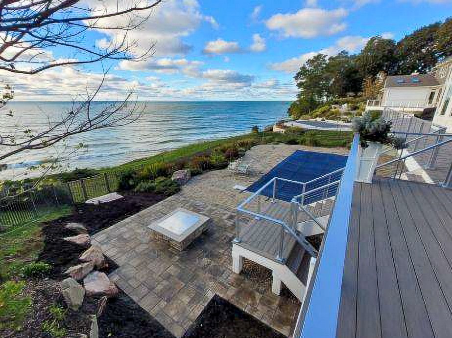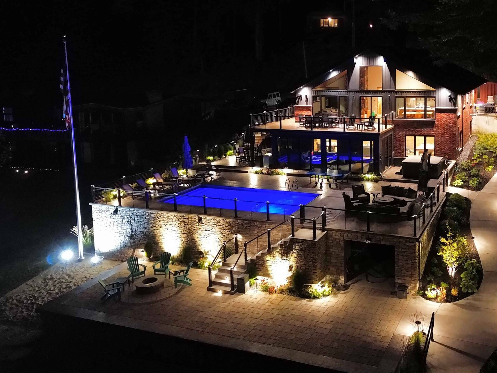The property was transformed with multi-tiered stone retaining walls, expansive paver patios, a pool, modern railings, lush plantings, a fire pit area, and integrated beach access—creating a stunning, resort-style lakefront retreat.