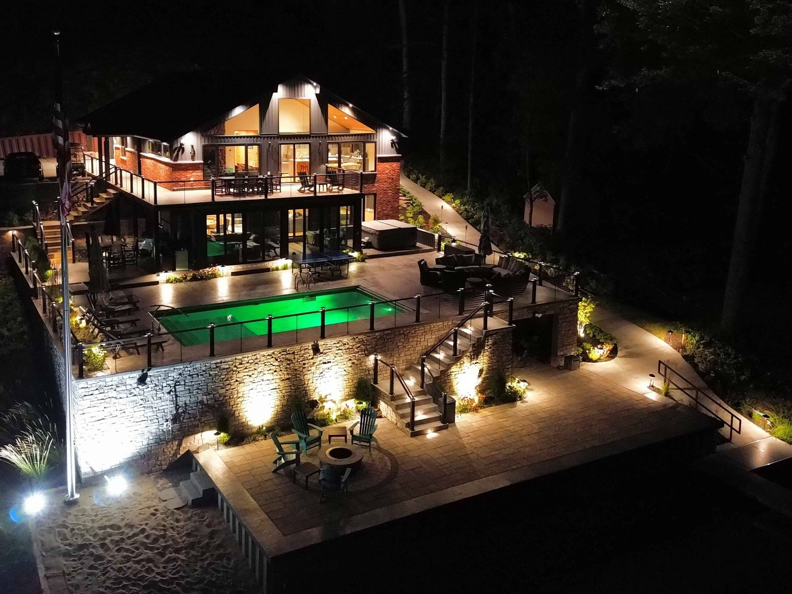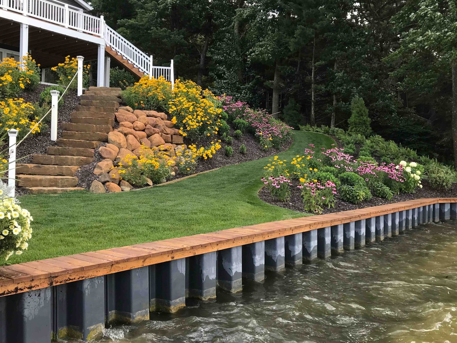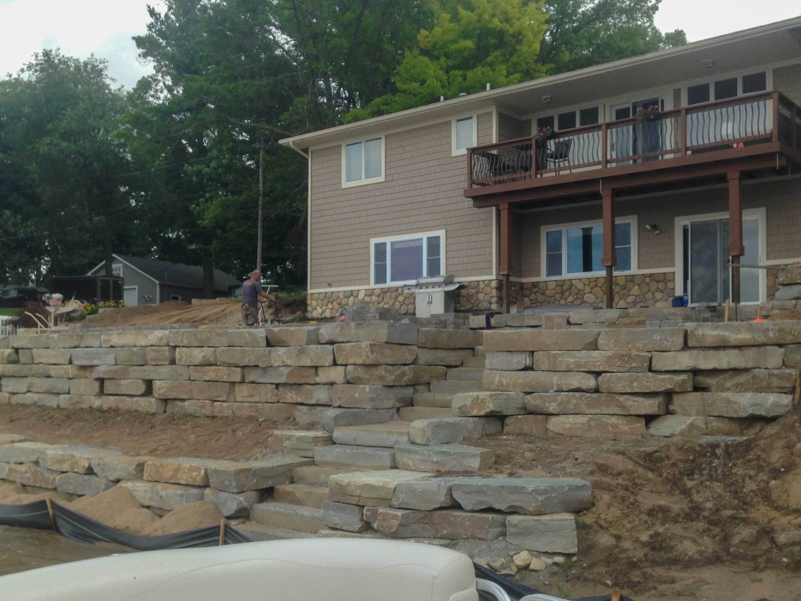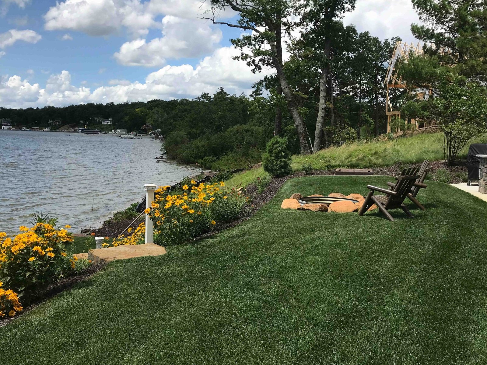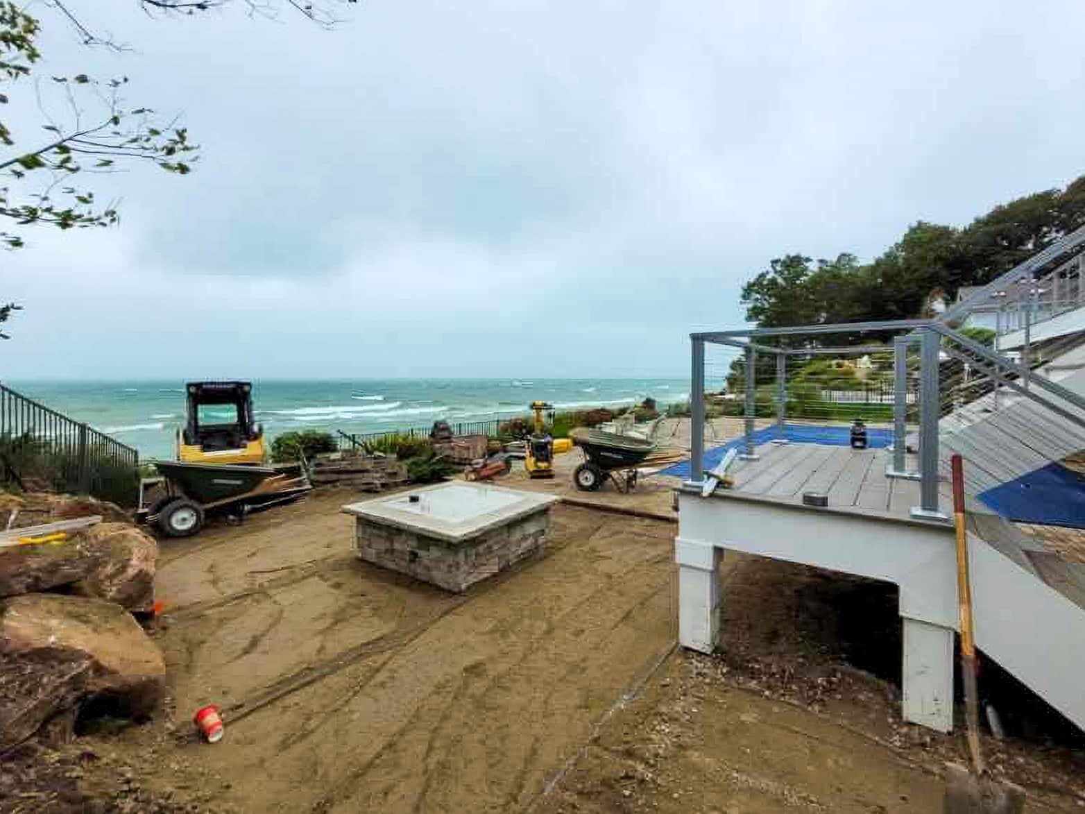 The property was transformed with multi-tiered stone retaining walls, expansive paver patios, a pool, modern railings, lush plantings, a fire pit area, and integrated beach access—creating a stunning, resort-style lakefront retreat.