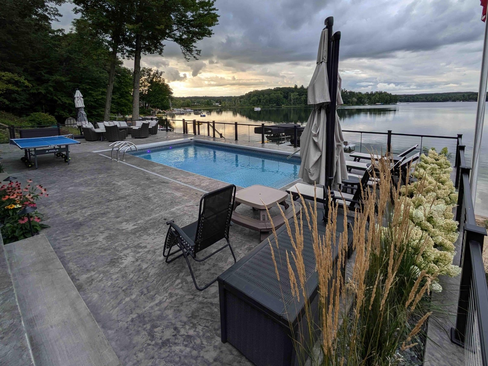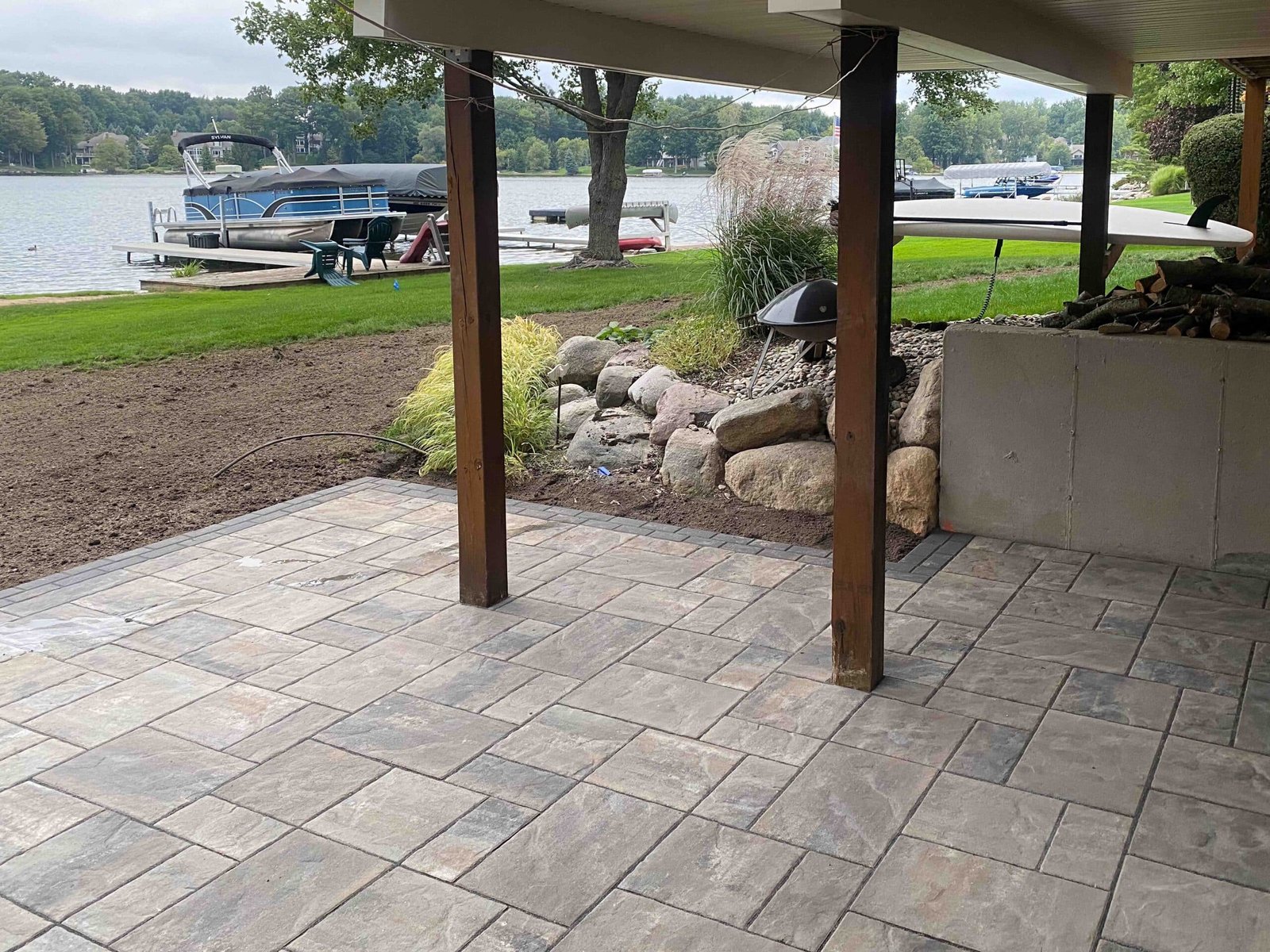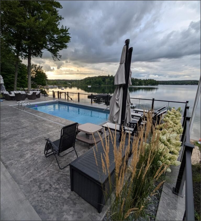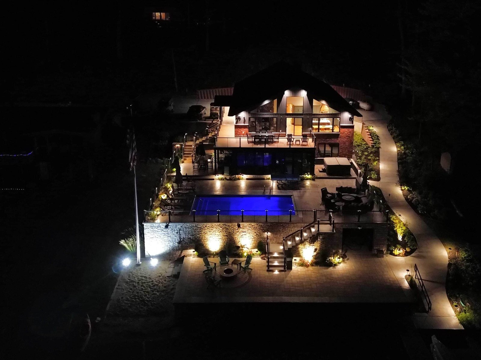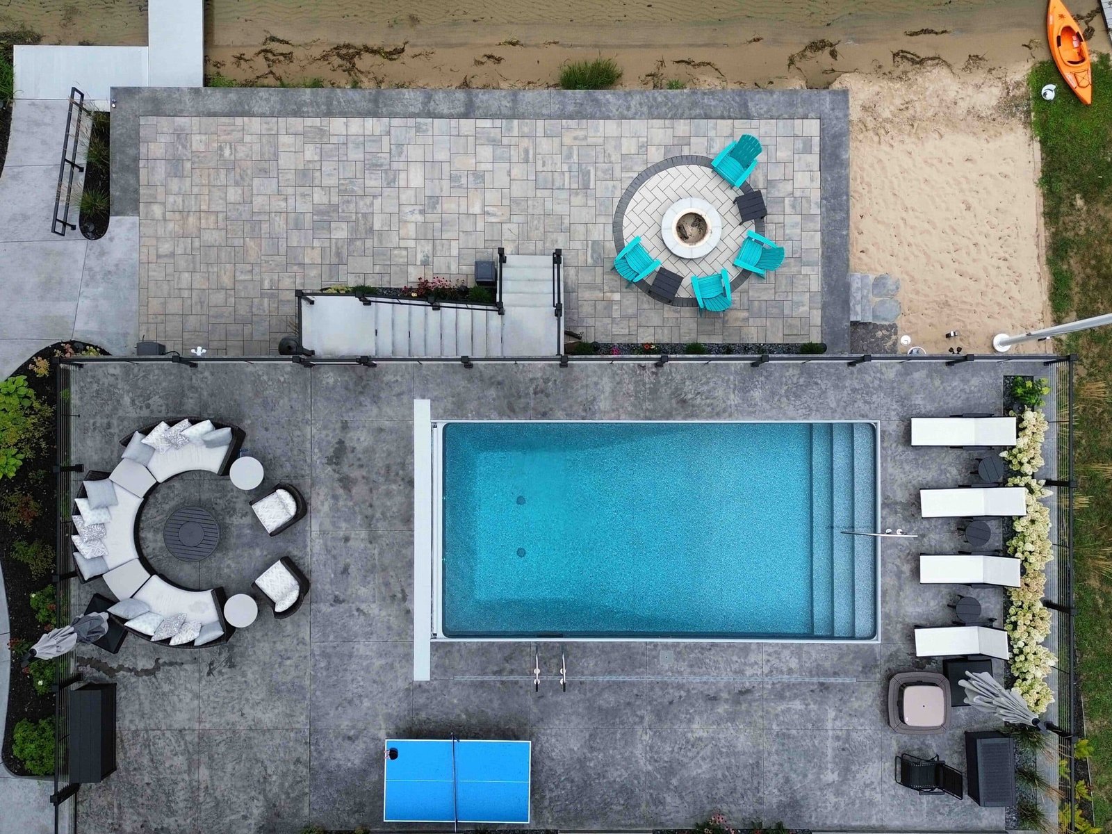 The property was transformed with multi-tiered stone retaining walls, expansive paver patios, a pool, modern railings, lush plantings, a fire pit area, and integrated beach access—creating a stunning, resort-style lakefront retreat.