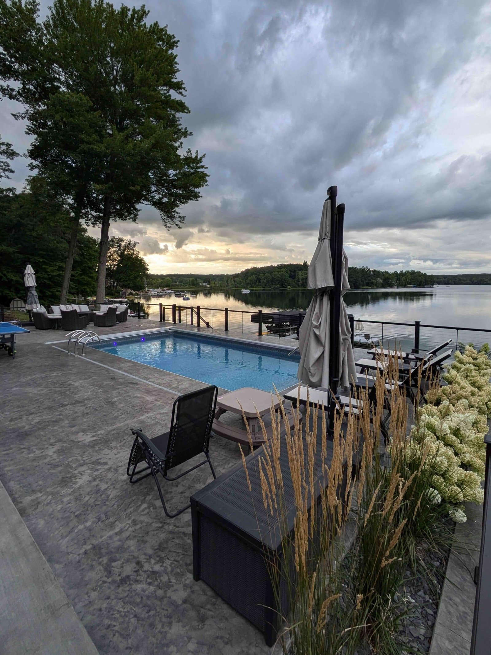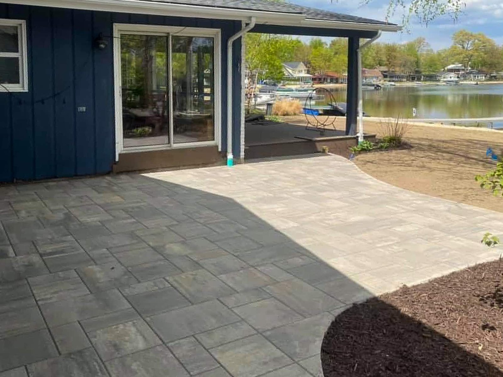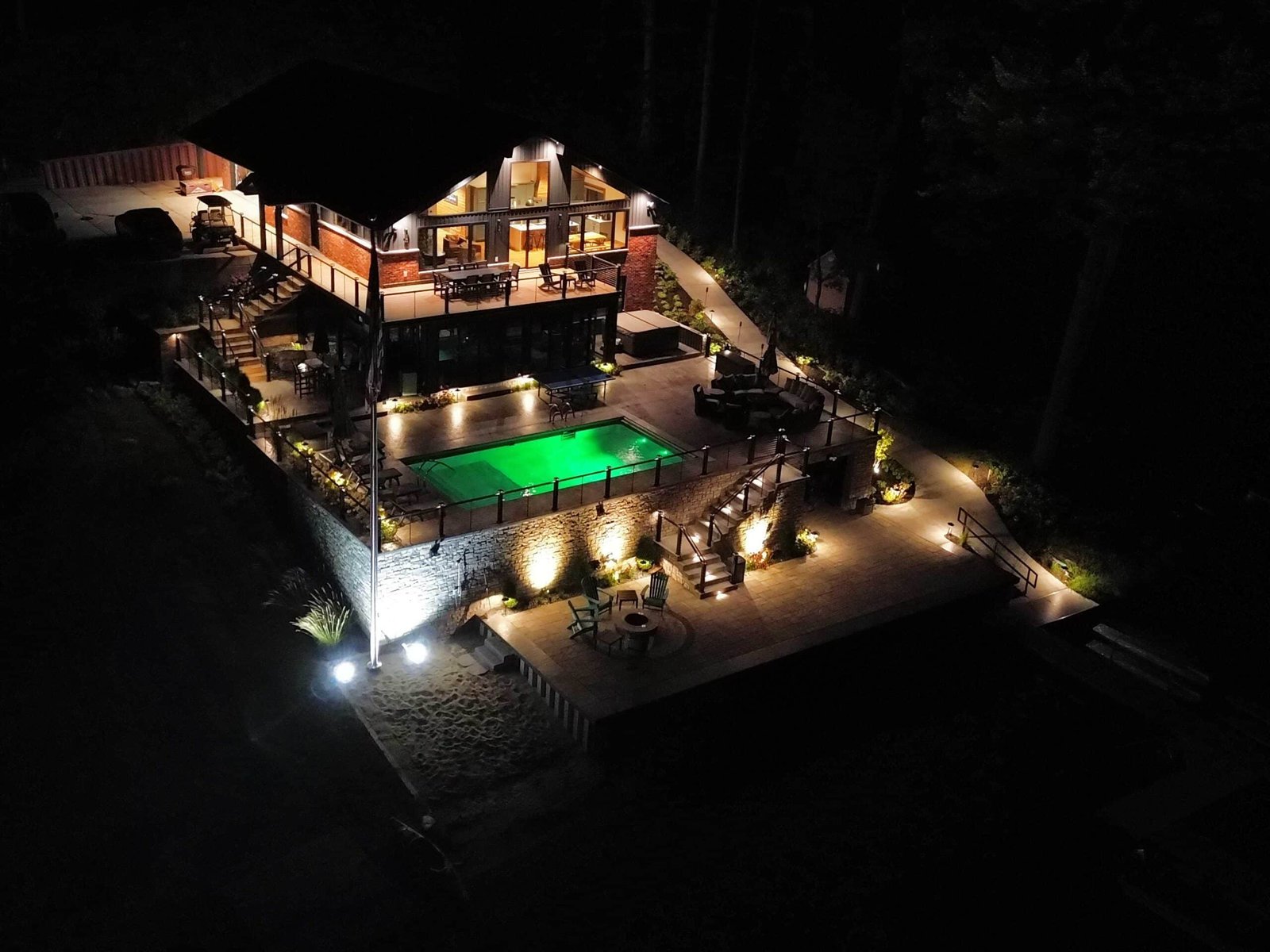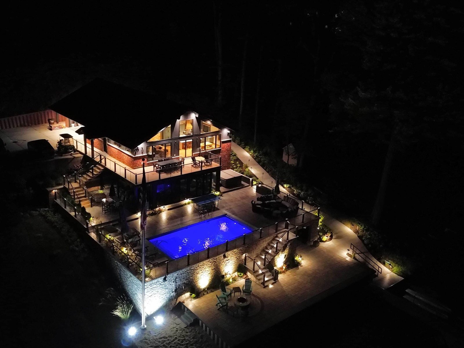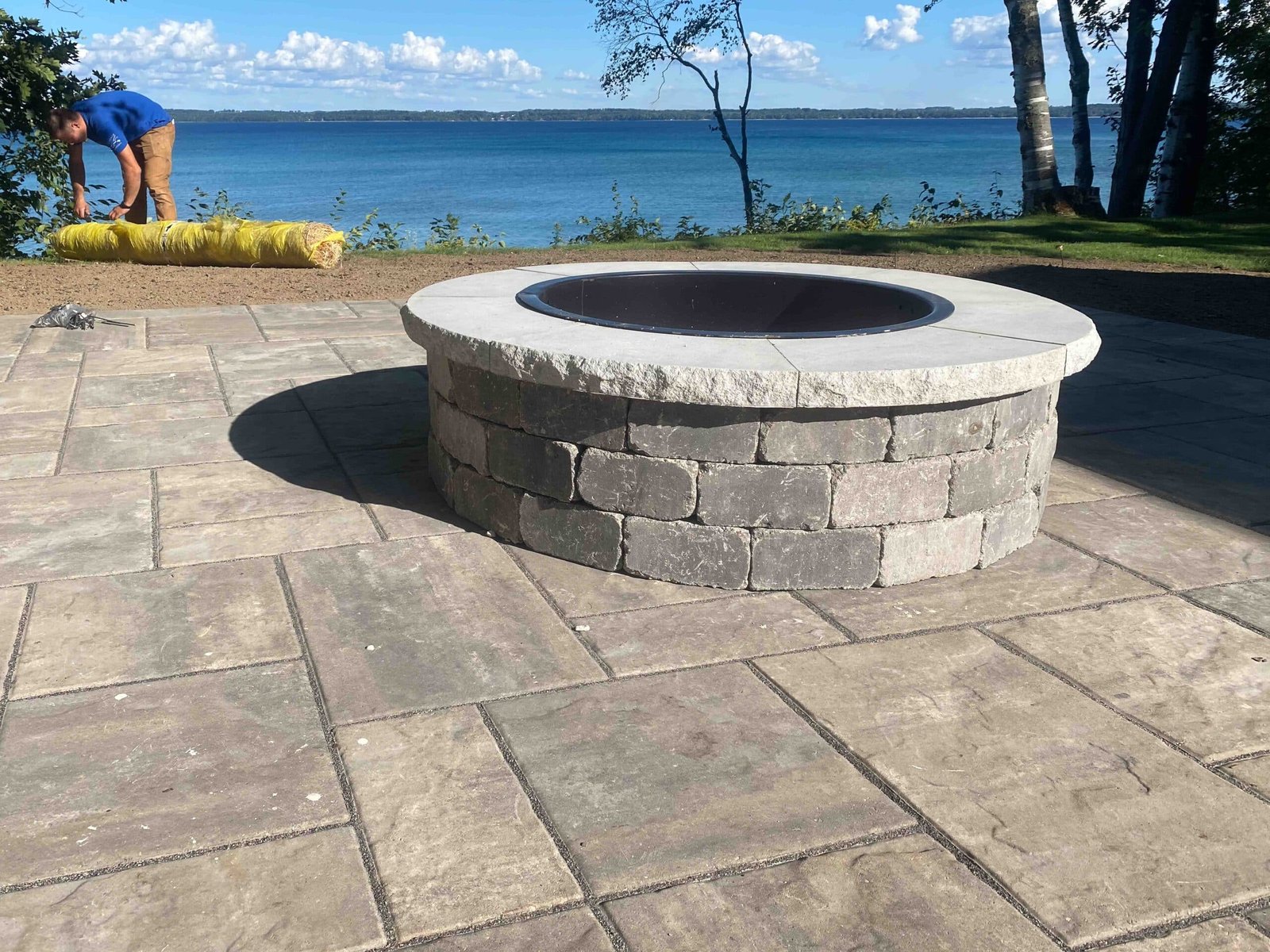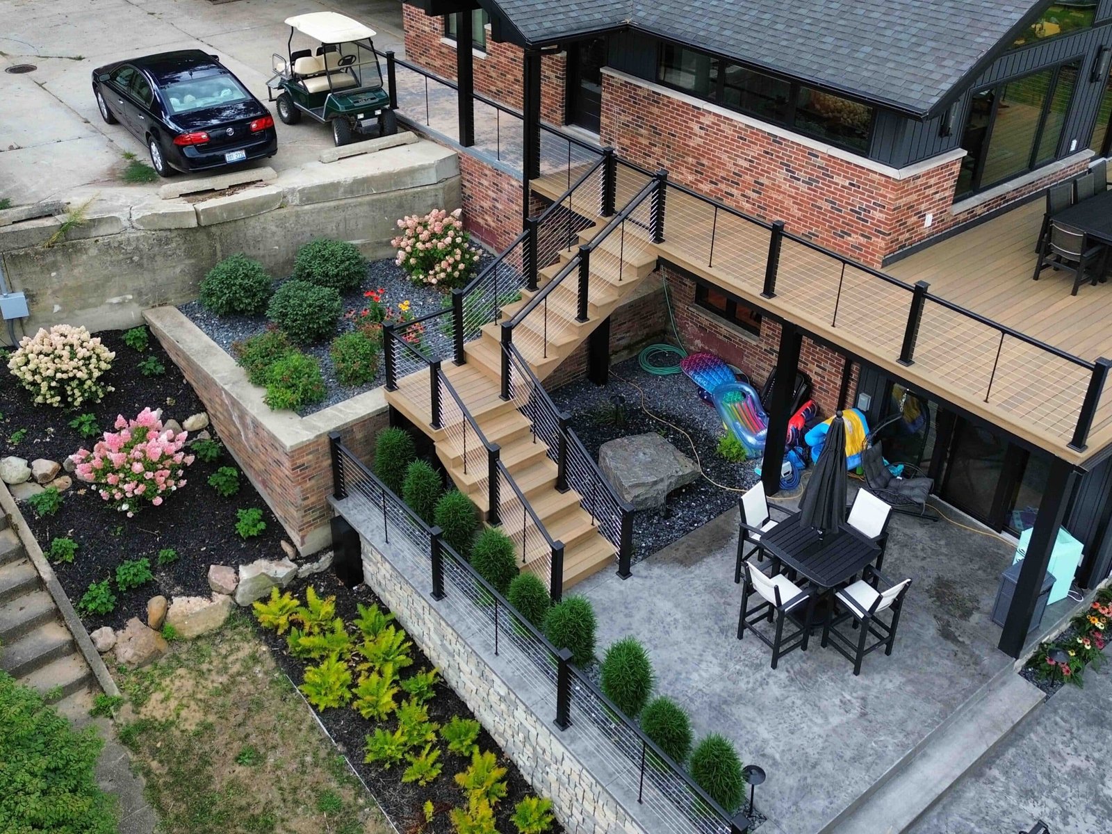 The property was transformed with multi-tiered stone retaining walls, expansive paver patios, a pool, modern railings, lush plantings, a fire pit area, and integrated beach access—creating a stunning, resort-style lakefront retreat.
