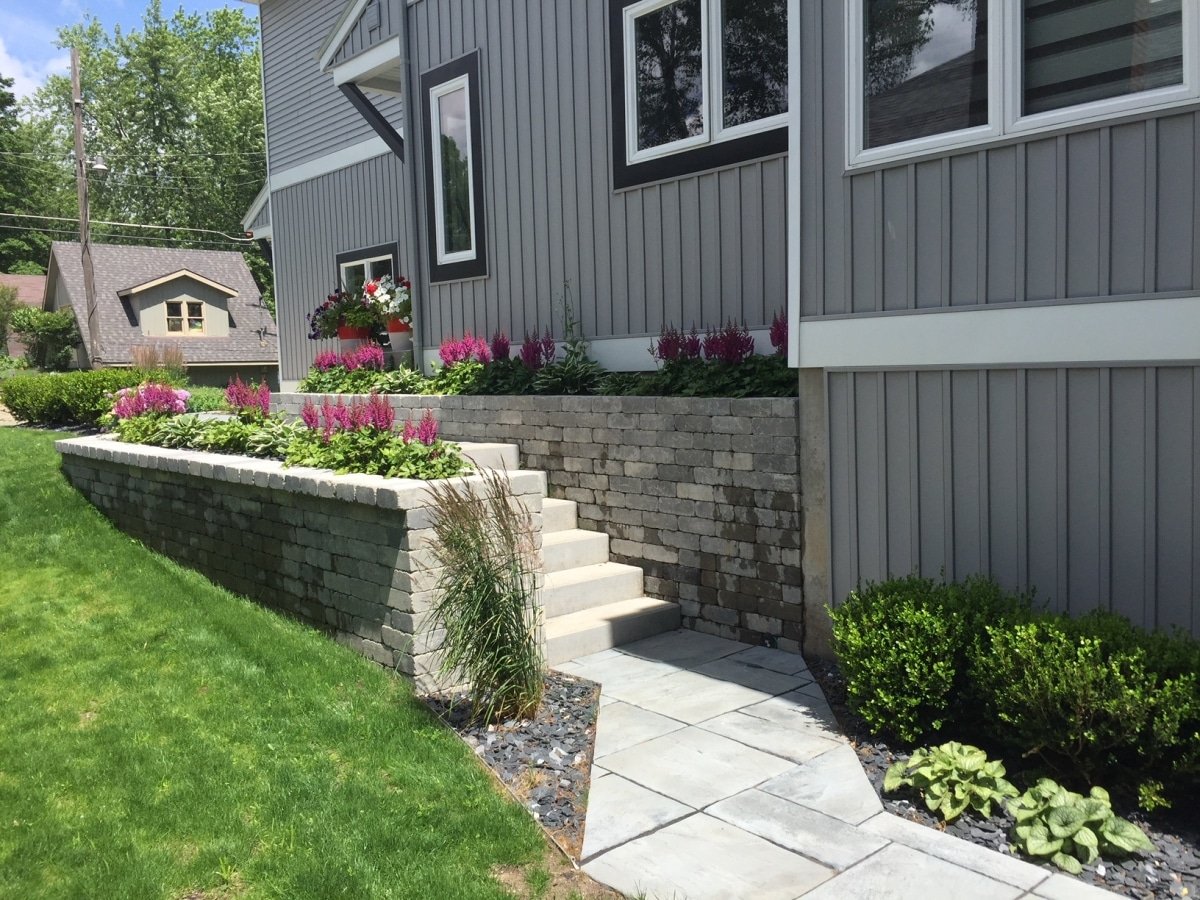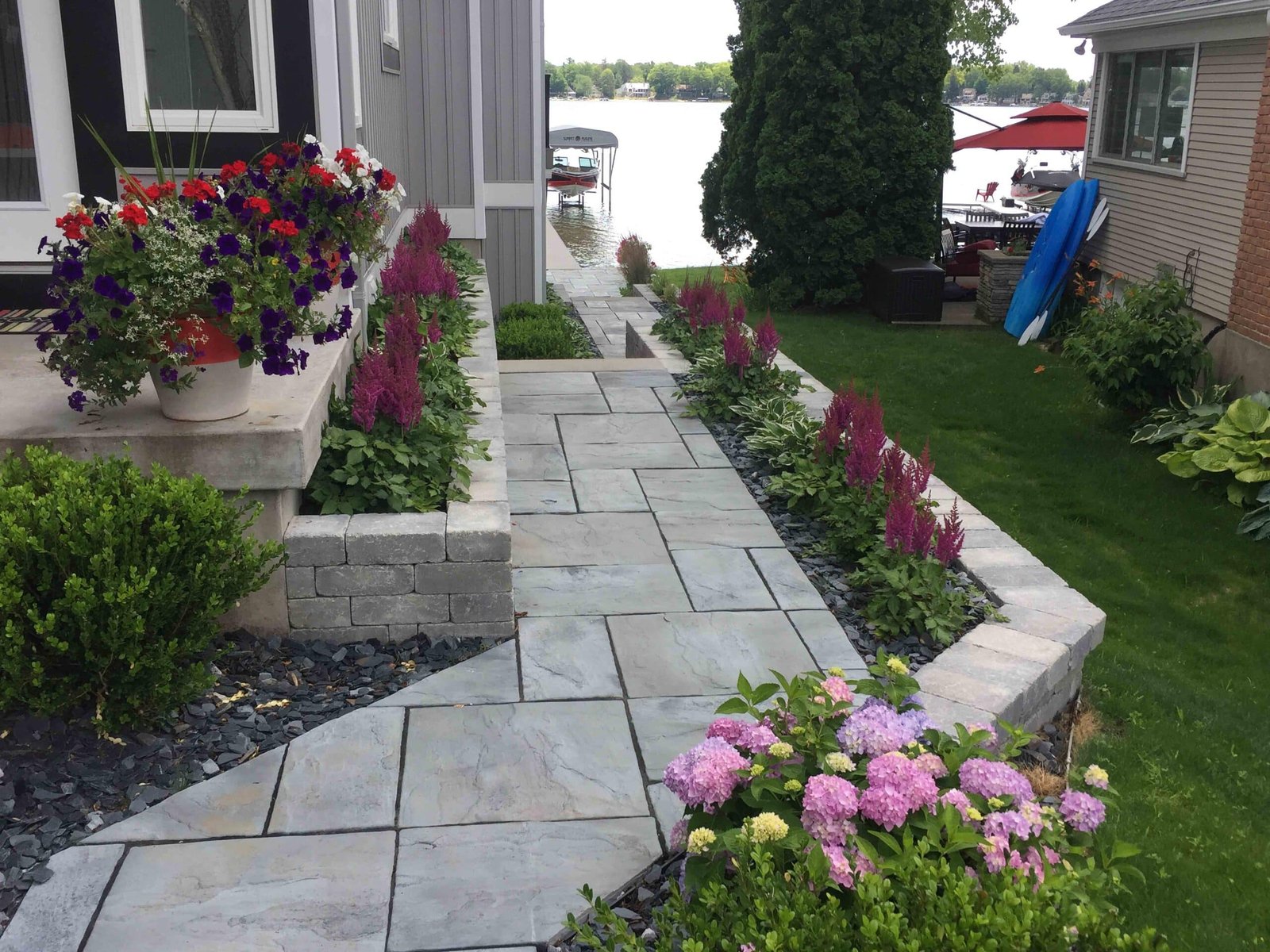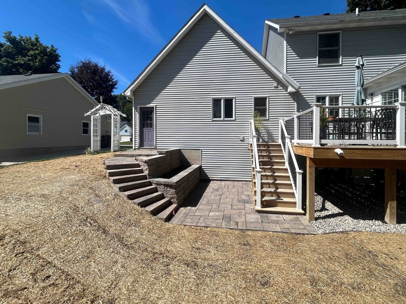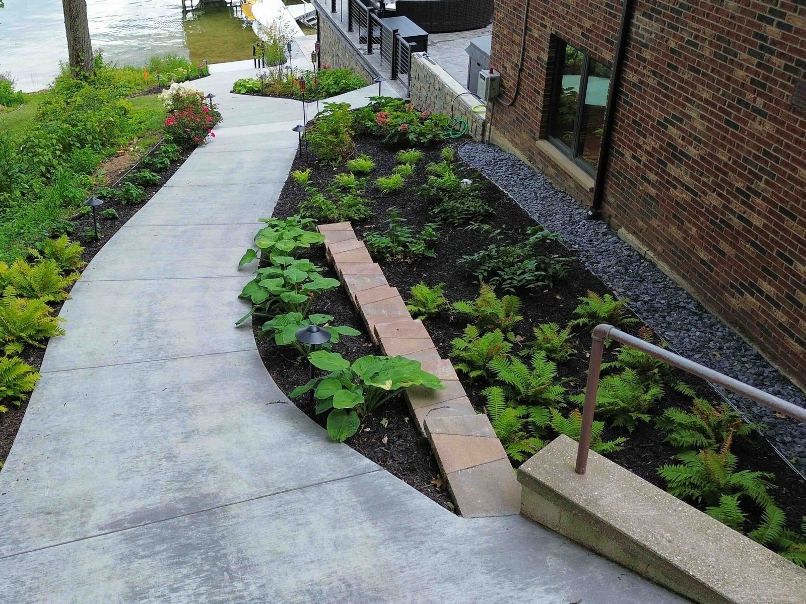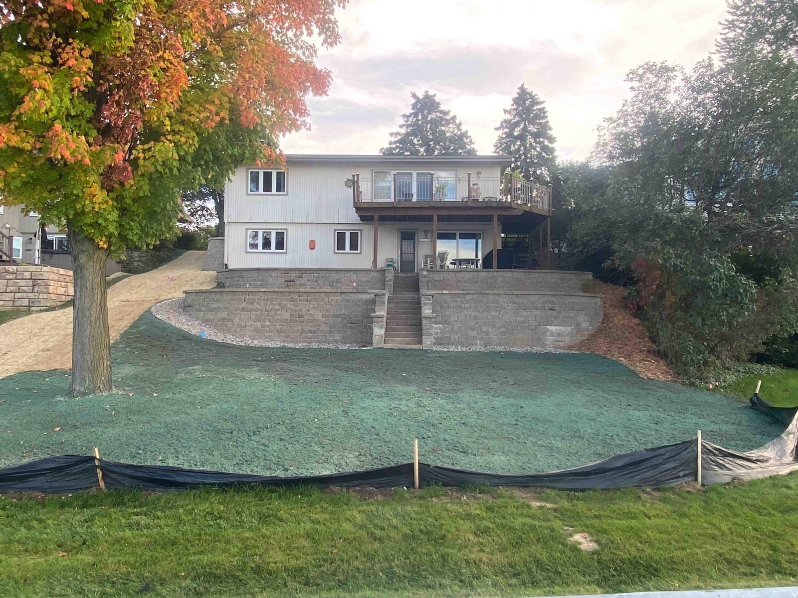 The property was transformed with multi-tiered stone retaining walls, expansive paver patios, a pool, modern railings, lush plantings, a fire pit area, and integrated beach access—creating a stunning, resort-style lakefront retreat.