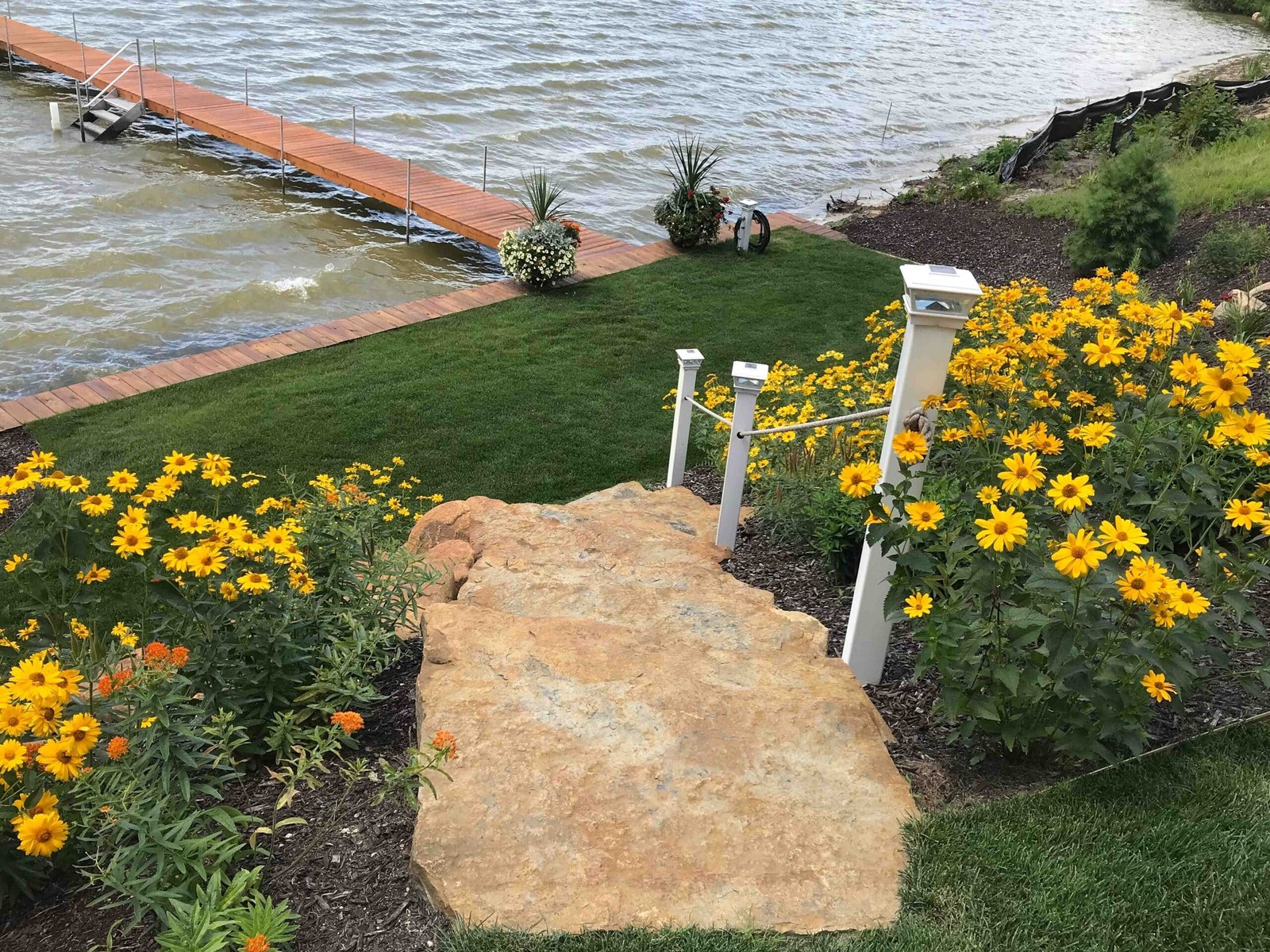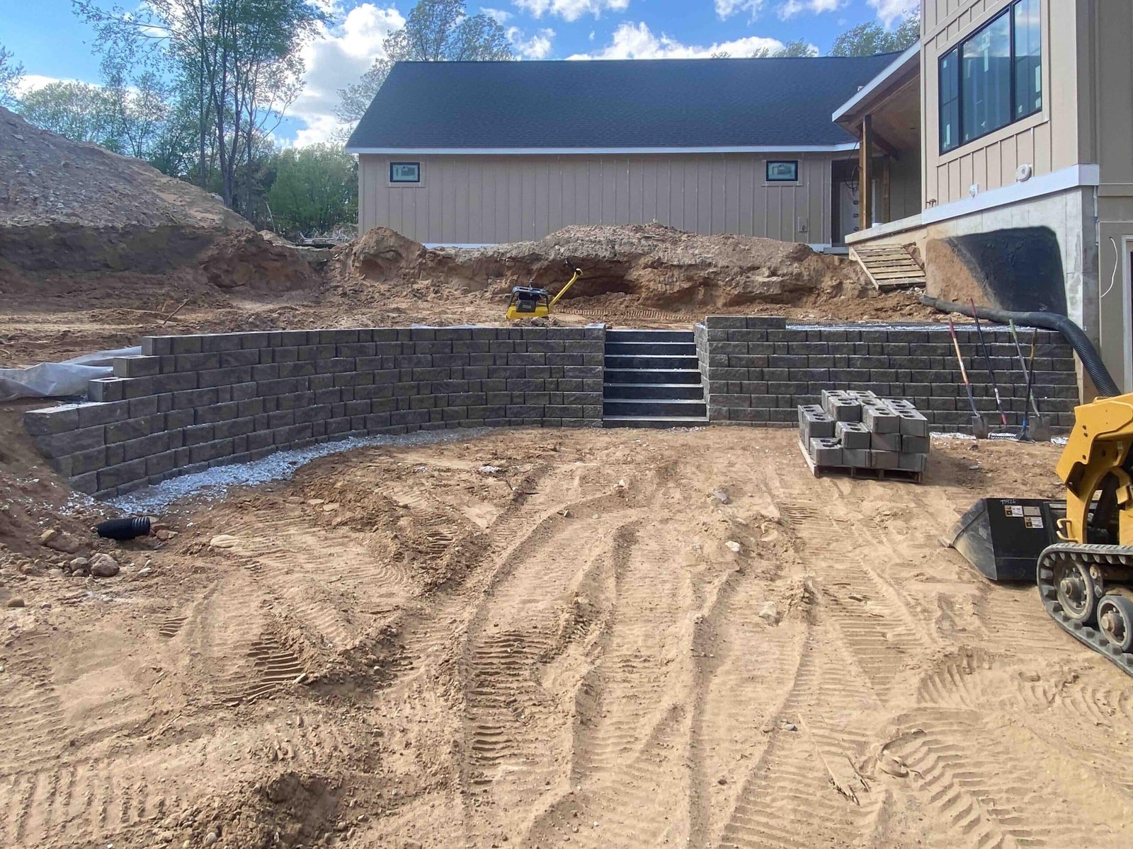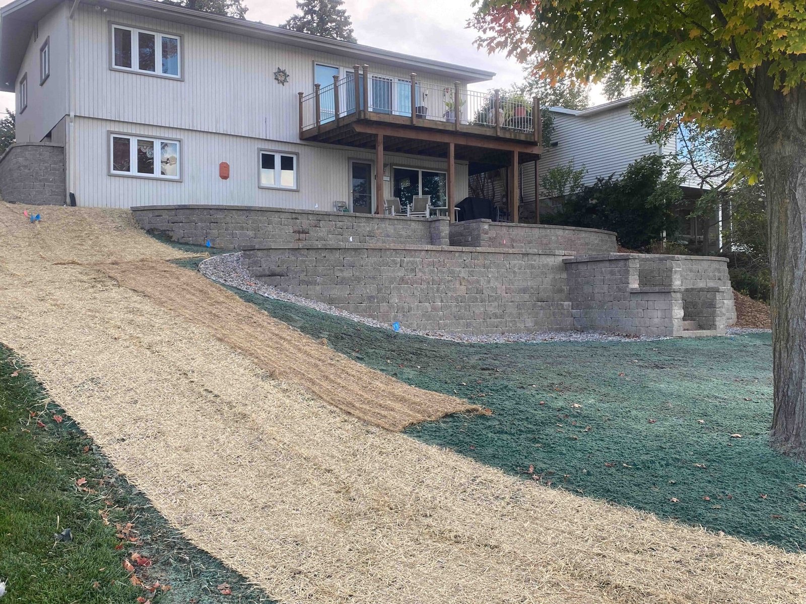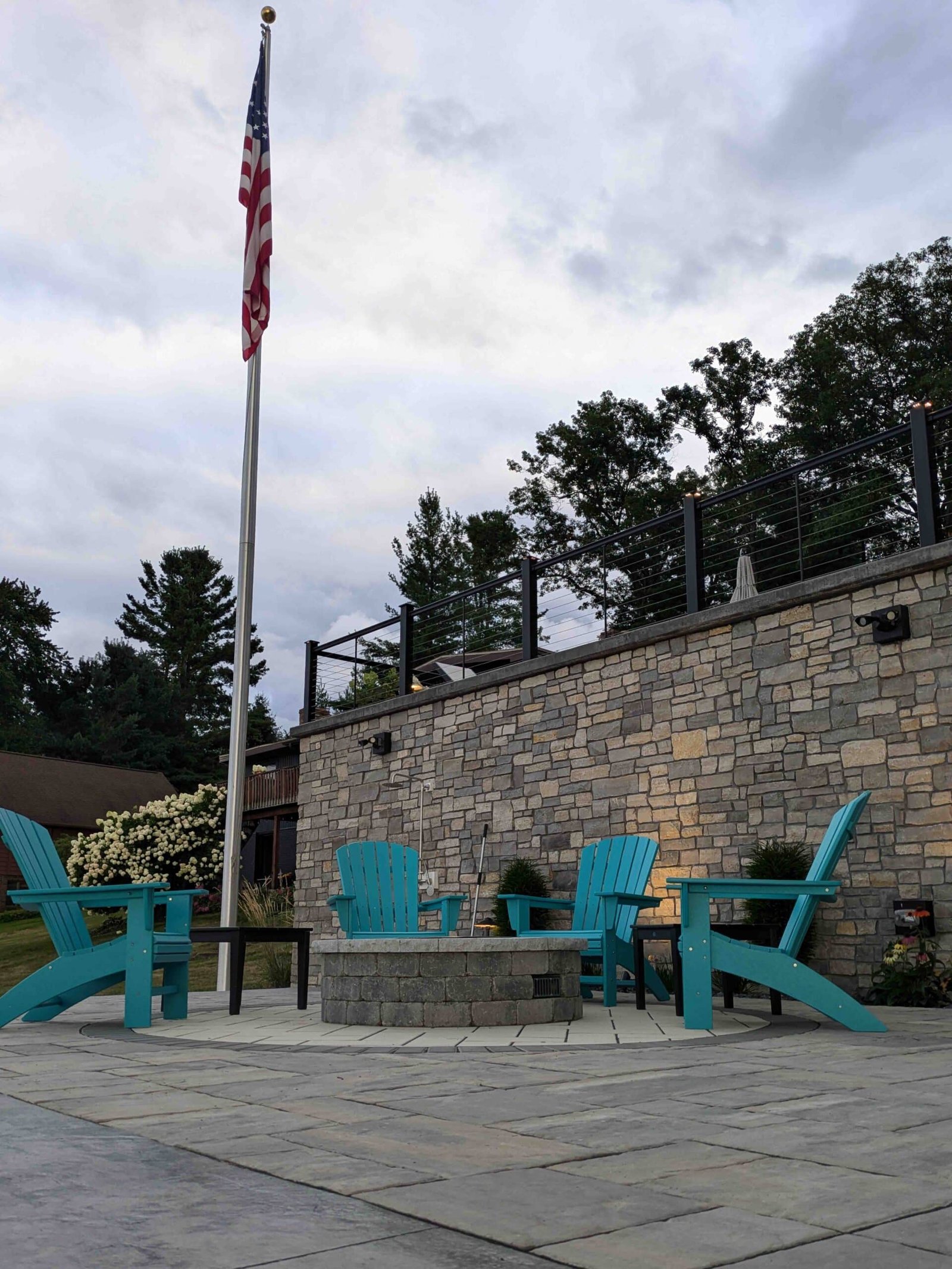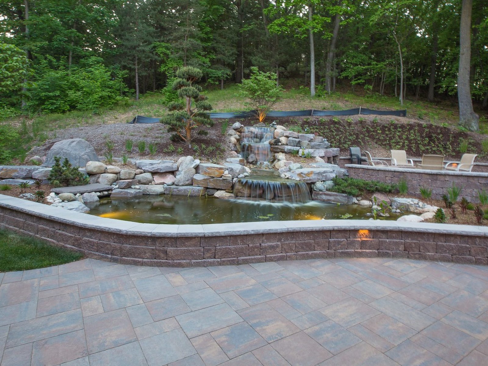 The property was transformed with multi-tiered stone retaining walls, expansive paver patios, a pool, modern railings, lush plantings, a fire pit area, and integrated beach access—creating a stunning, resort-style lakefront retreat.
