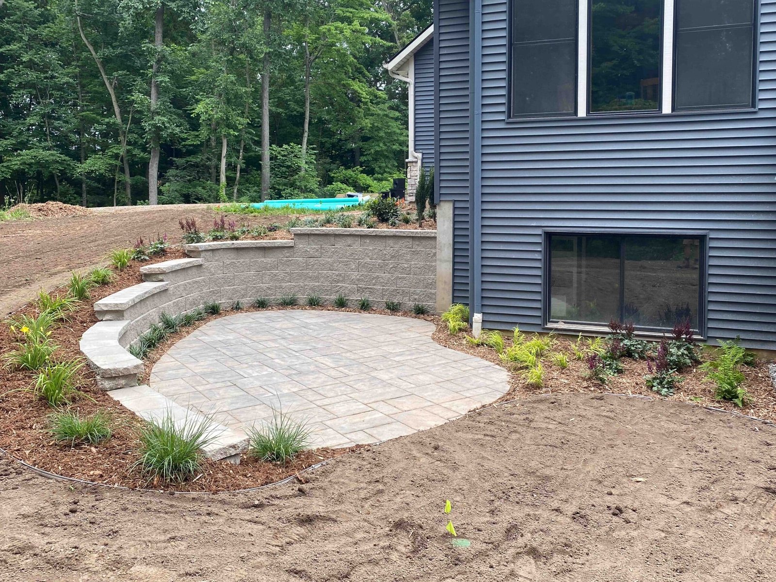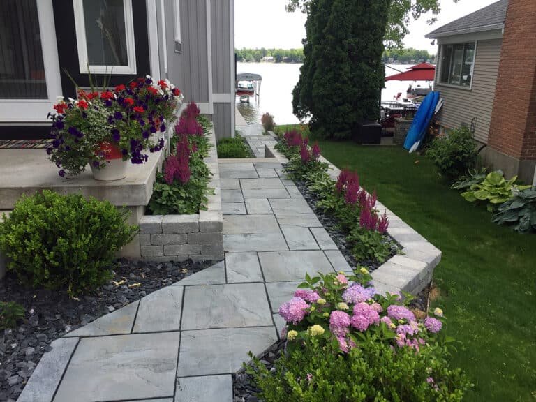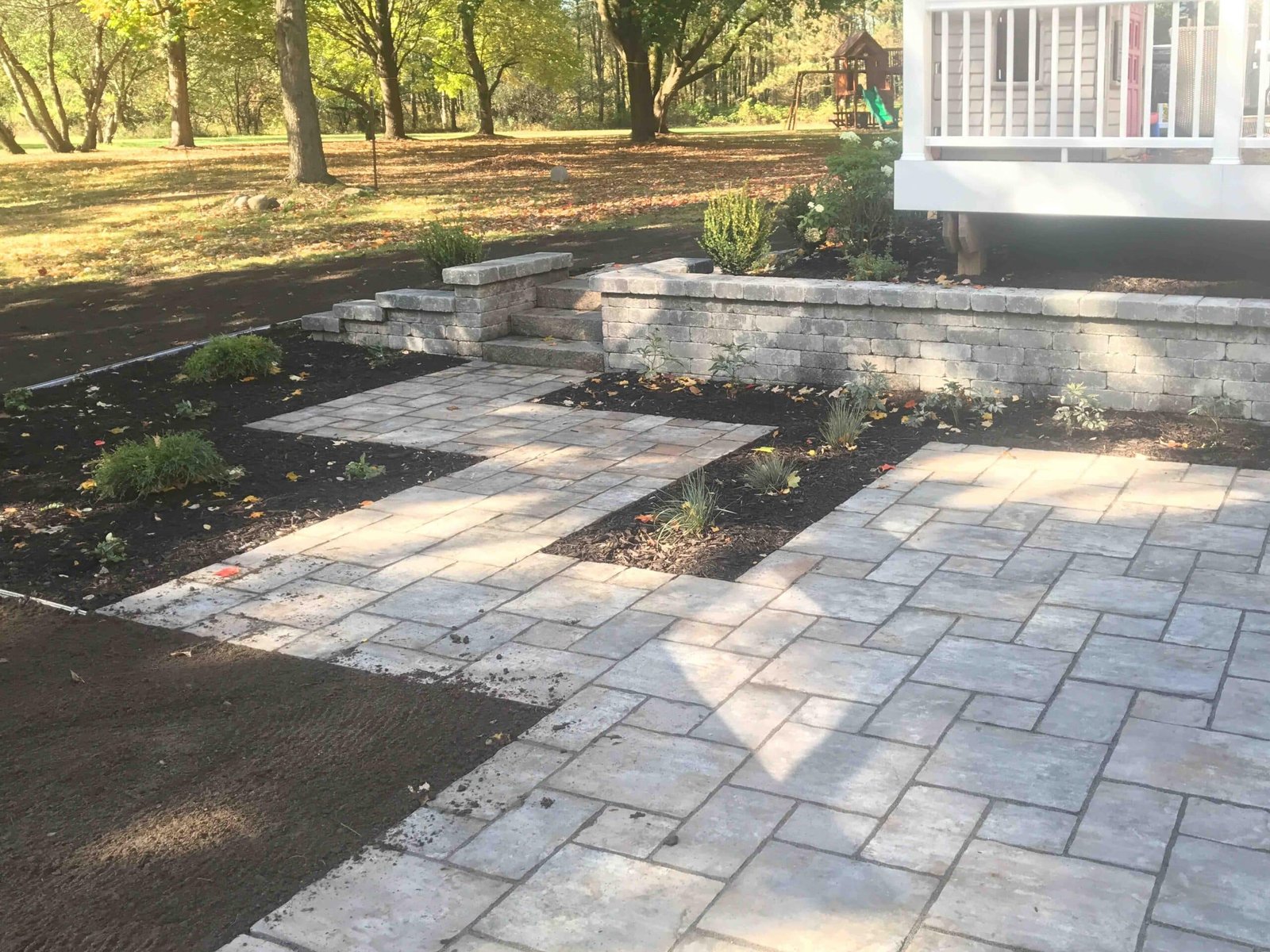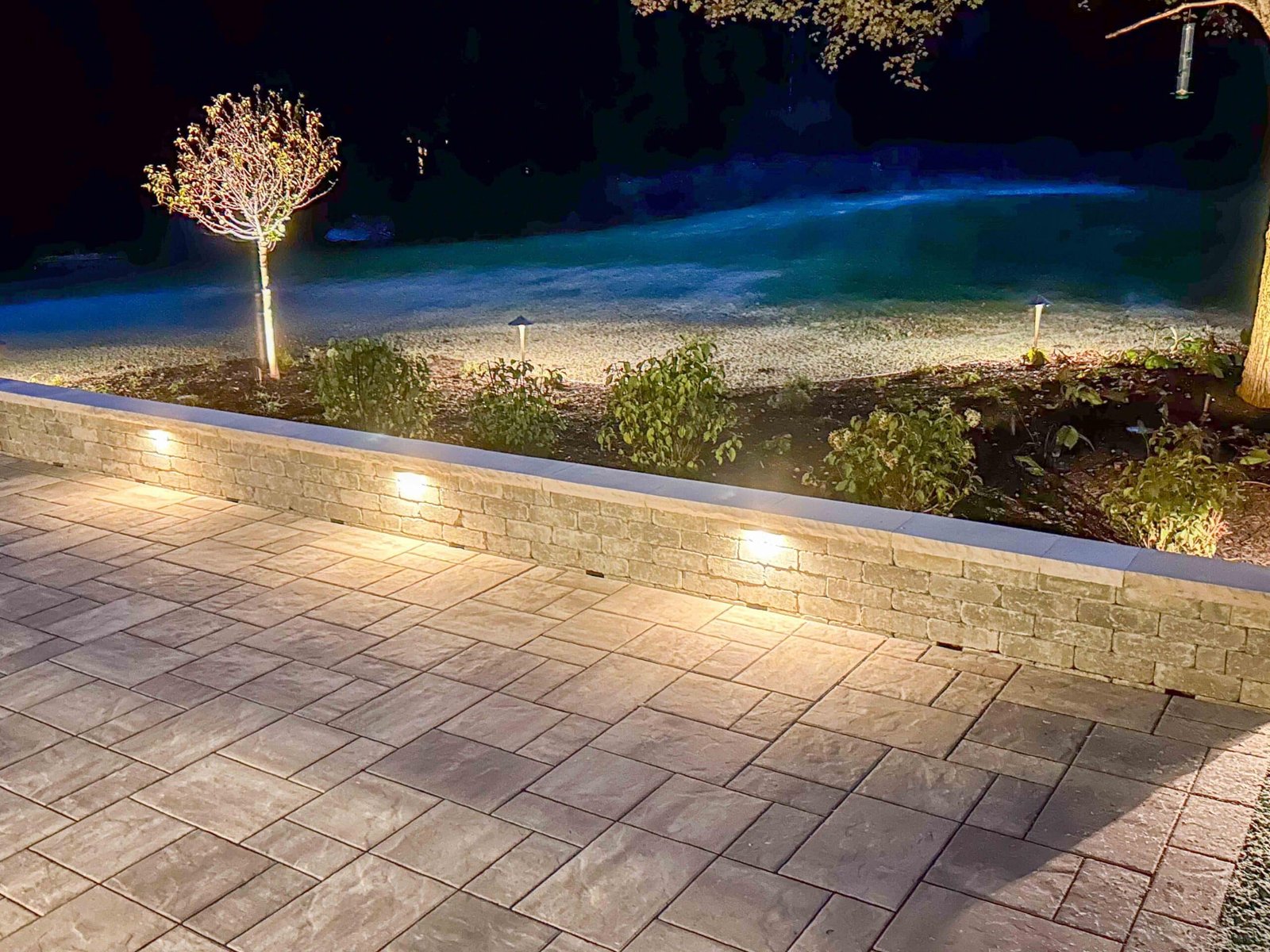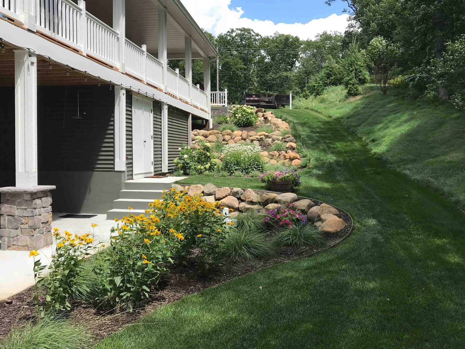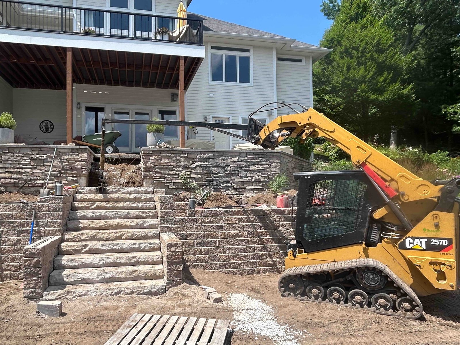 The property was transformed with multi-tiered stone retaining walls, expansive paver patios, a pool, modern railings, lush plantings, a fire pit area, and integrated beach access—creating a stunning, resort-style lakefront retreat.