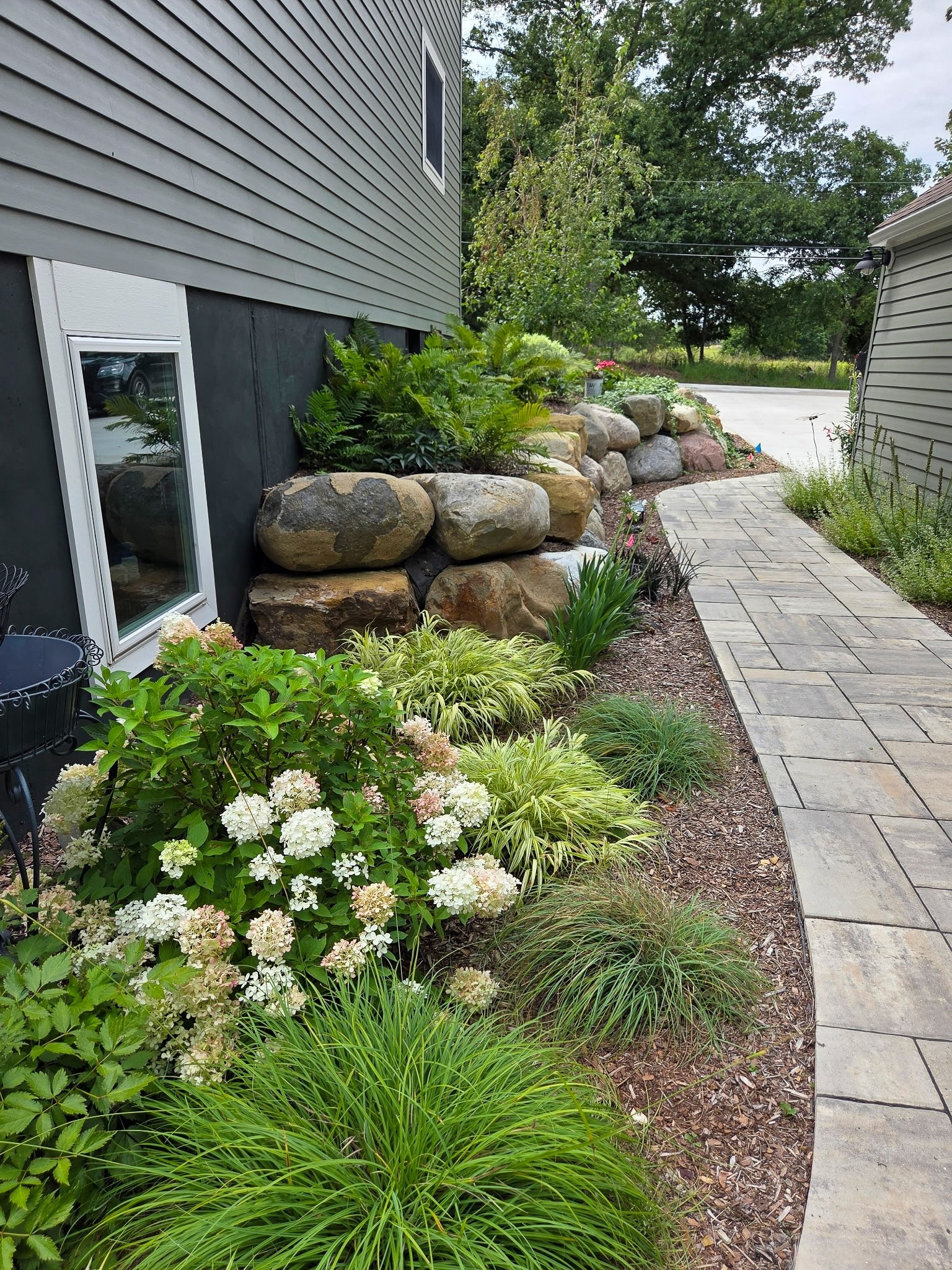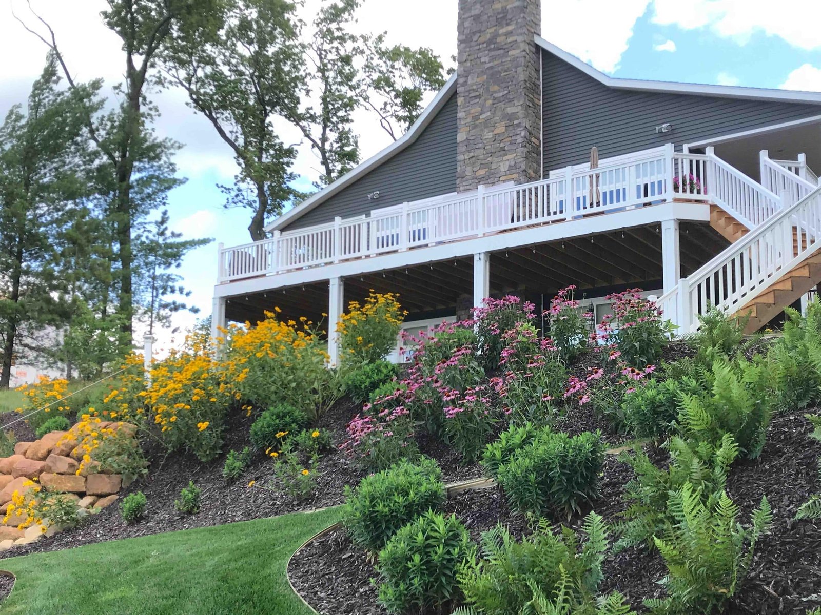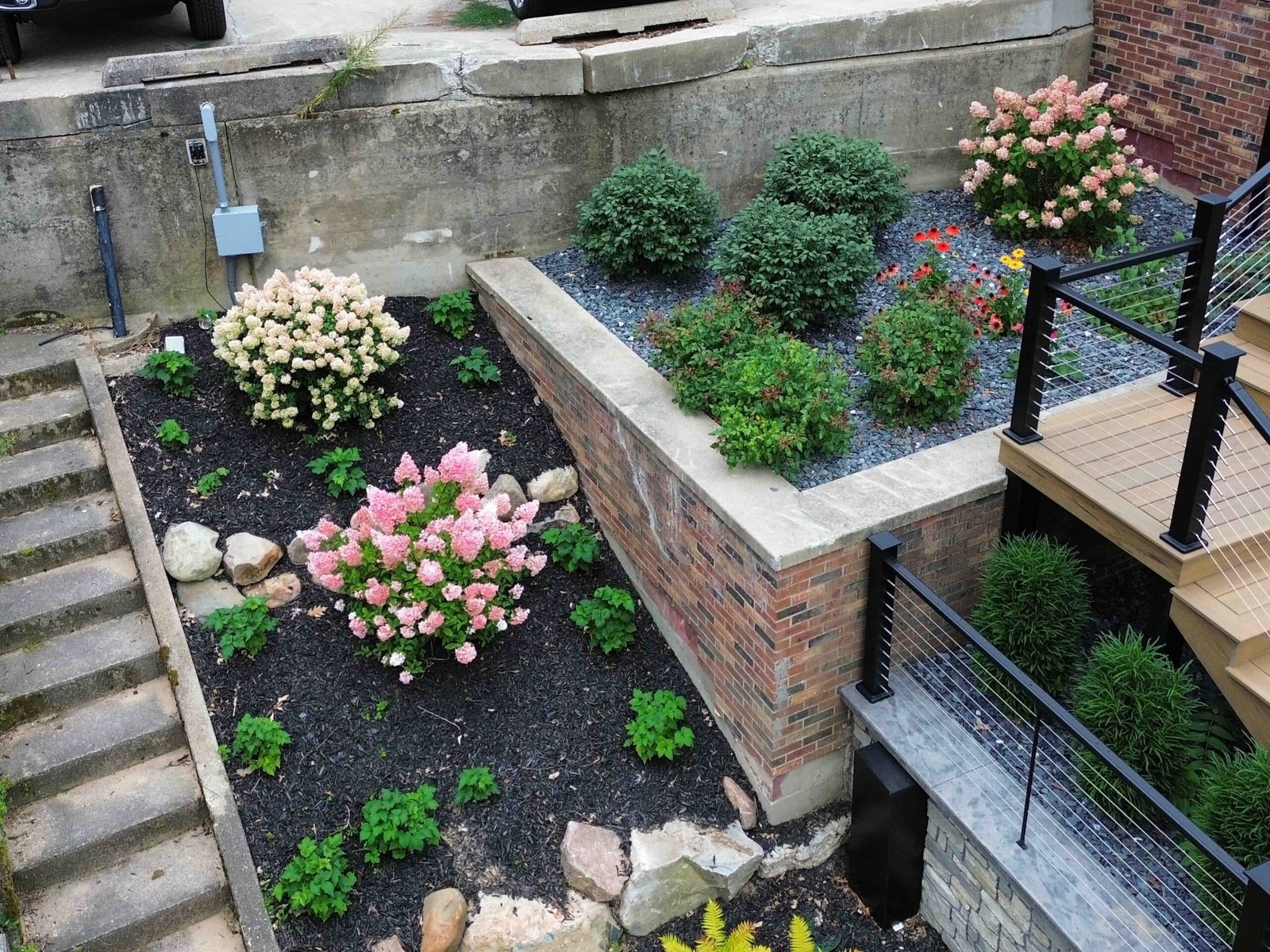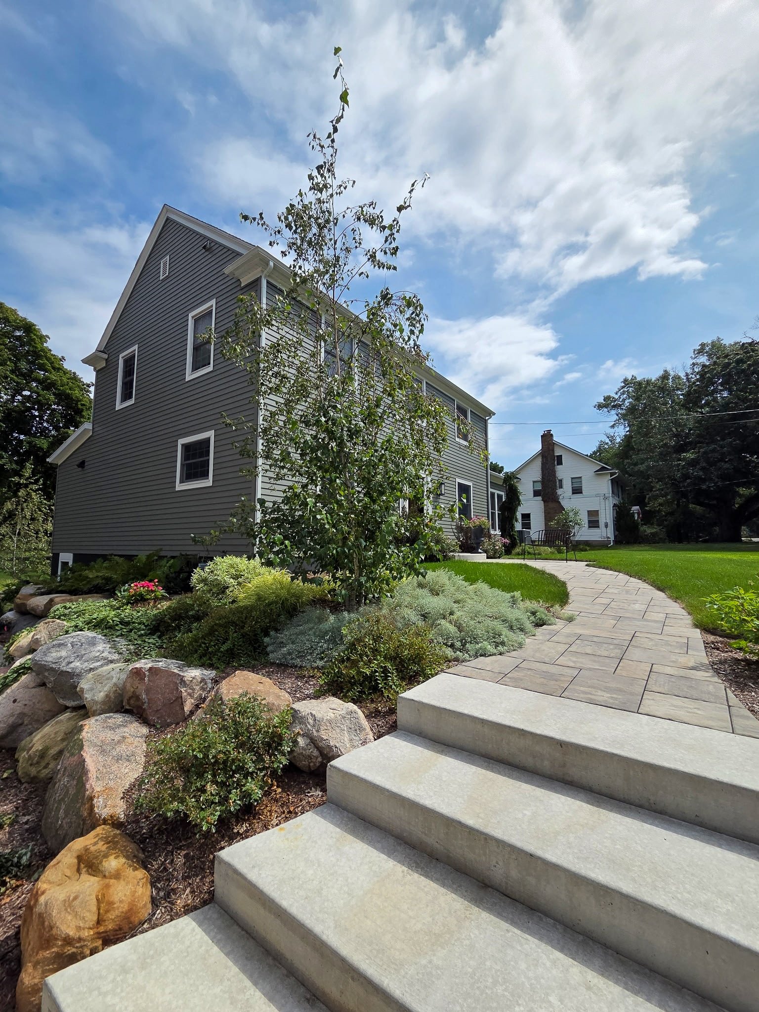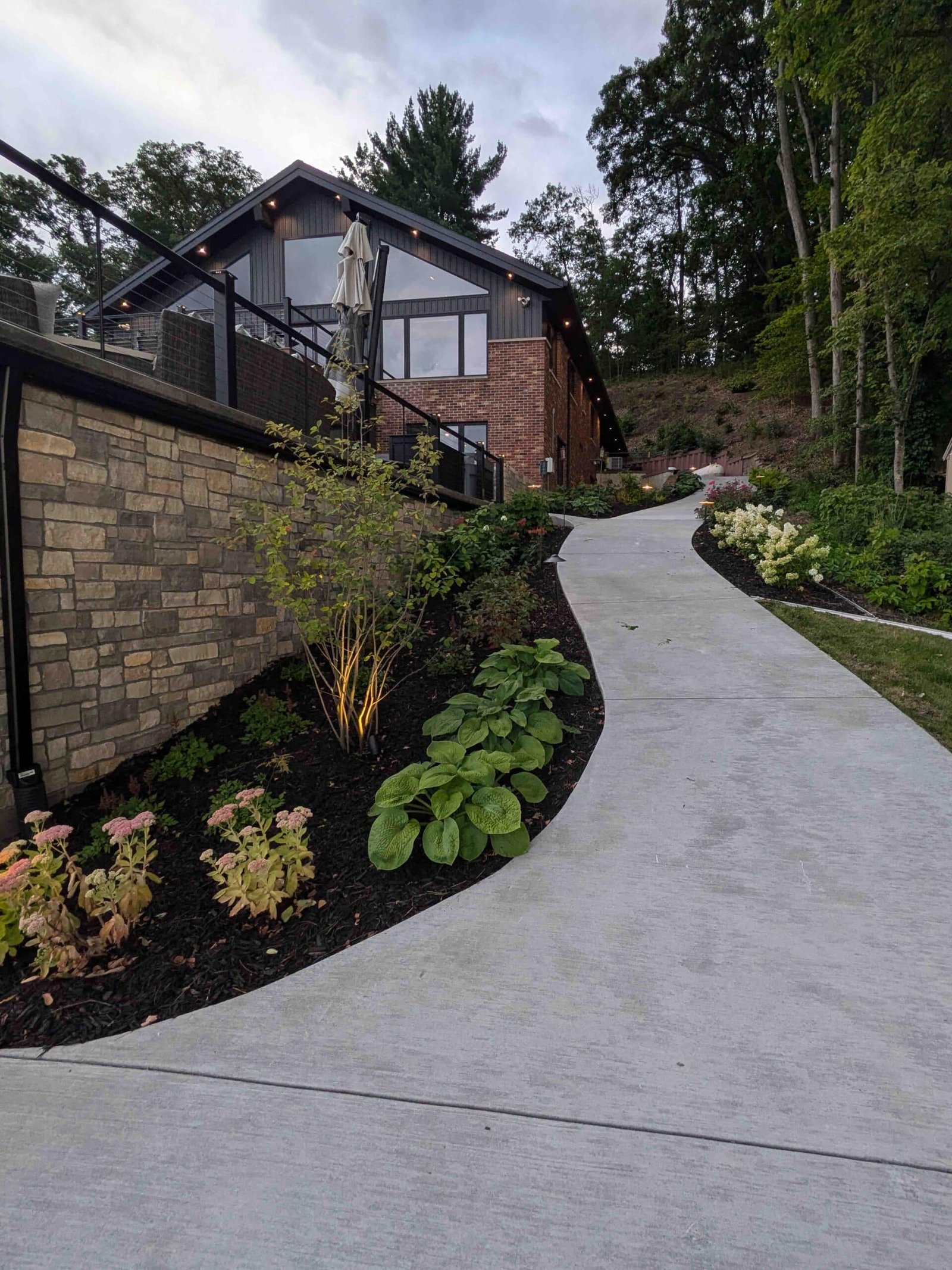 The property was transformed with multi-tiered stone retaining walls, expansive paver patios, a pool, modern railings, lush plantings, a fire pit area, and integrated beach access—creating a stunning, resort-style lakefront retreat.