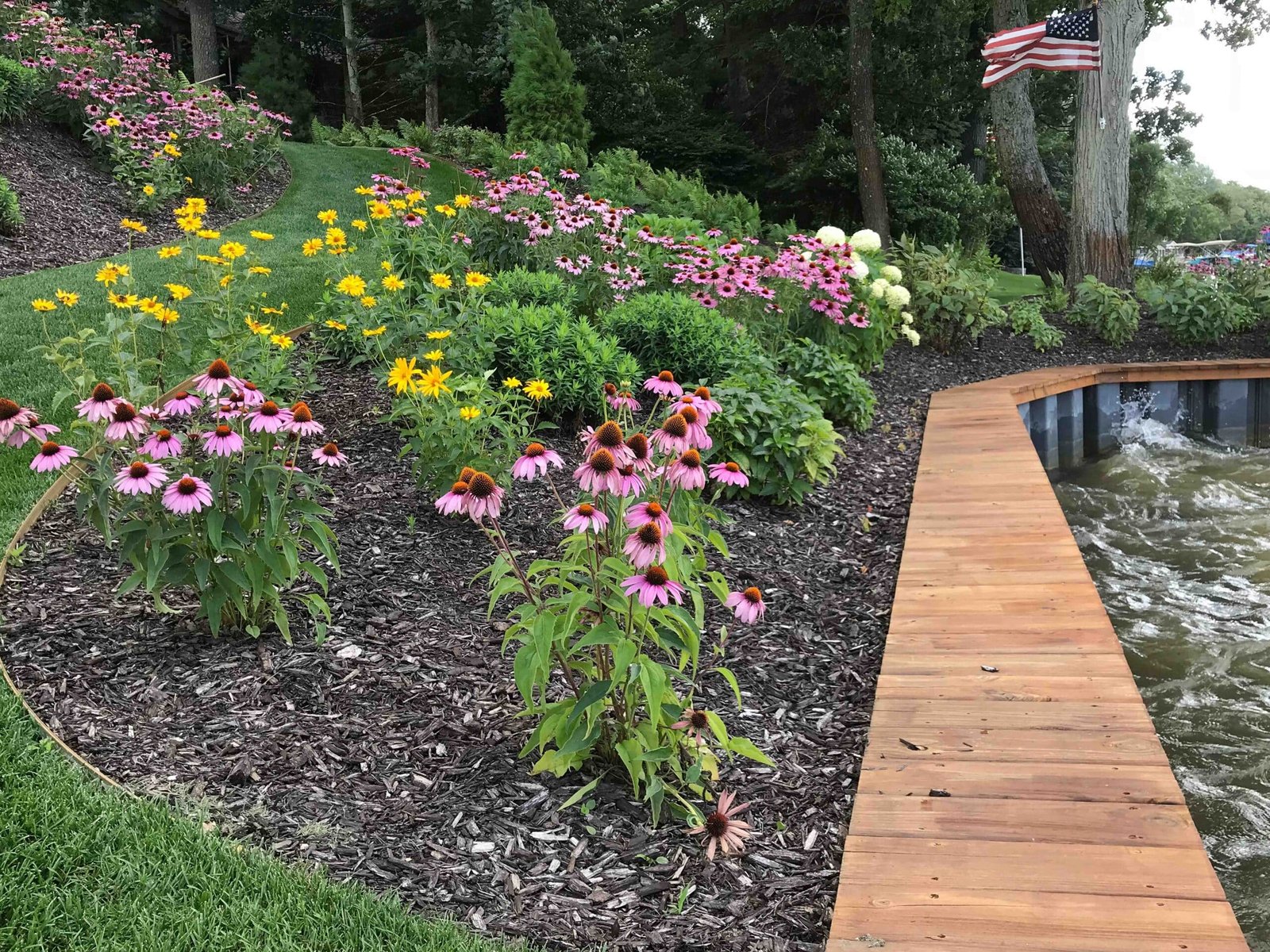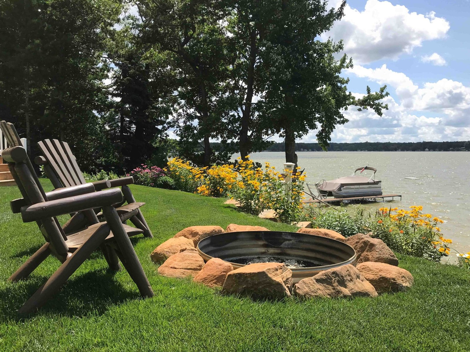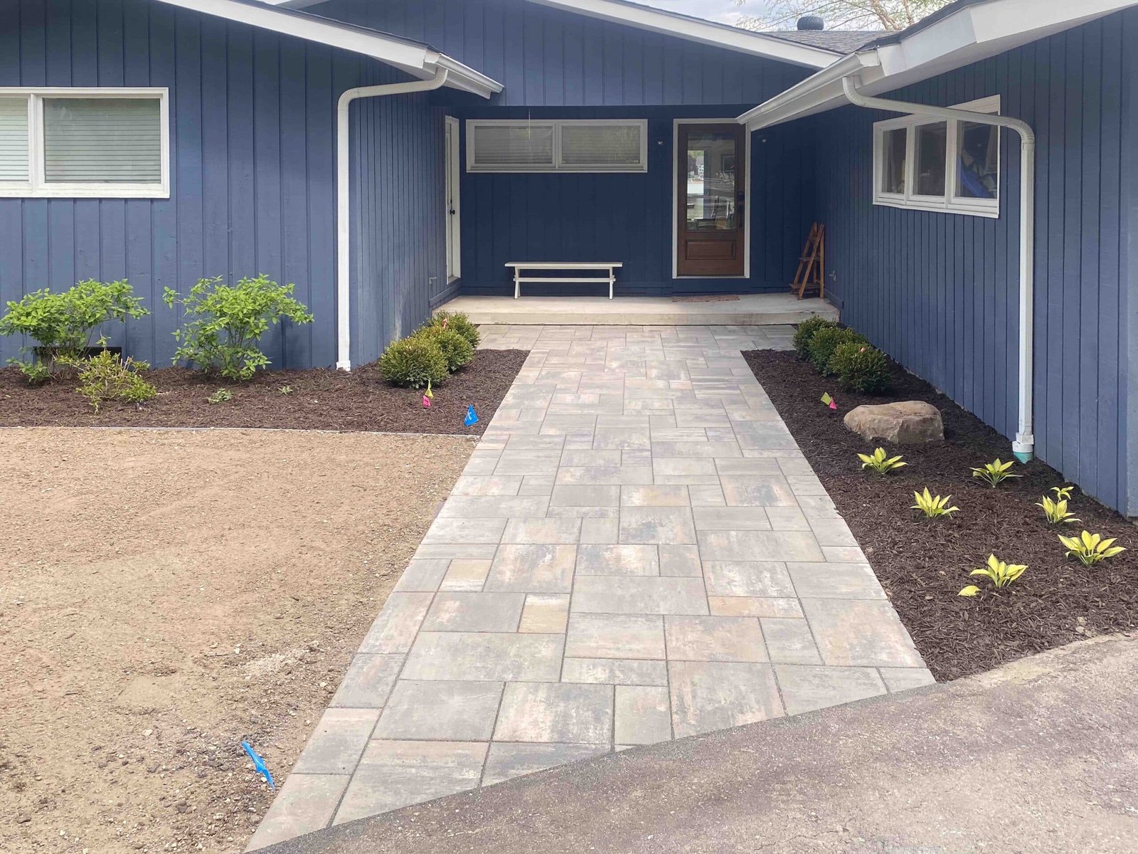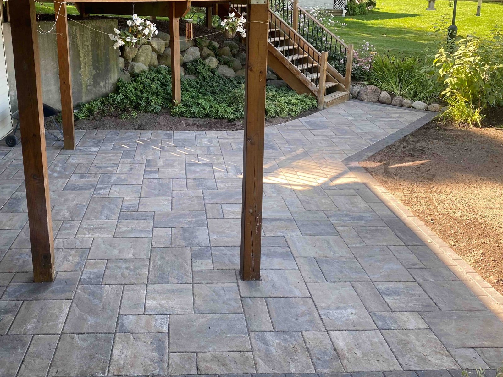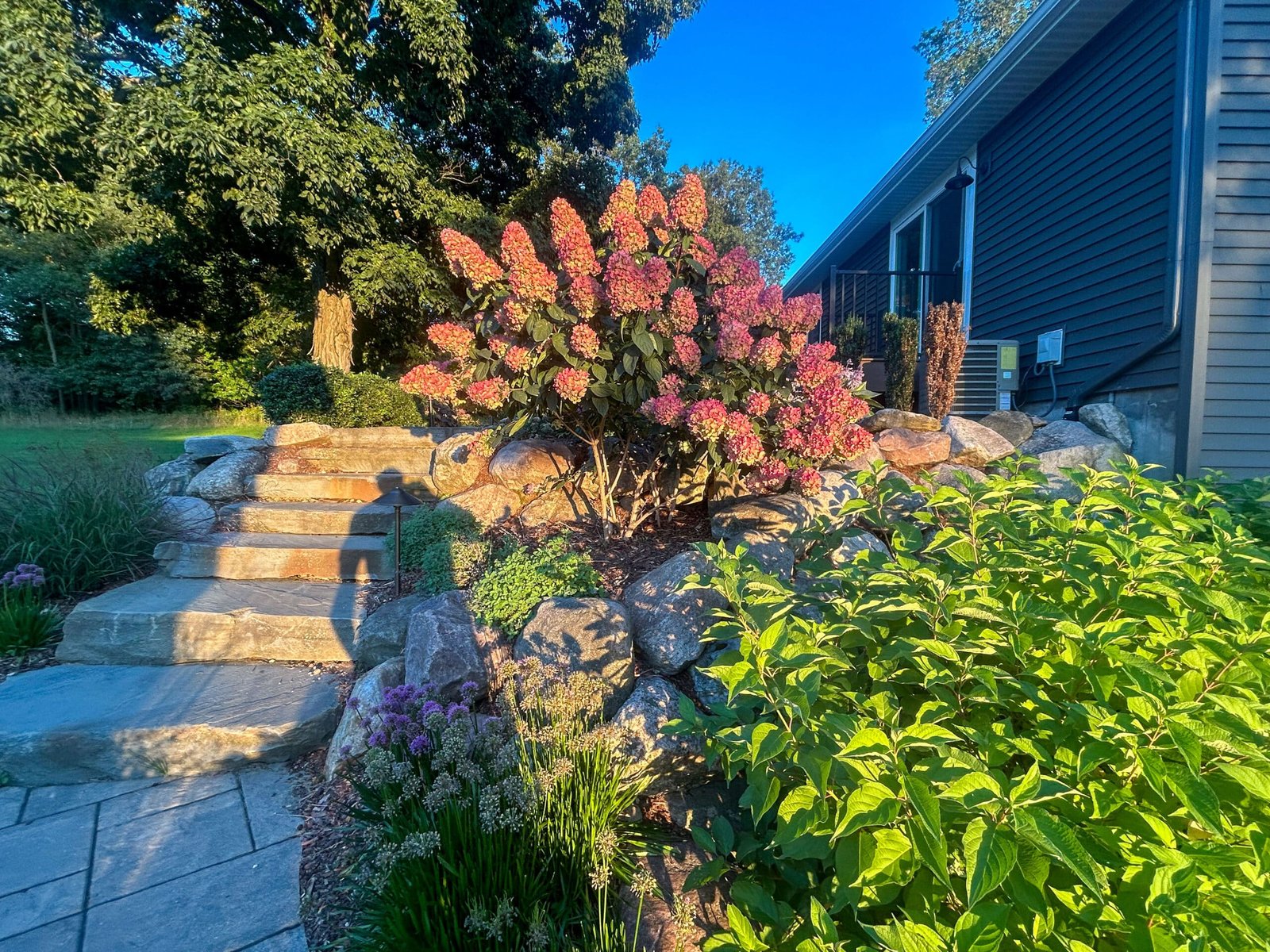 The property was transformed with multi-tiered stone retaining walls, expansive paver patios, a pool, modern railings, lush plantings, a fire pit area, and integrated beach access—creating a stunning, resort-style lakefront retreat.