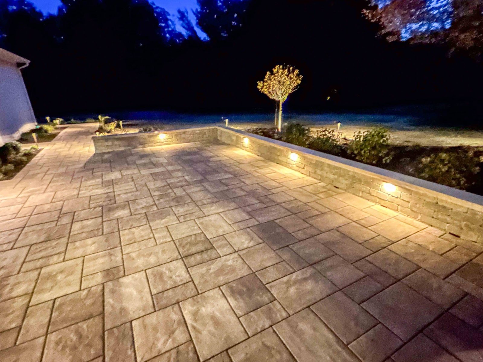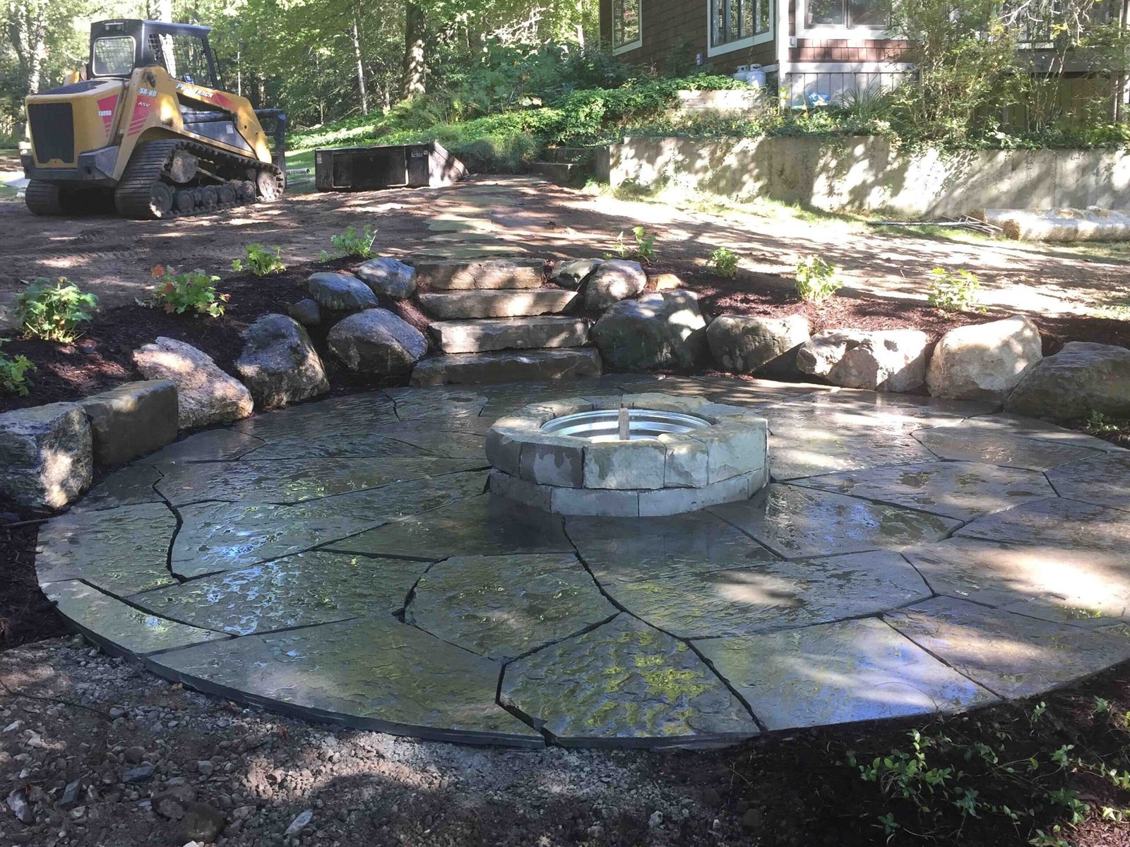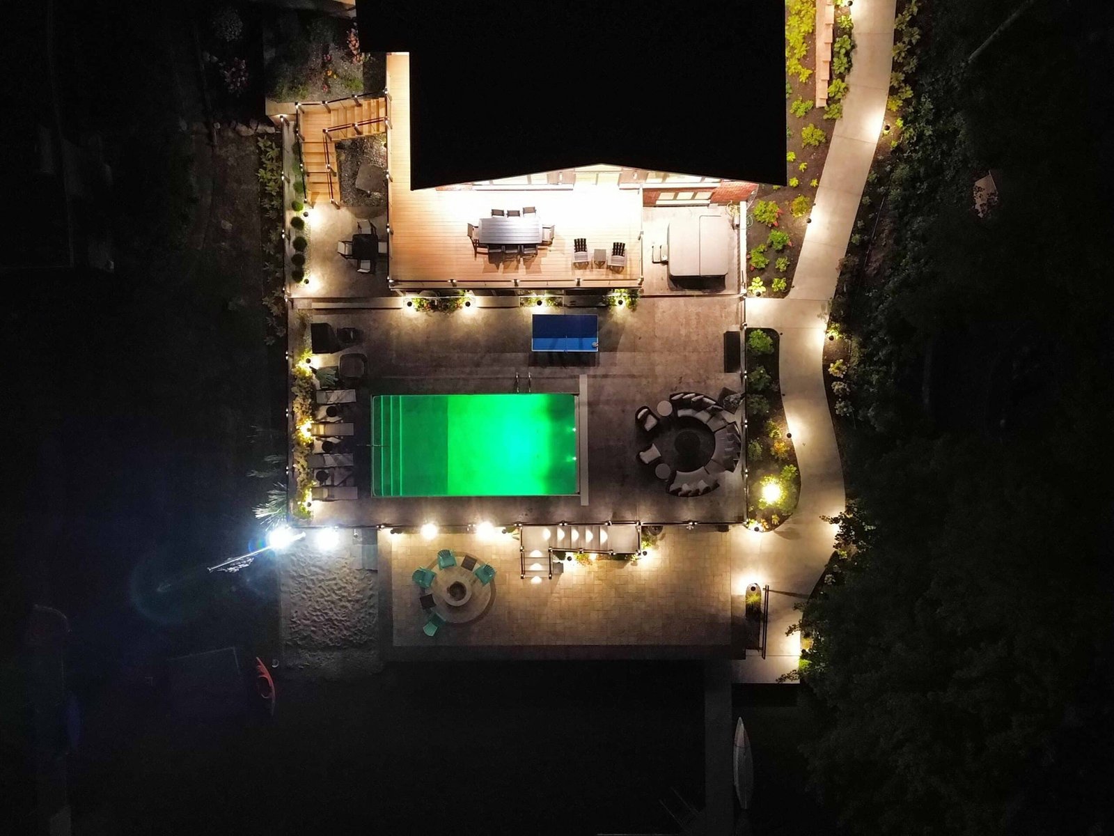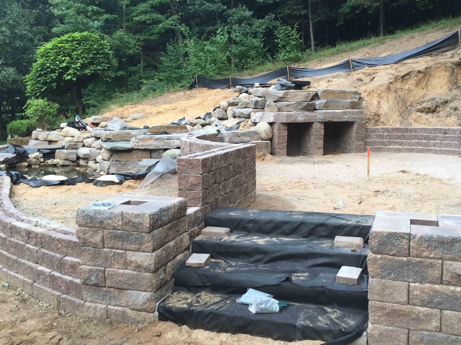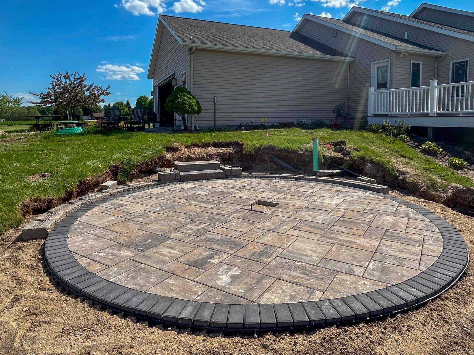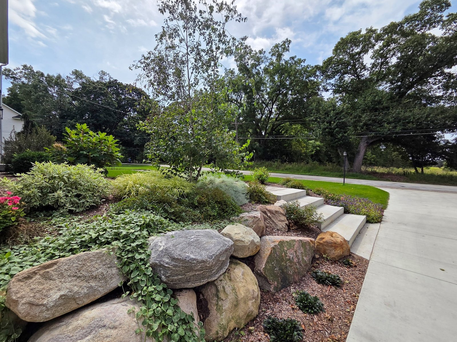 The property was transformed with multi-tiered stone retaining walls, expansive paver patios, a pool, modern railings, lush plantings, a fire pit area, and integrated beach access—creating a stunning, resort-style lakefront retreat.