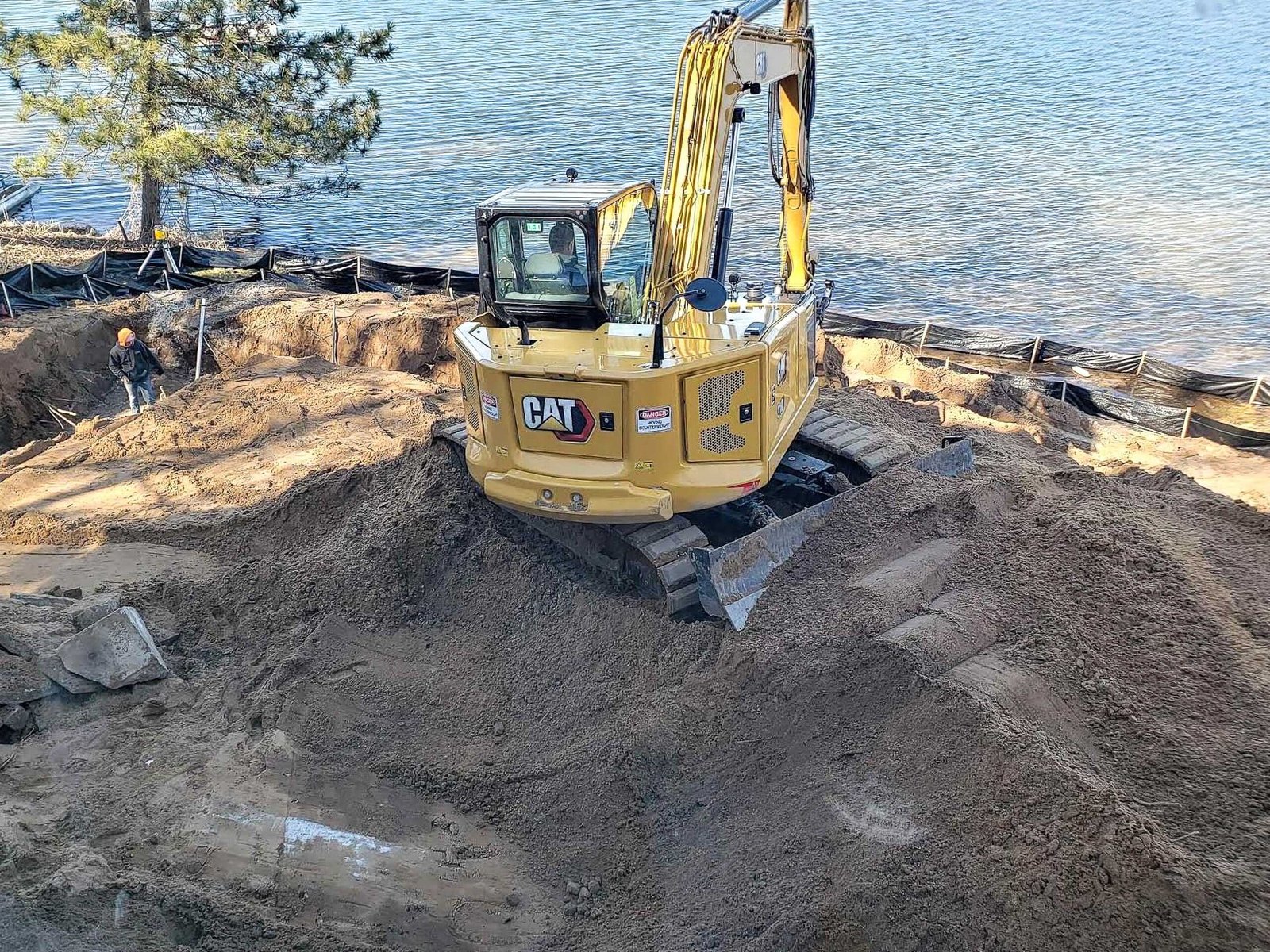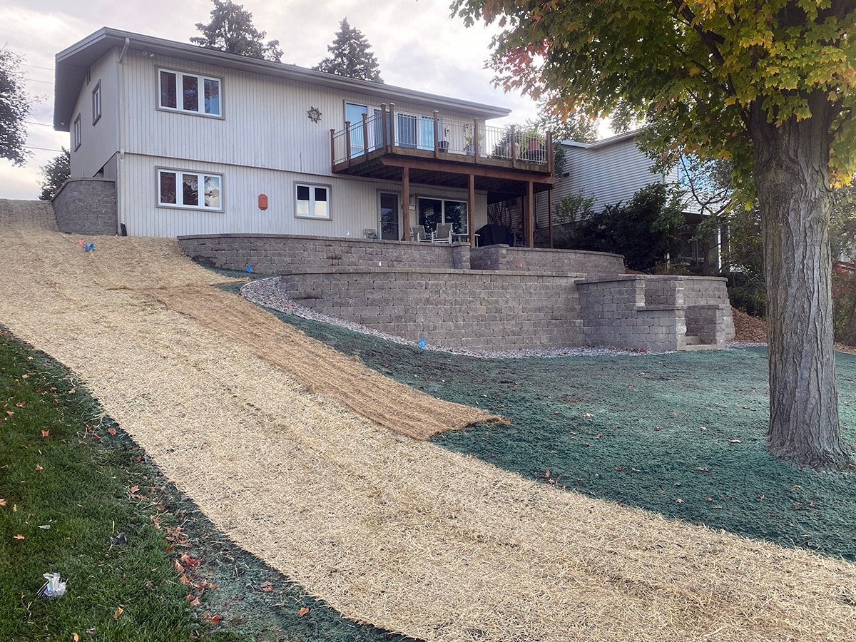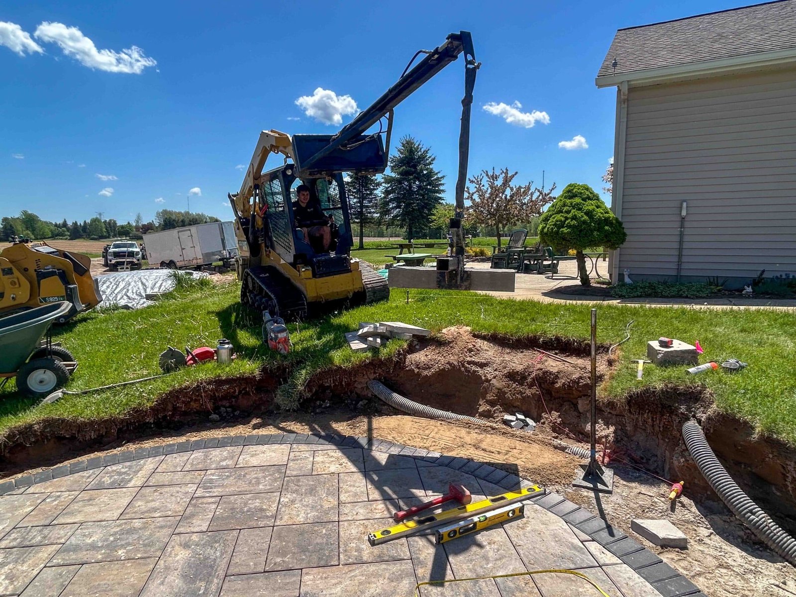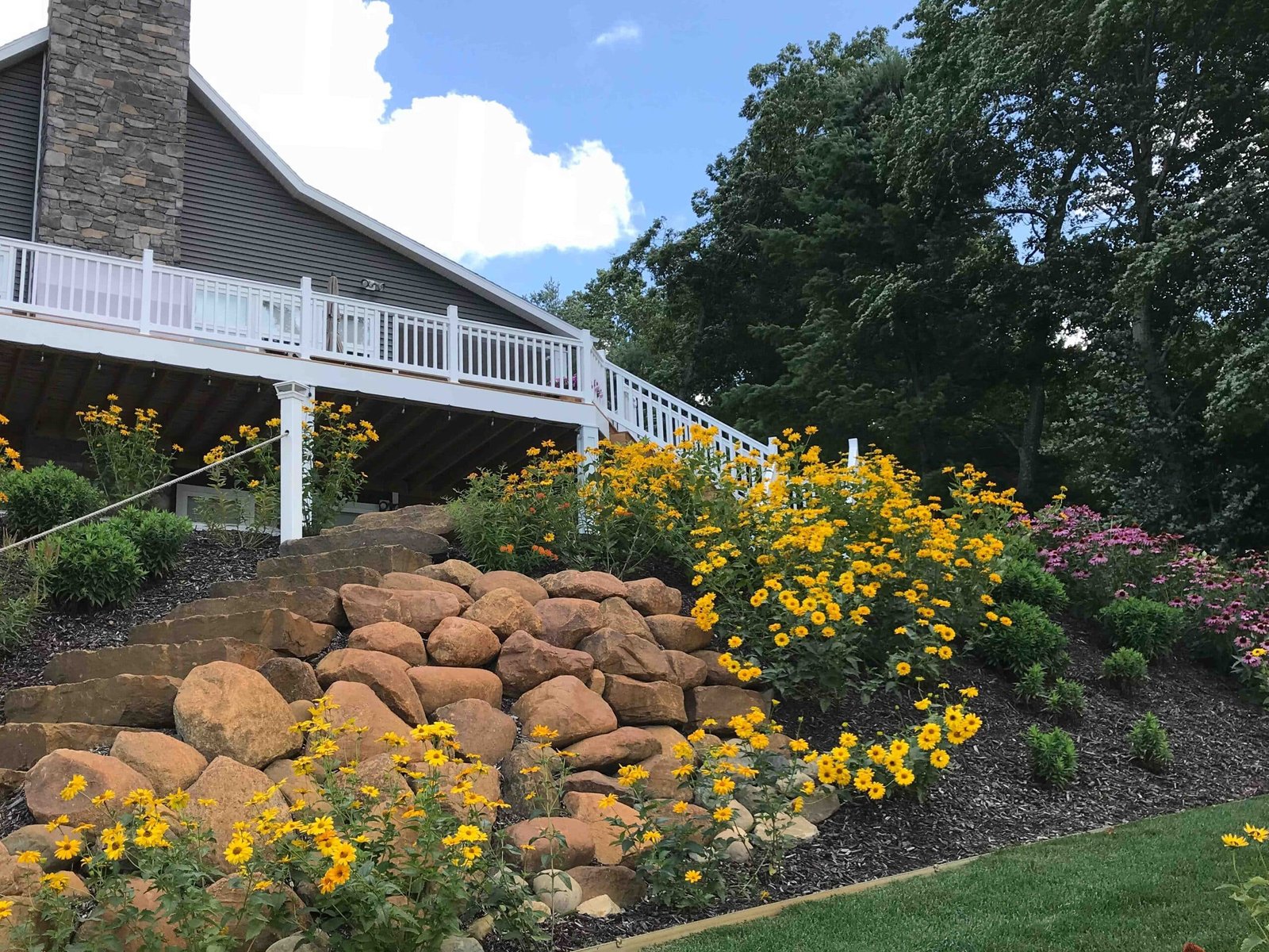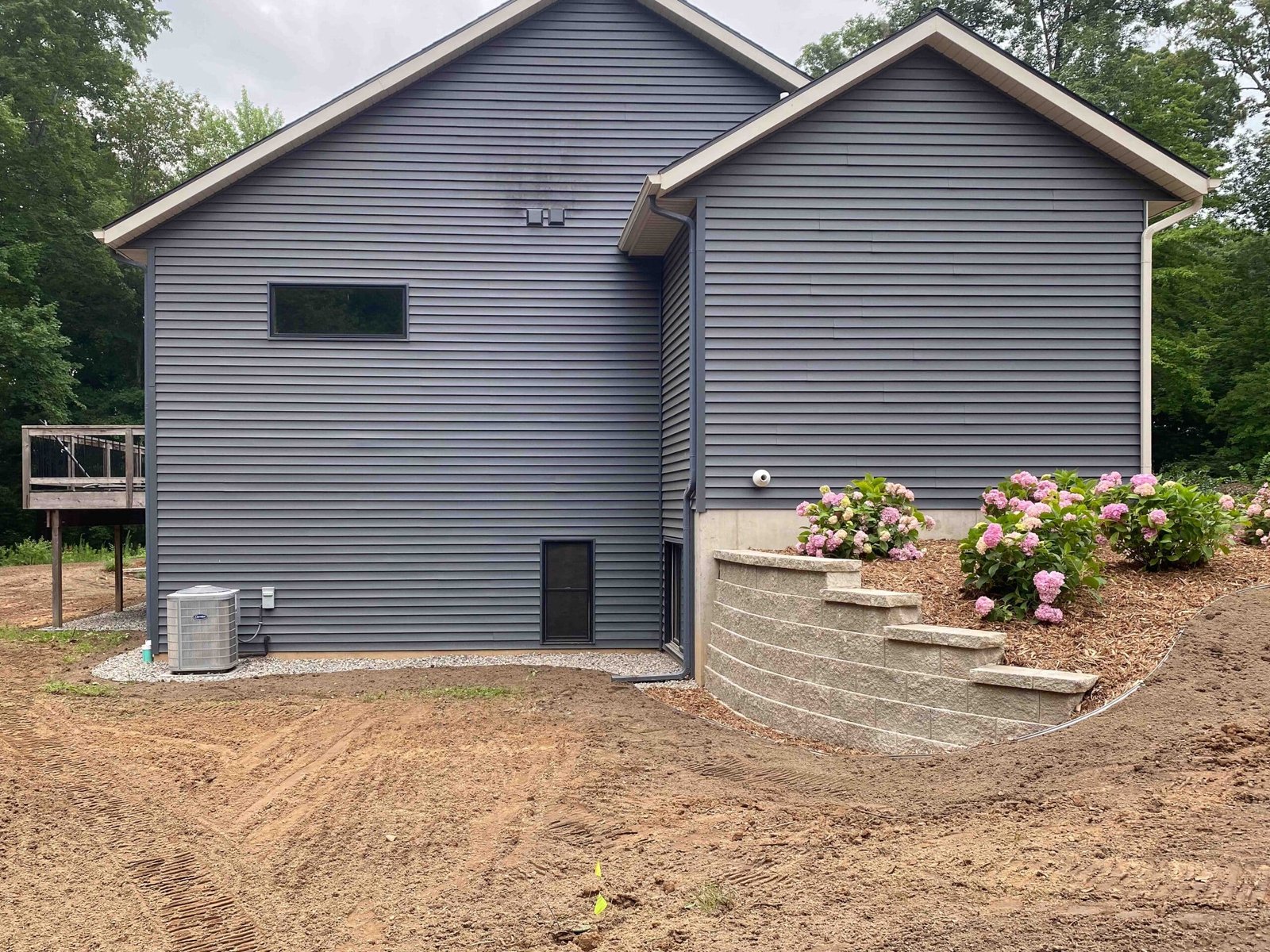 The property was transformed with multi-tiered stone retaining walls, expansive paver patios, a pool, modern railings, lush plantings, a fire pit area, and integrated beach access—creating a stunning, resort-style lakefront retreat.