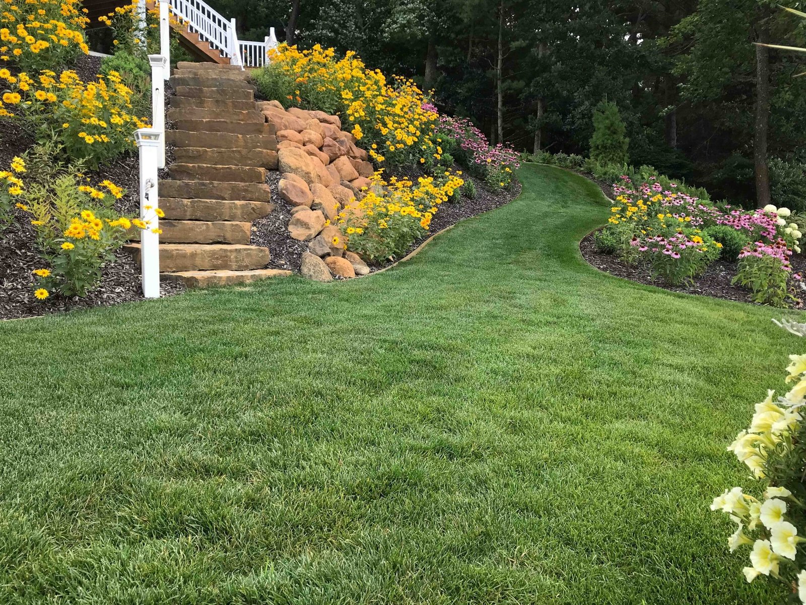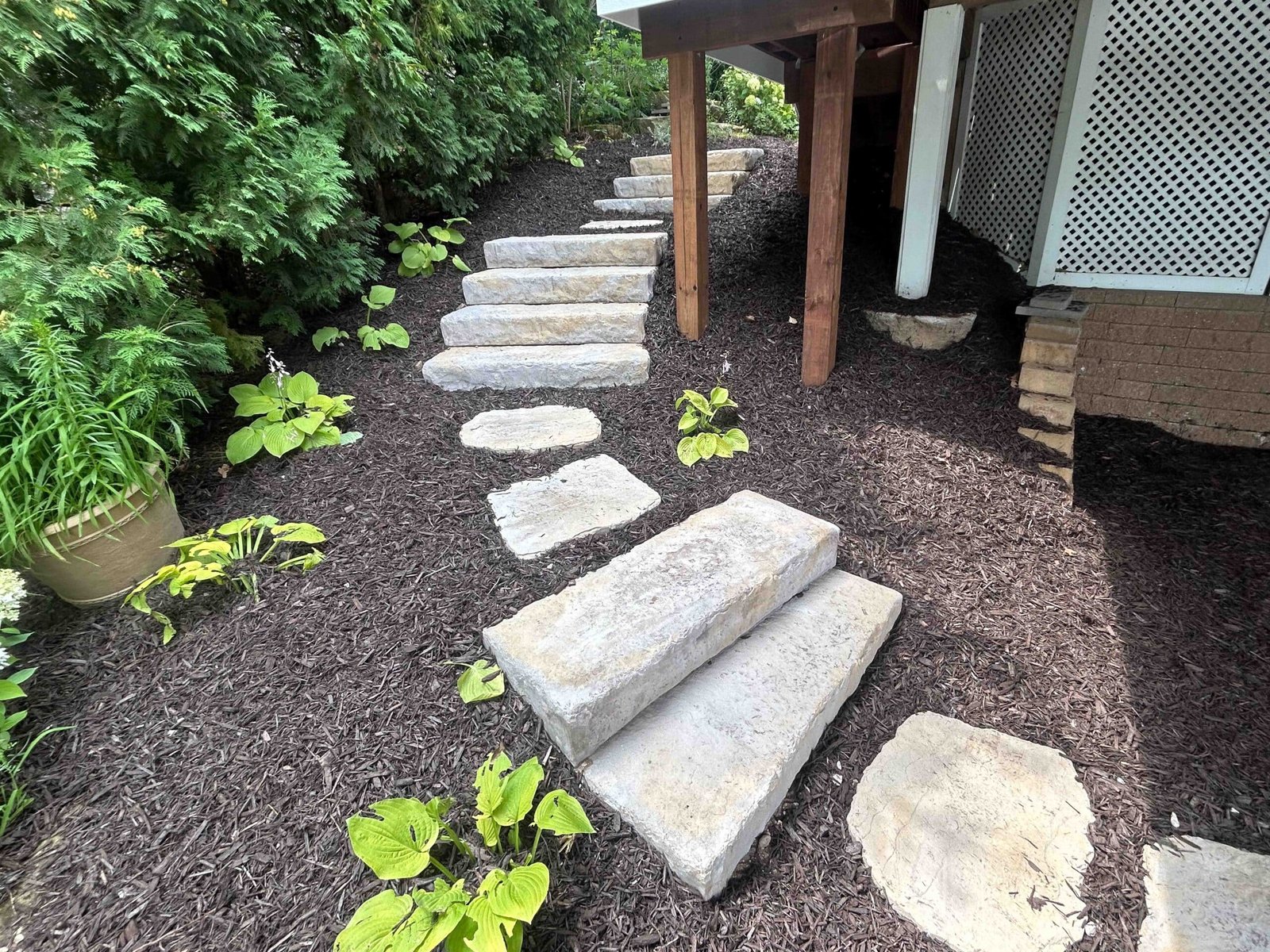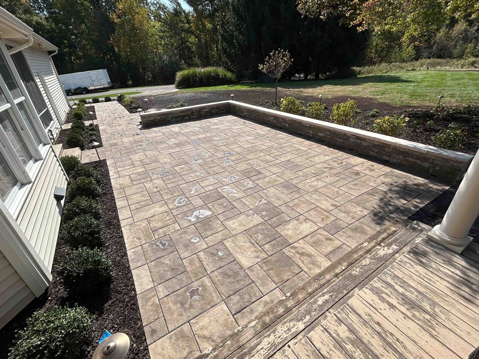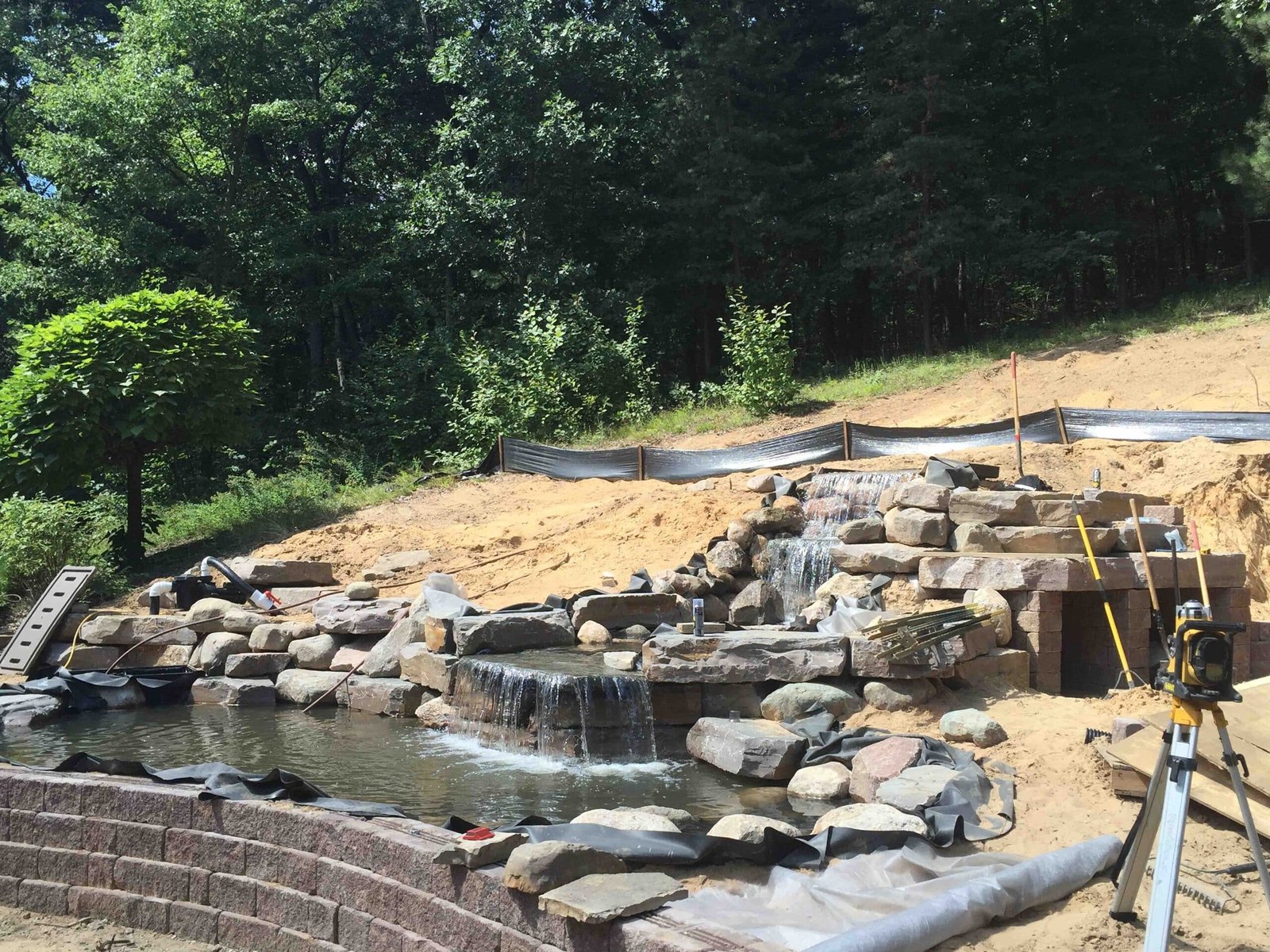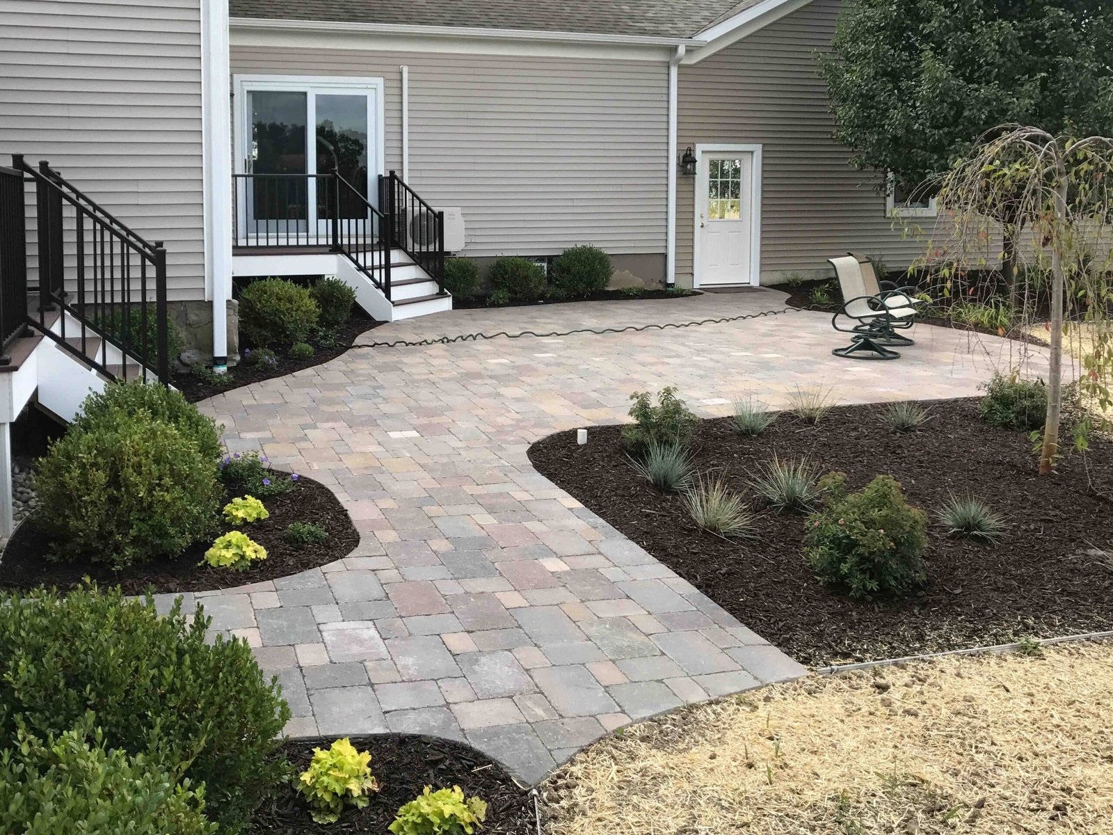 The property was transformed with multi-tiered stone retaining walls, expansive paver patios, a pool, modern railings, lush plantings, a fire pit area, and integrated beach access—creating a stunning, resort-style lakefront retreat.