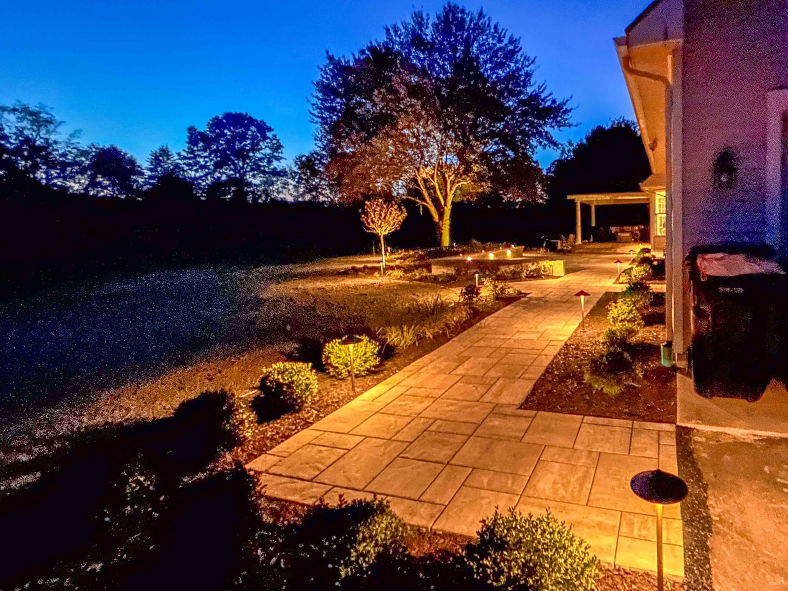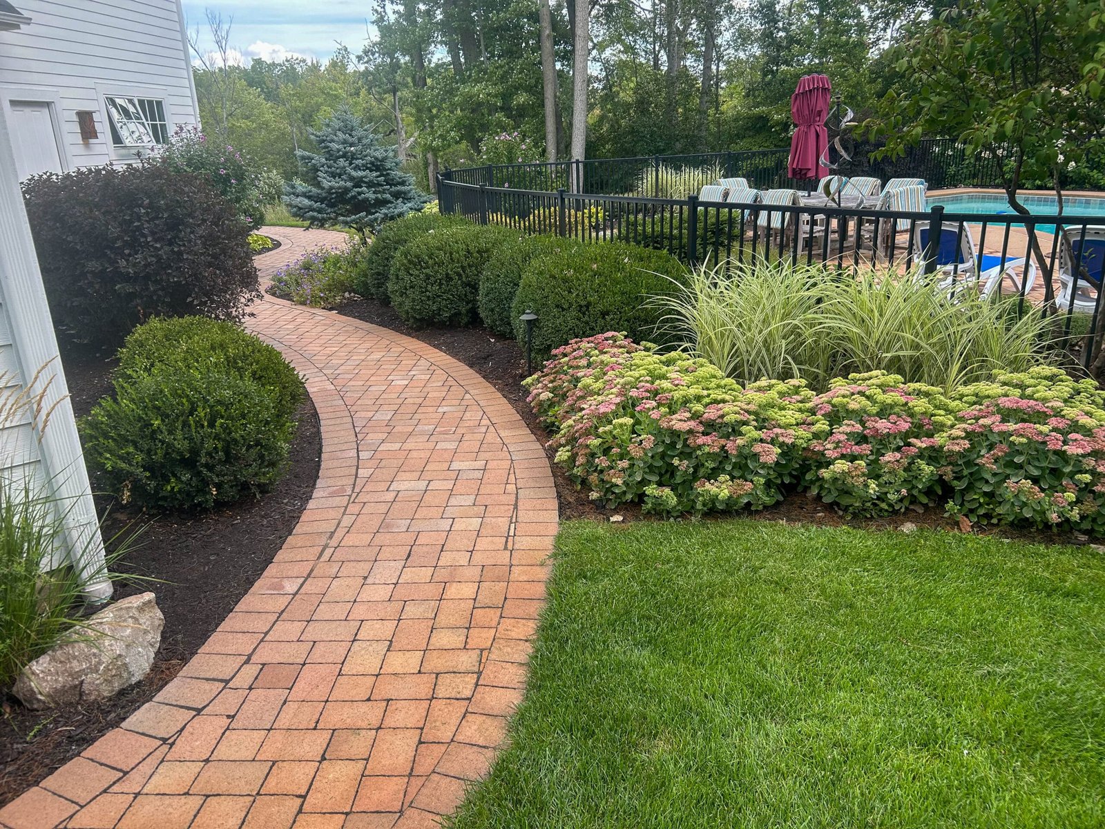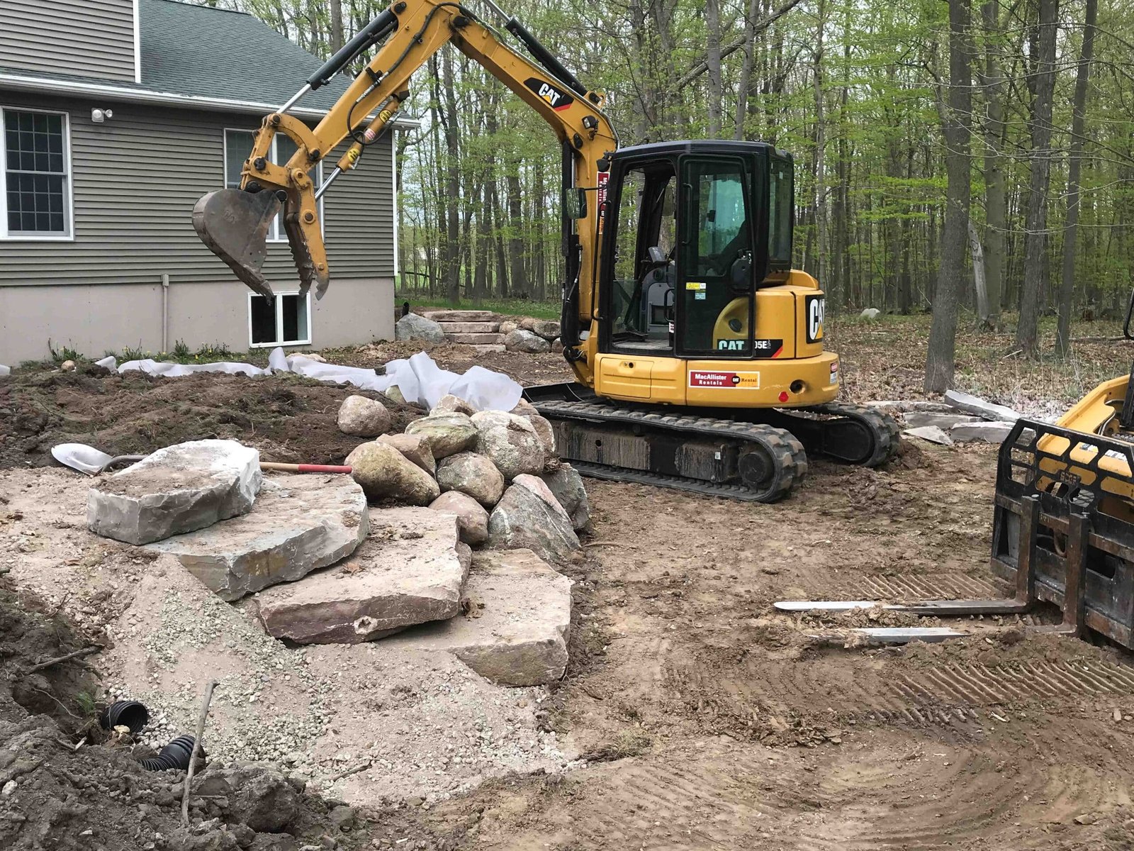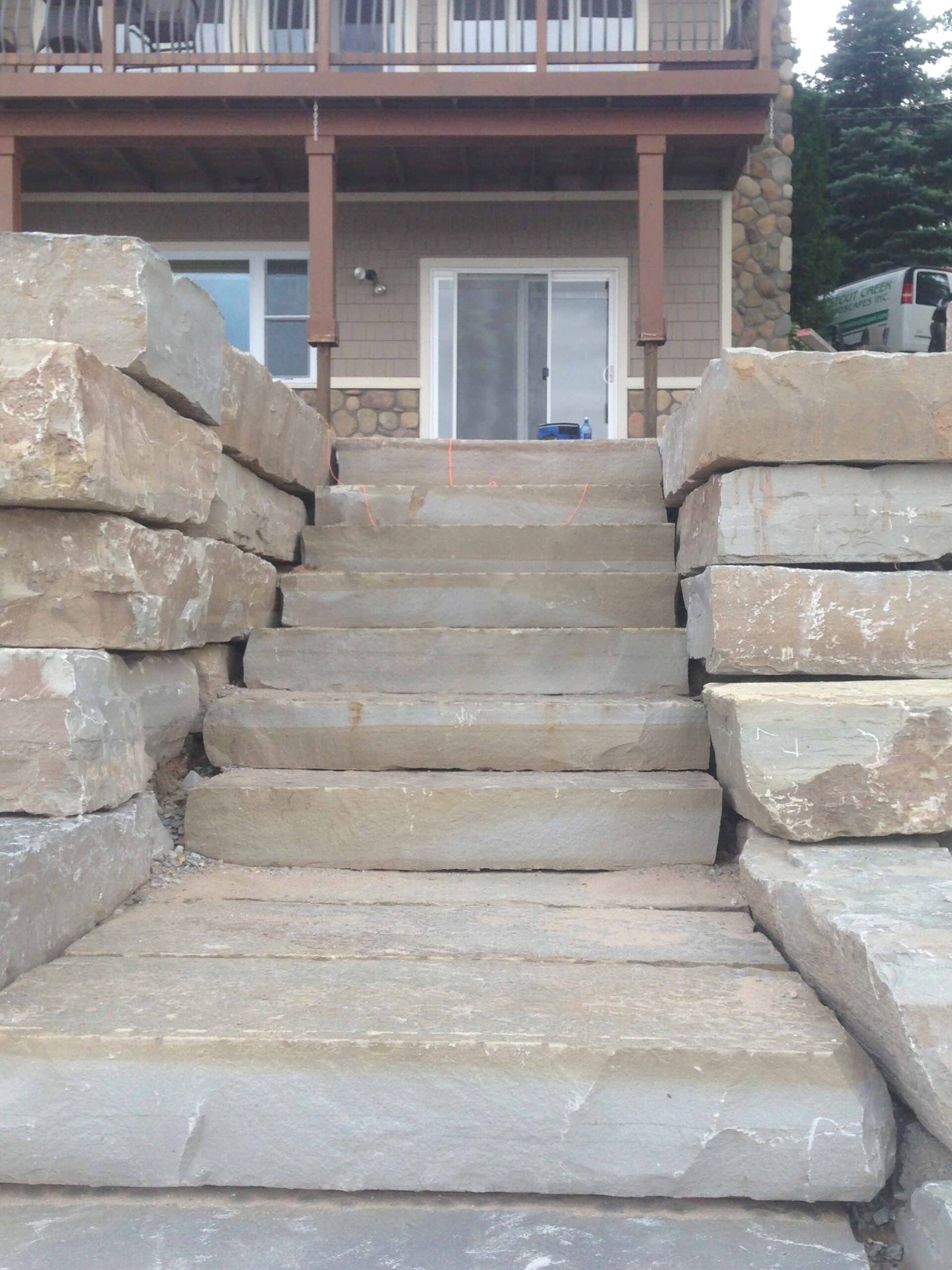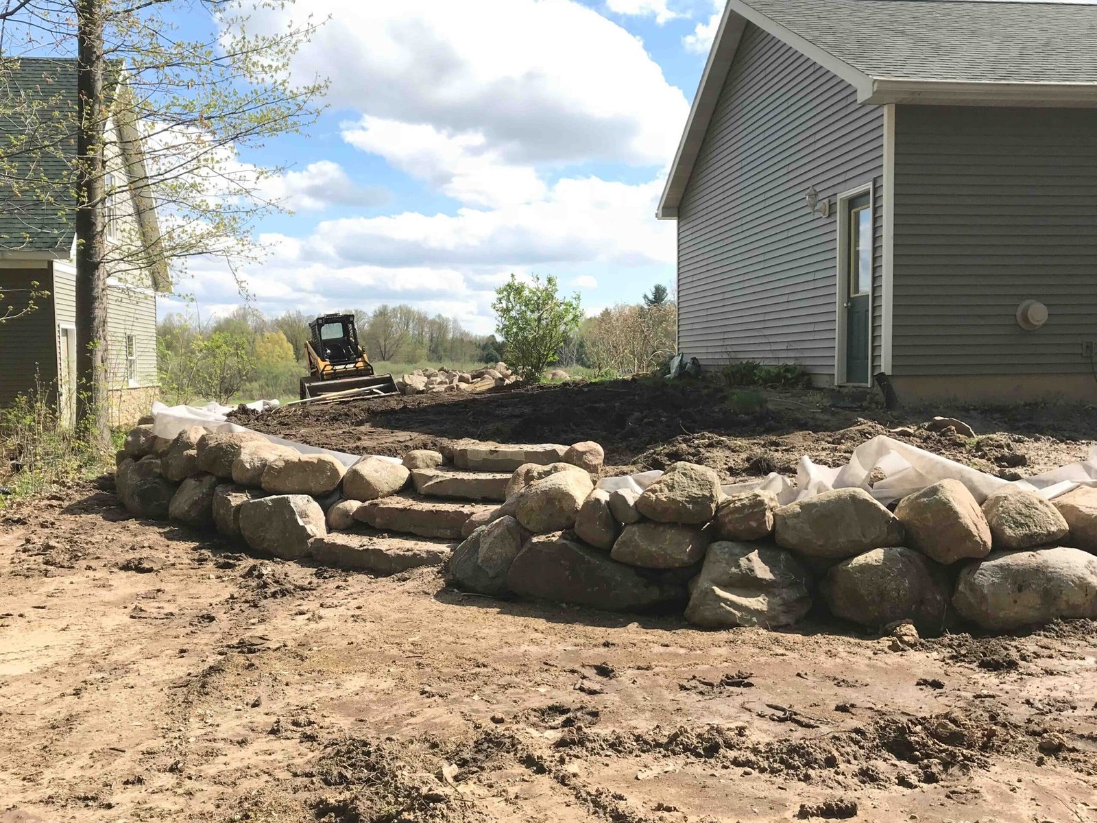 The property was transformed with multi-tiered stone retaining walls, expansive paver patios, a pool, modern railings, lush plantings, a fire pit area, and integrated beach access—creating a stunning, resort-style lakefront retreat.