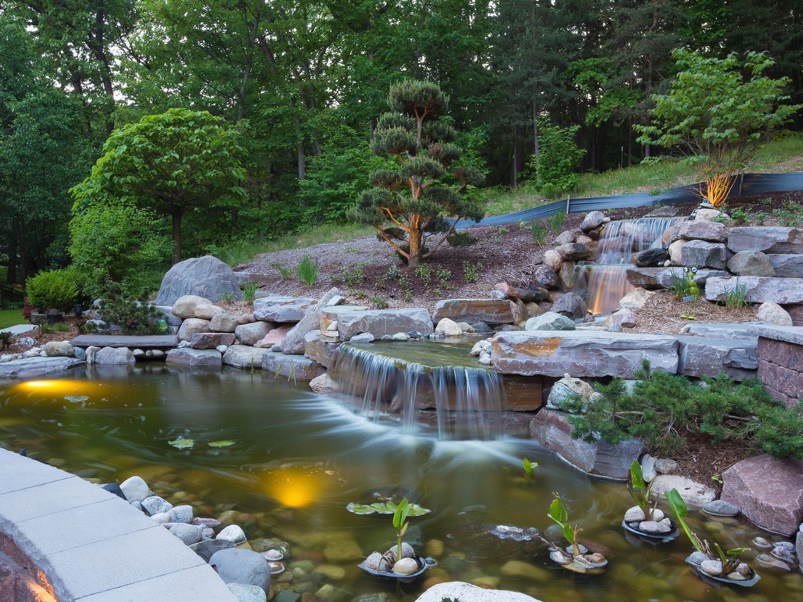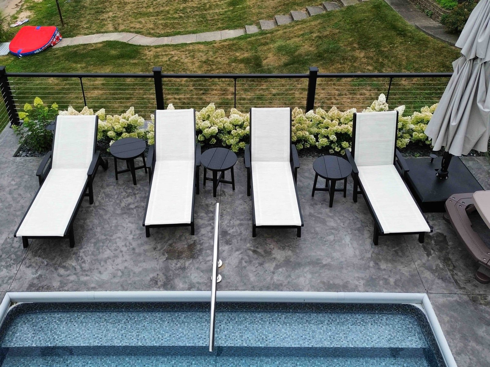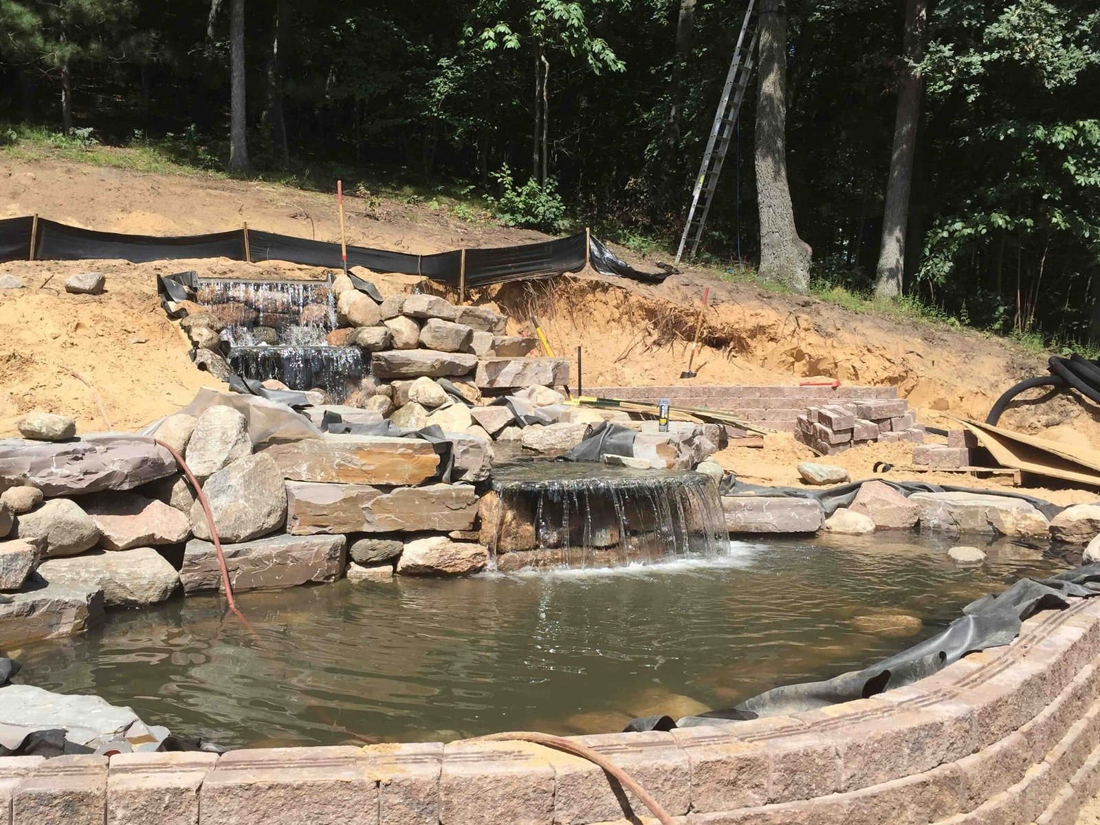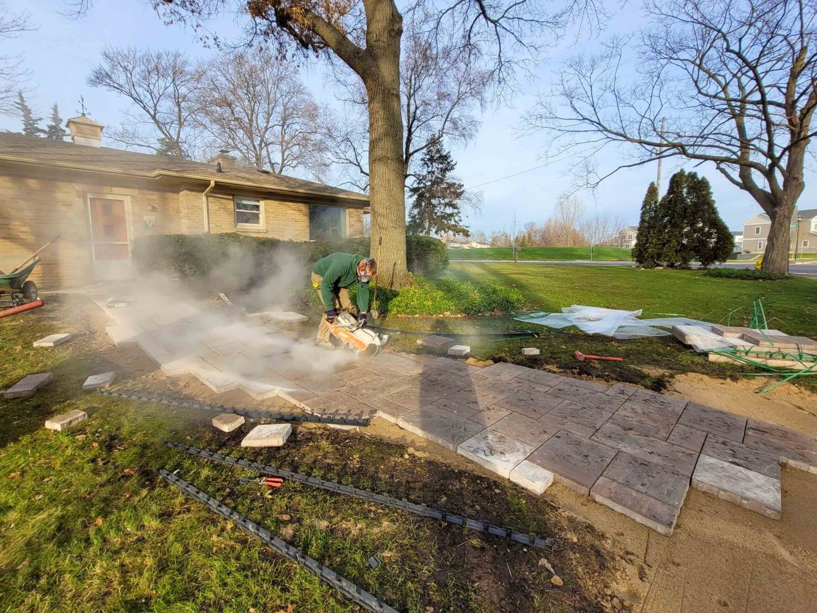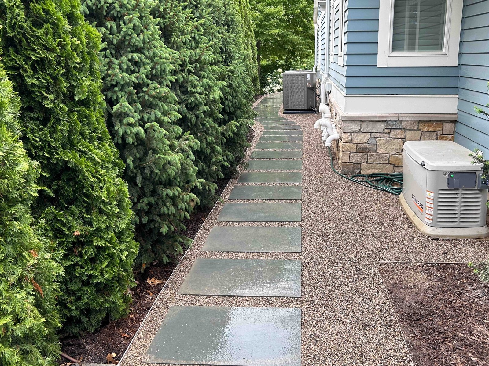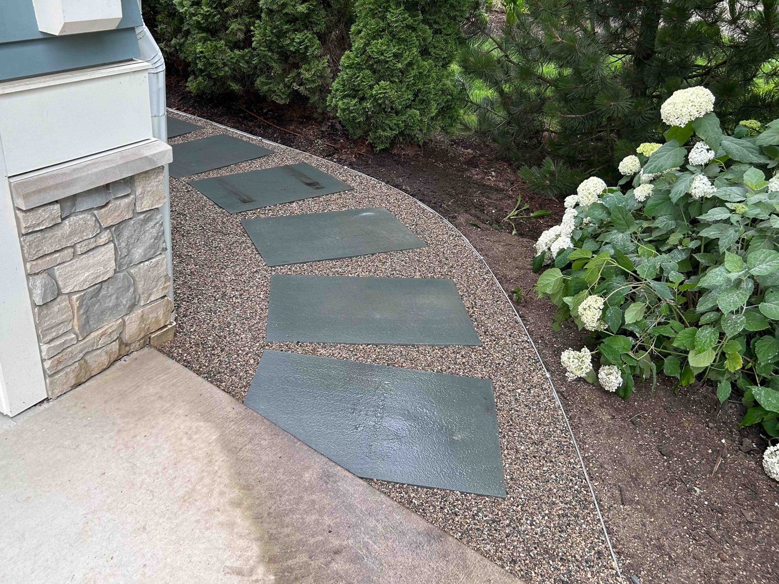 The property was transformed with multi-tiered stone retaining walls, expansive paver patios, a pool, modern railings, lush plantings, a fire pit area, and integrated beach access—creating a stunning, resort-style lakefront retreat.