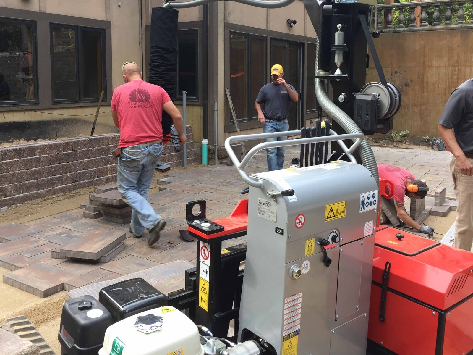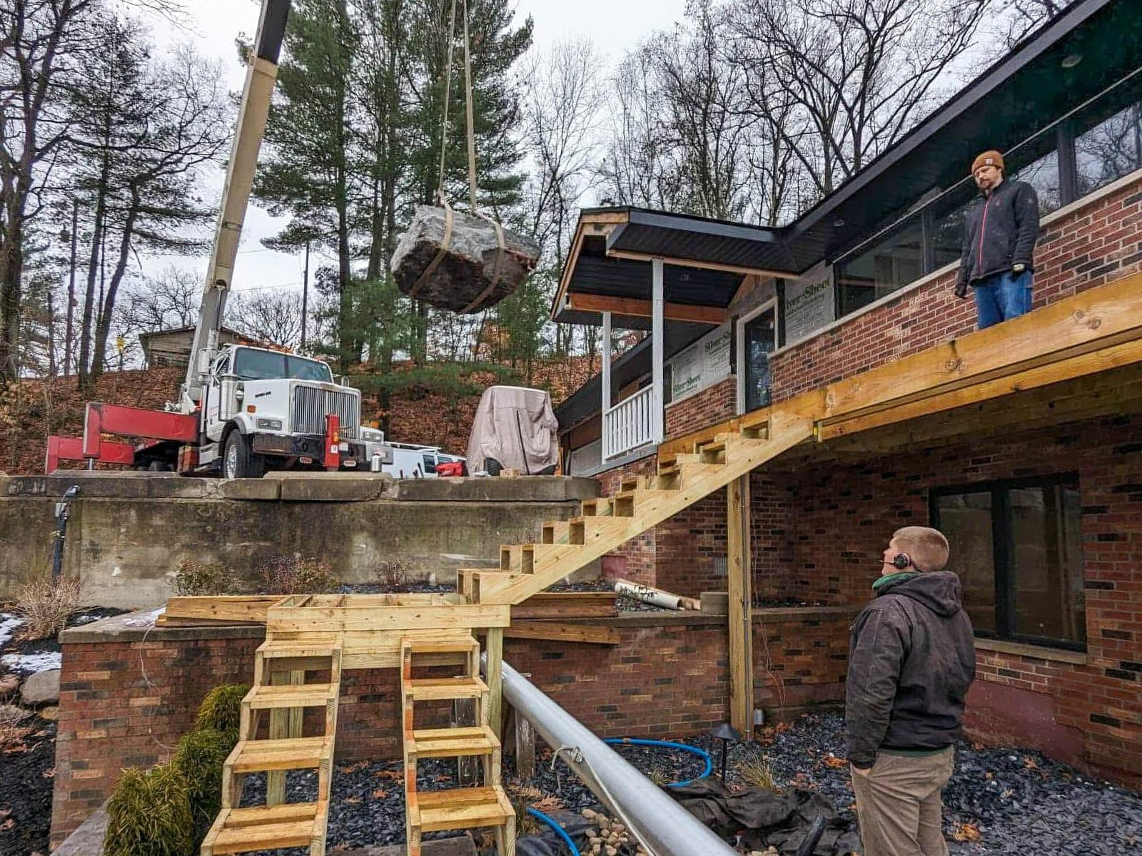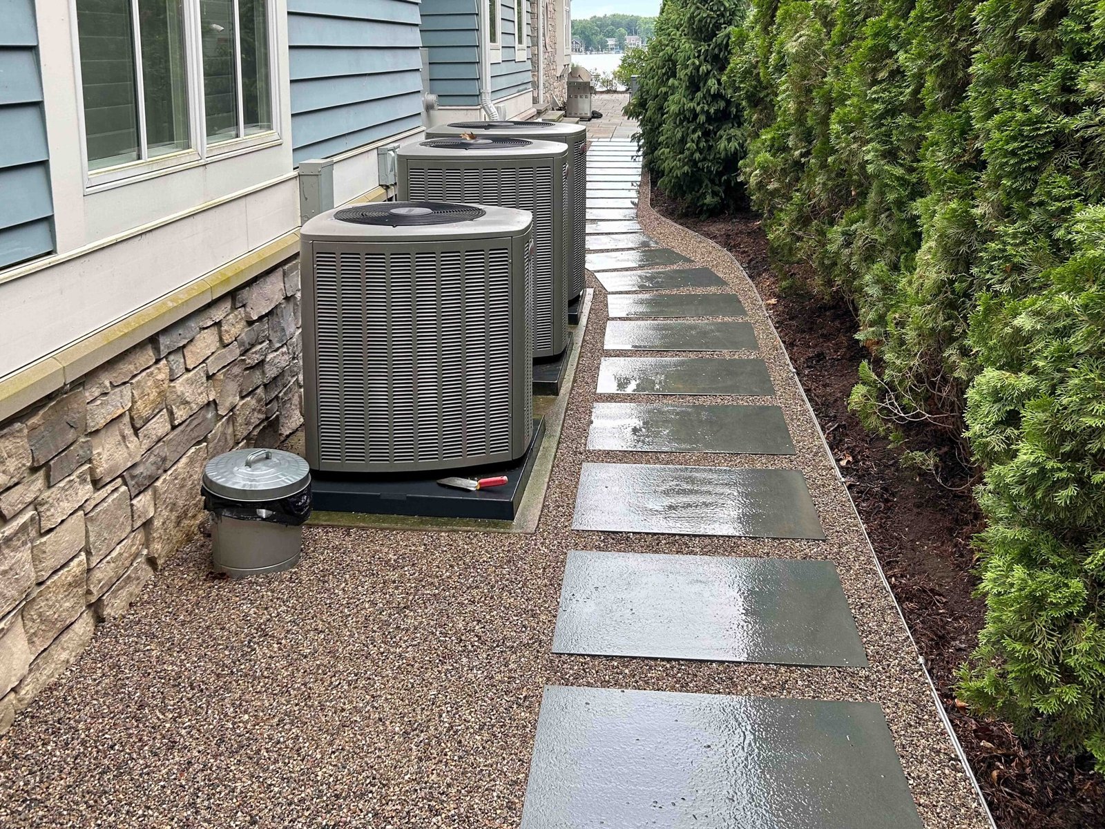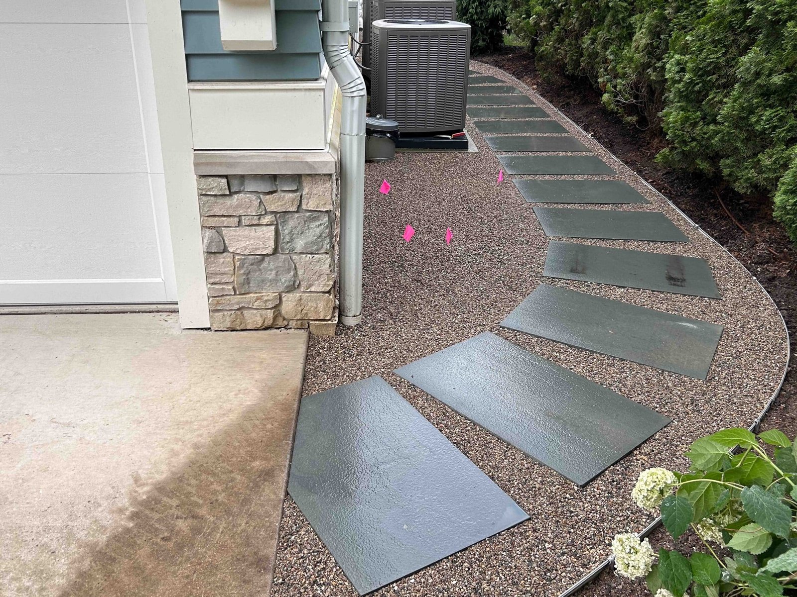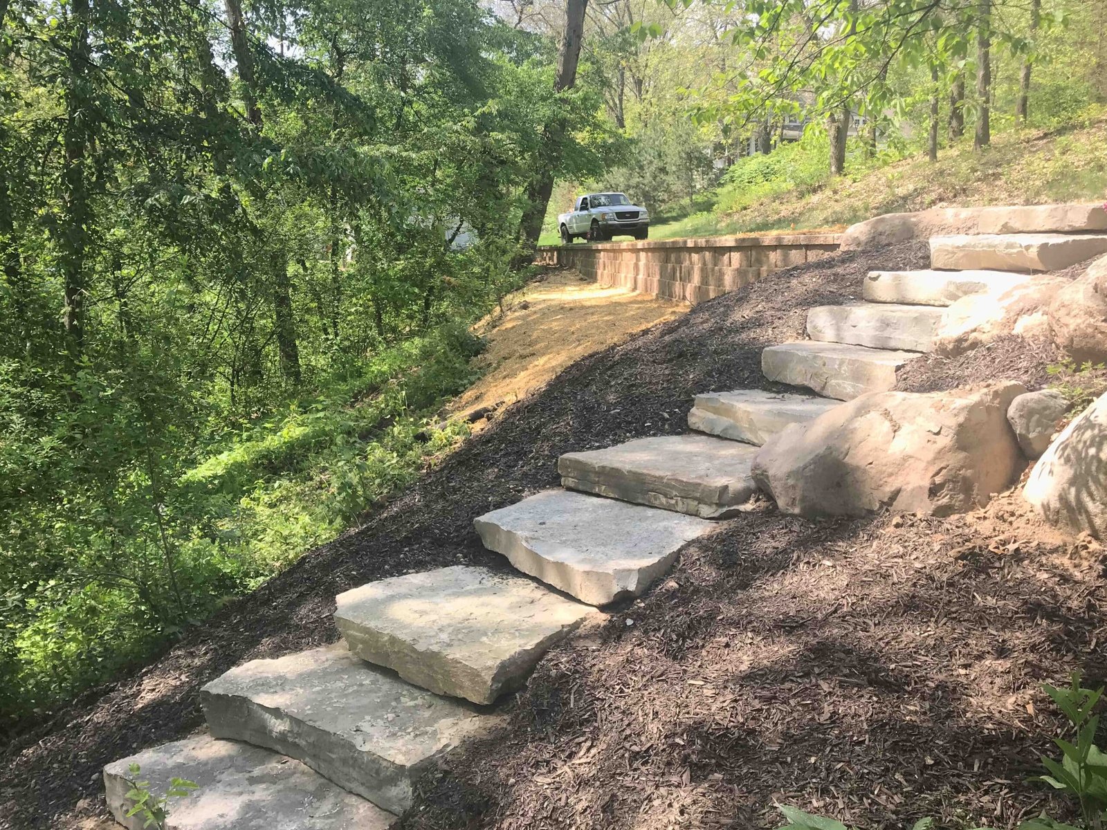 The property was transformed with multi-tiered stone retaining walls, expansive paver patios, a pool, modern railings, lush plantings, a fire pit area, and integrated beach access—creating a stunning, resort-style lakefront retreat.