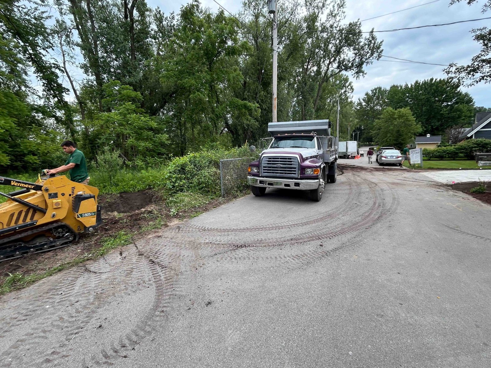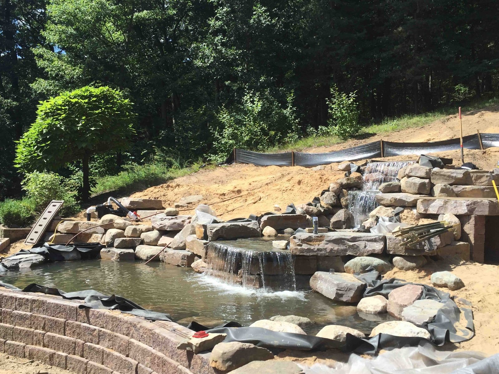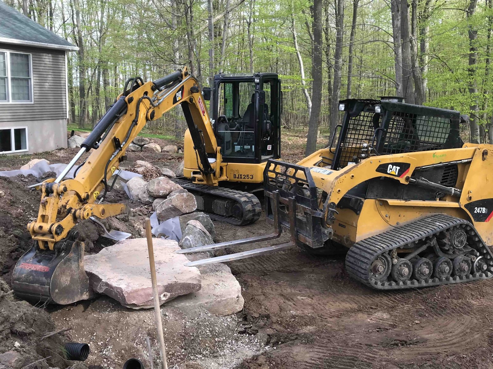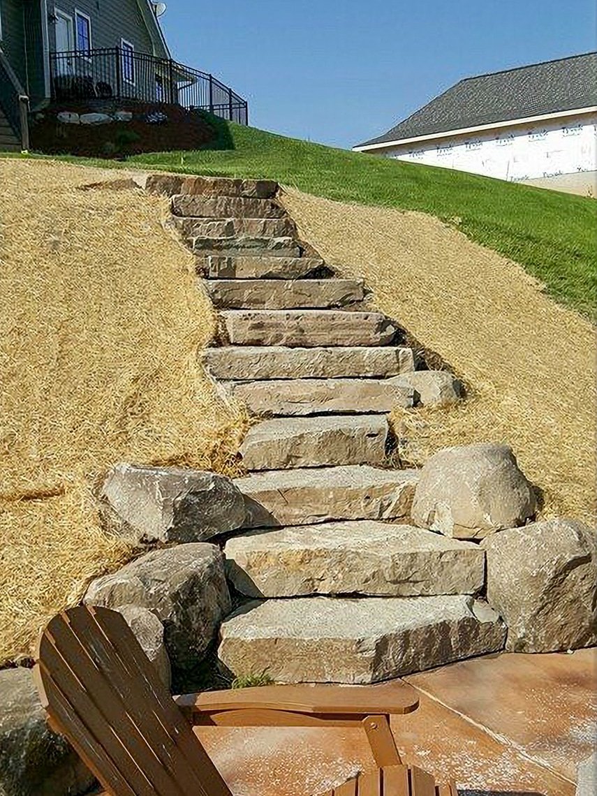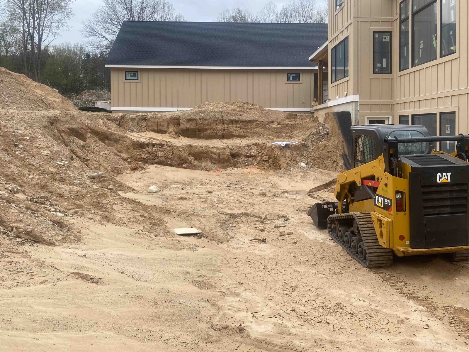 The property was transformed with multi-tiered stone retaining walls, expansive paver patios, a pool, modern railings, lush plantings, a fire pit area, and integrated beach access—creating a stunning, resort-style lakefront retreat.