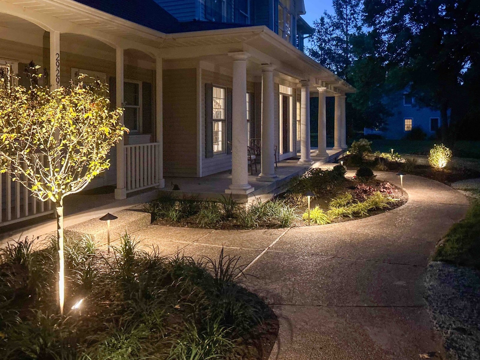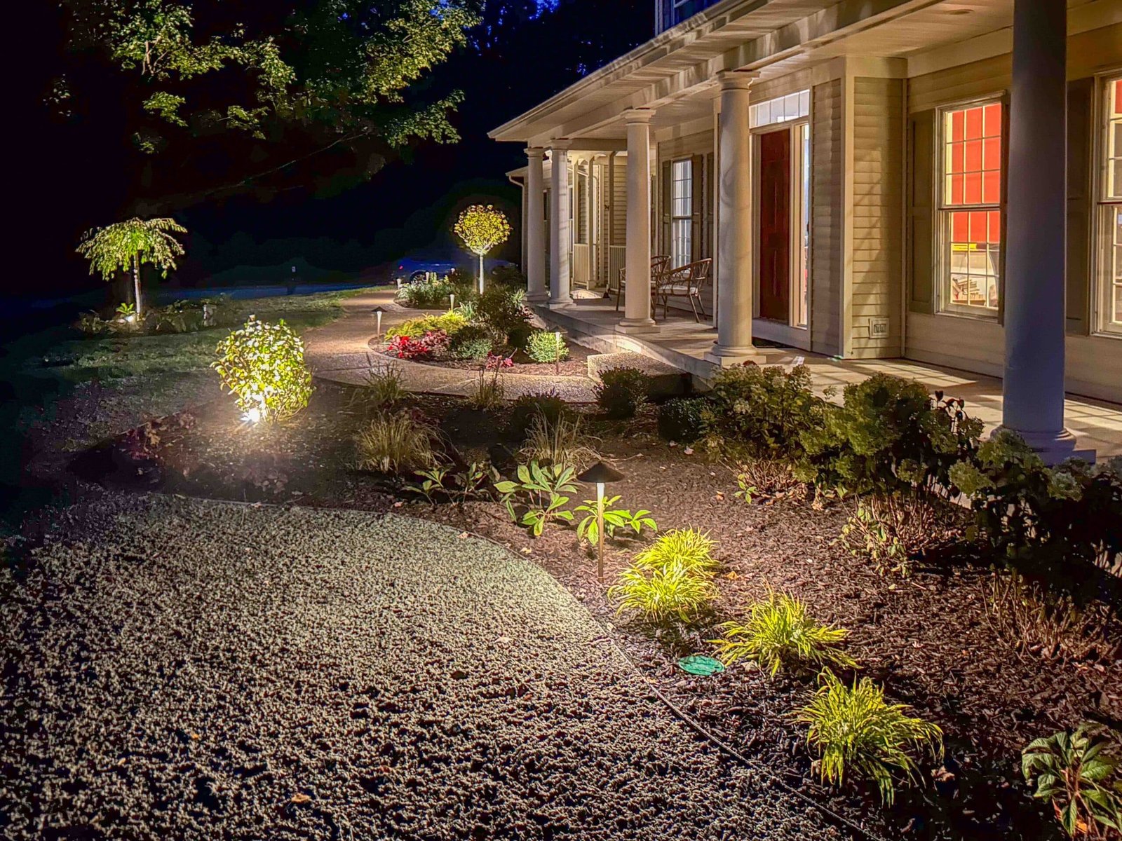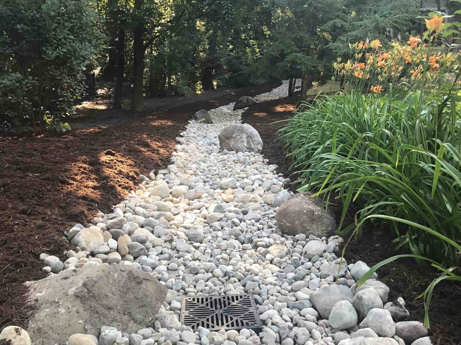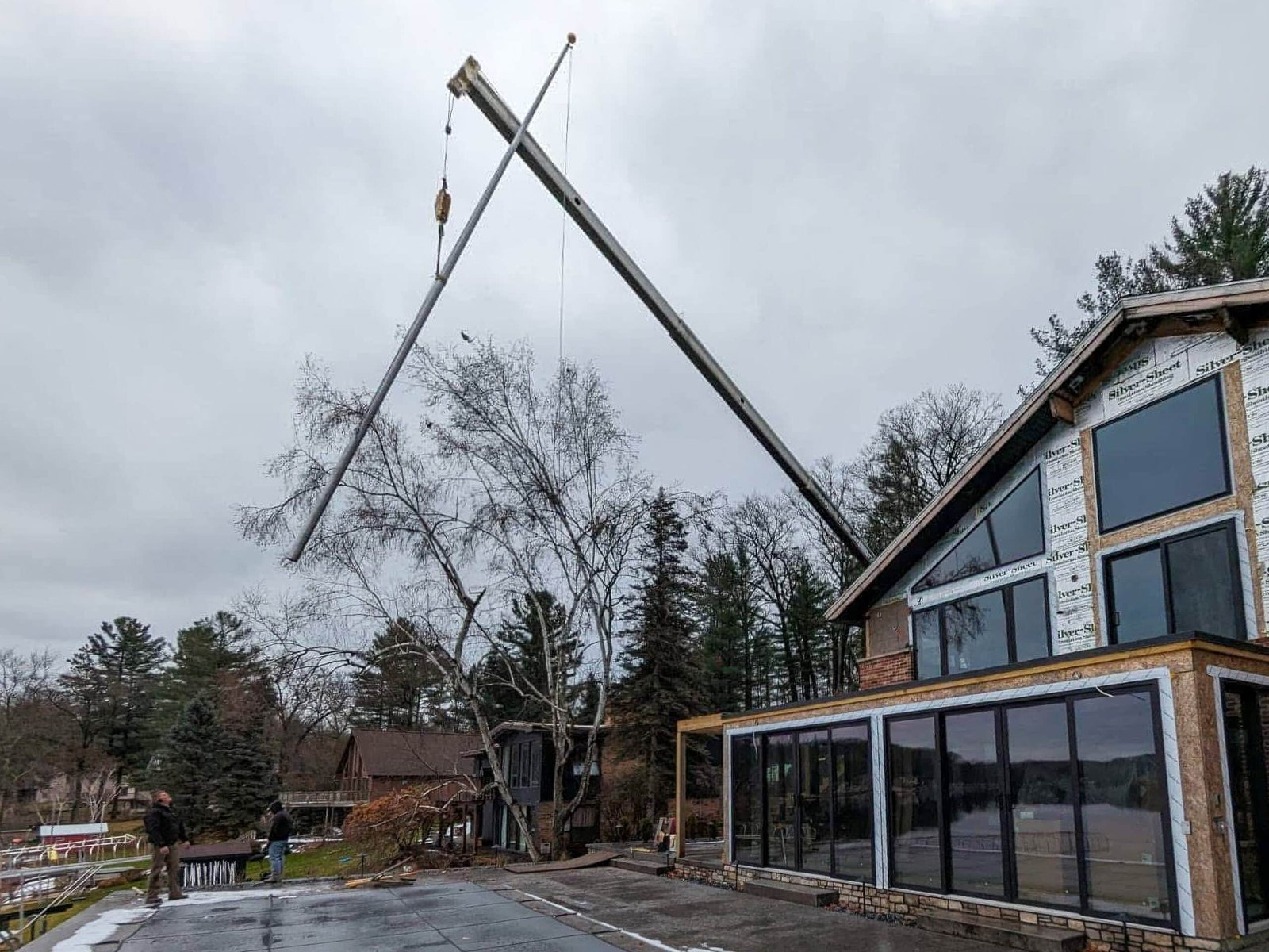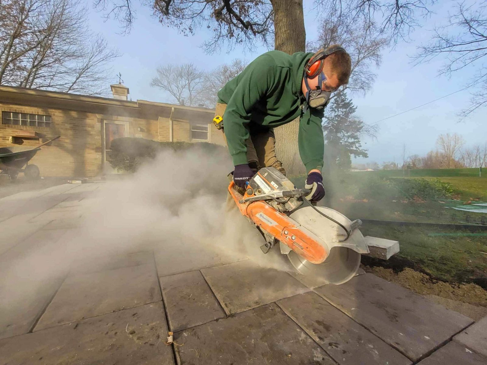 The property was transformed with multi-tiered stone retaining walls, expansive paver patios, a pool, modern railings, lush plantings, a fire pit area, and integrated beach access—creating a stunning, resort-style lakefront retreat.