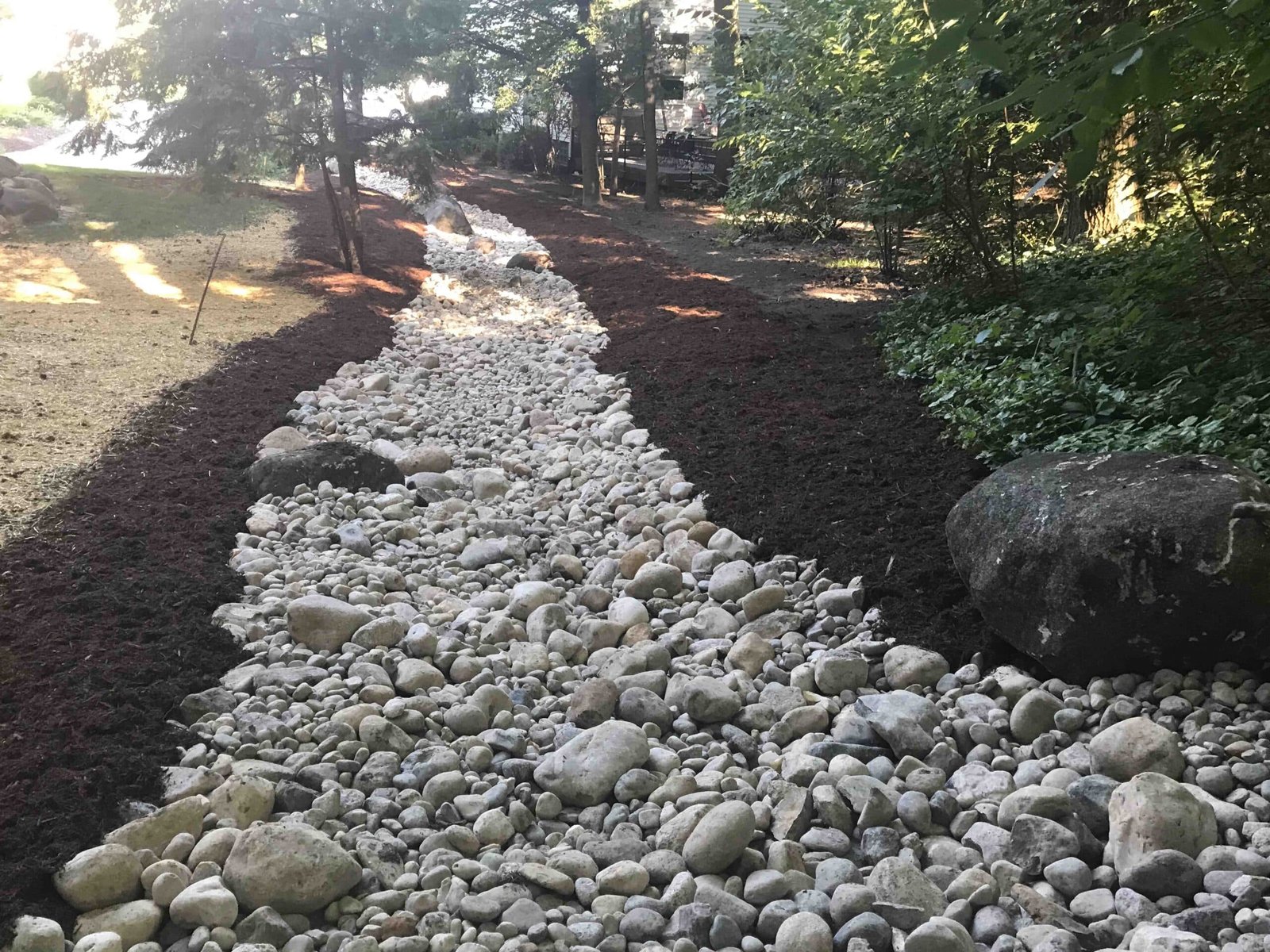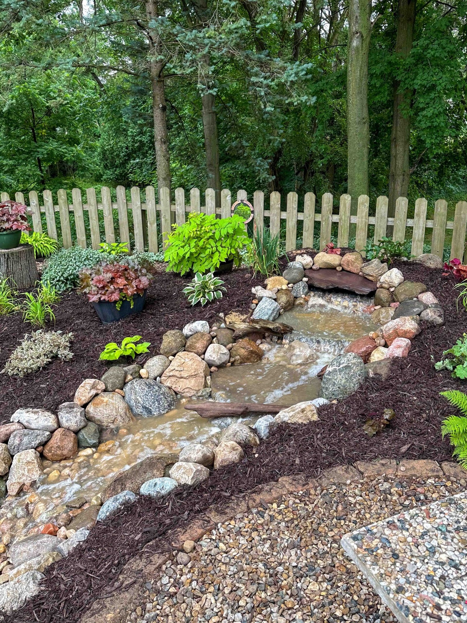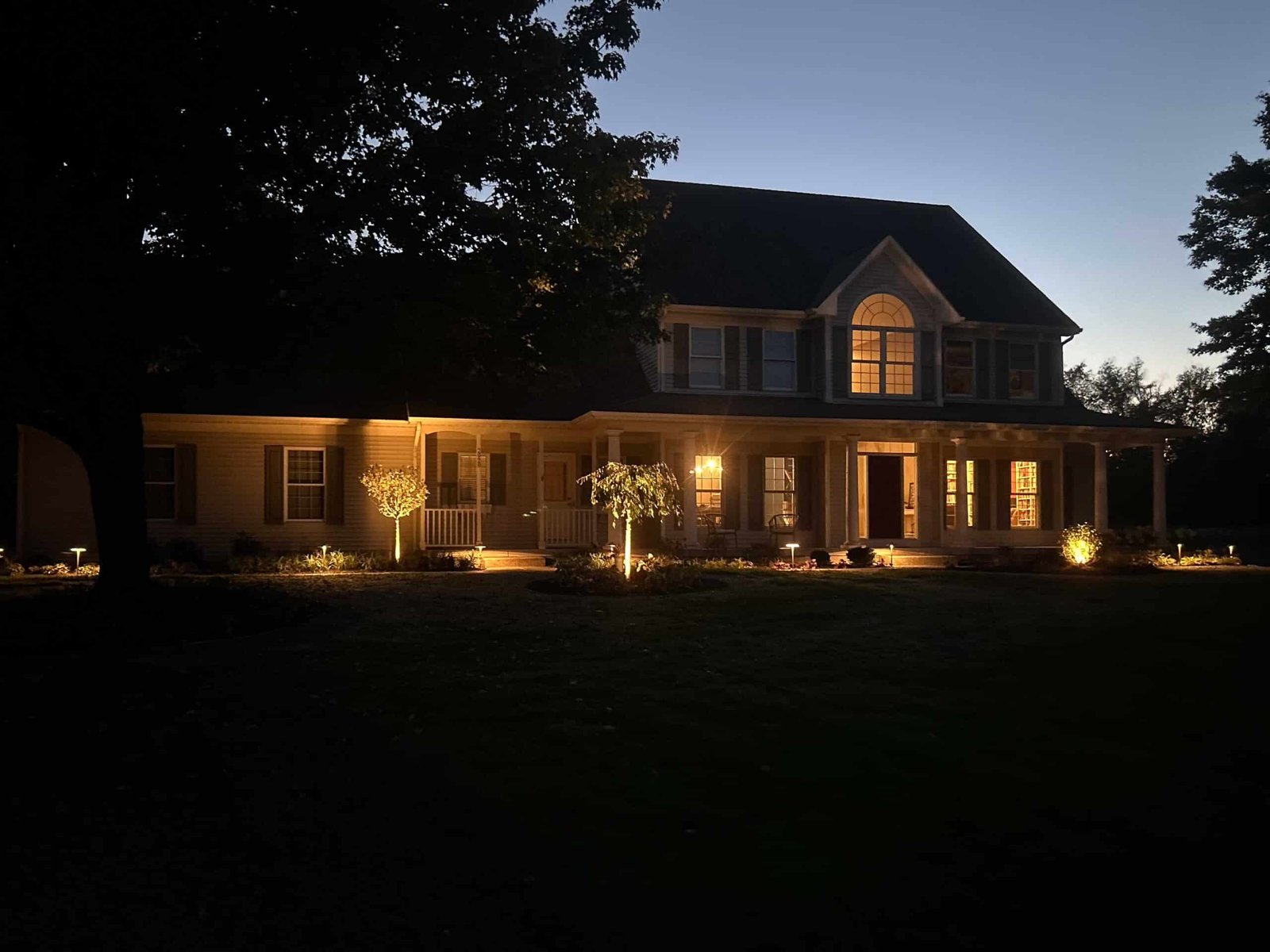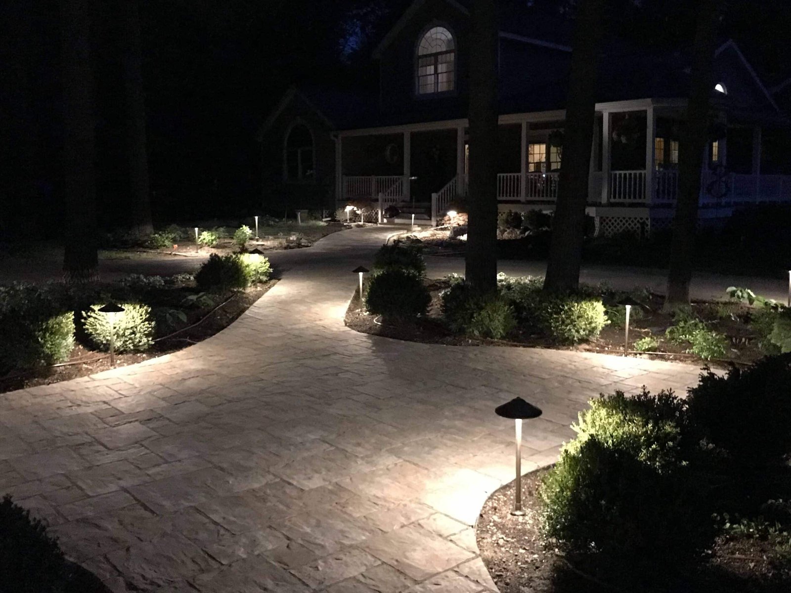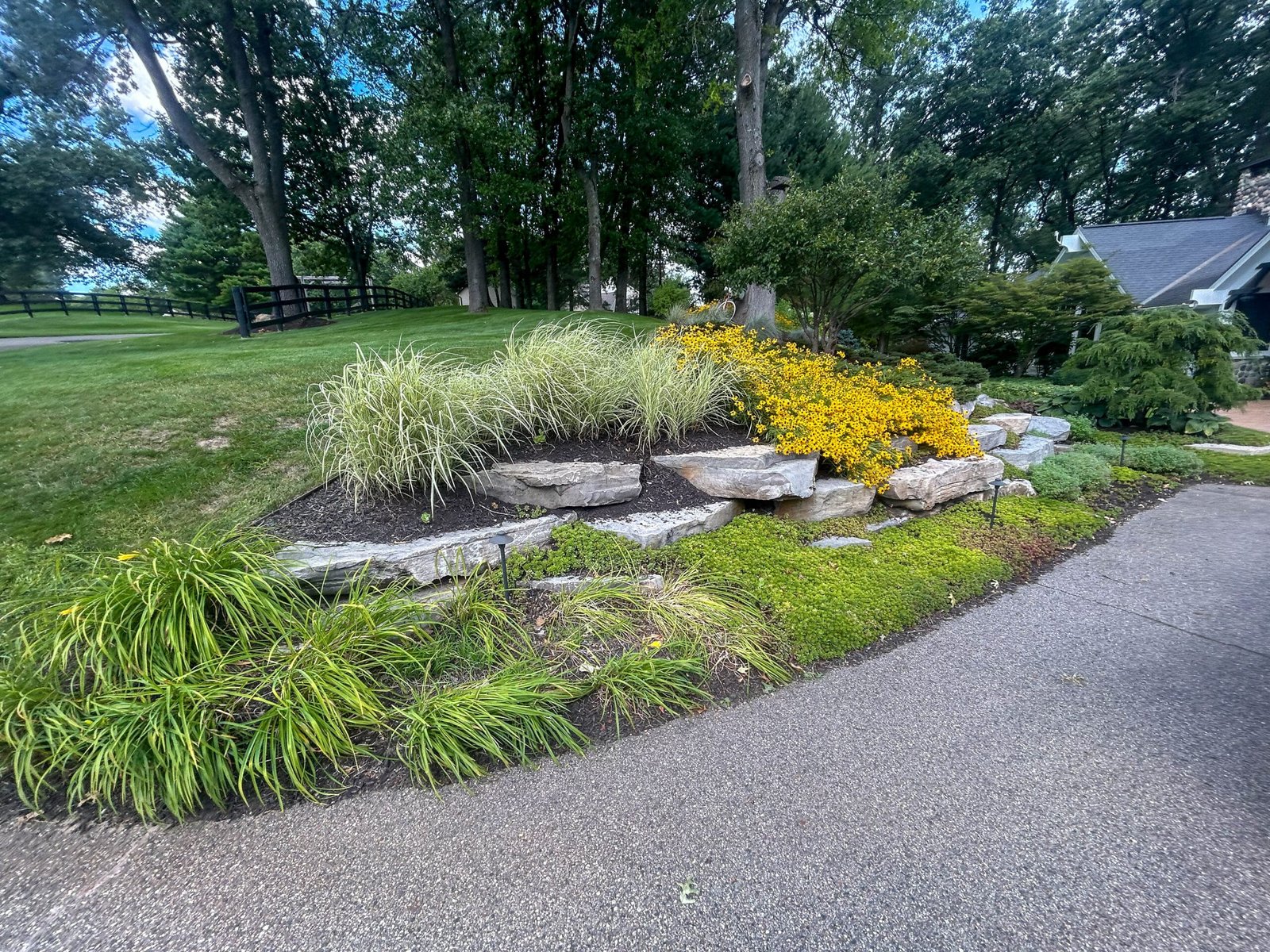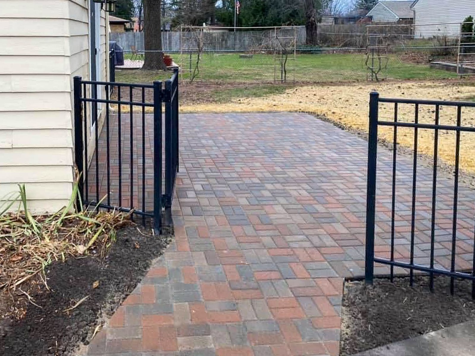 The property was transformed with multi-tiered stone retaining walls, expansive paver patios, a pool, modern railings, lush plantings, a fire pit area, and integrated beach access—creating a stunning, resort-style lakefront retreat.
