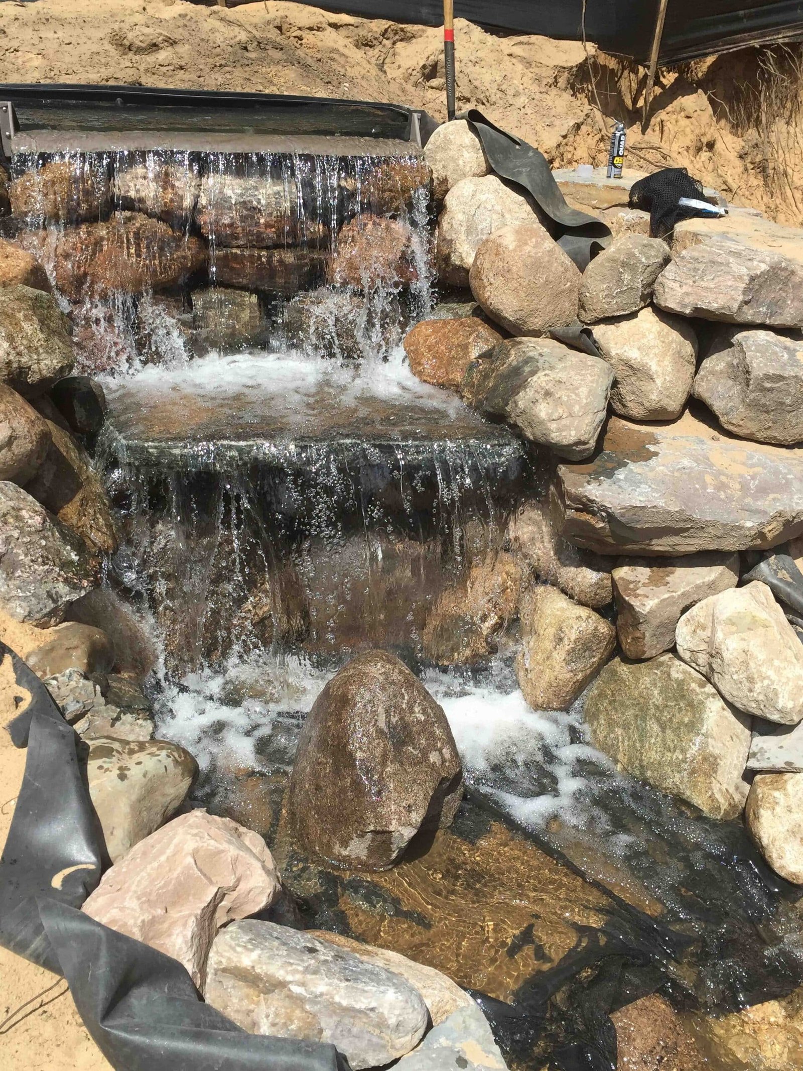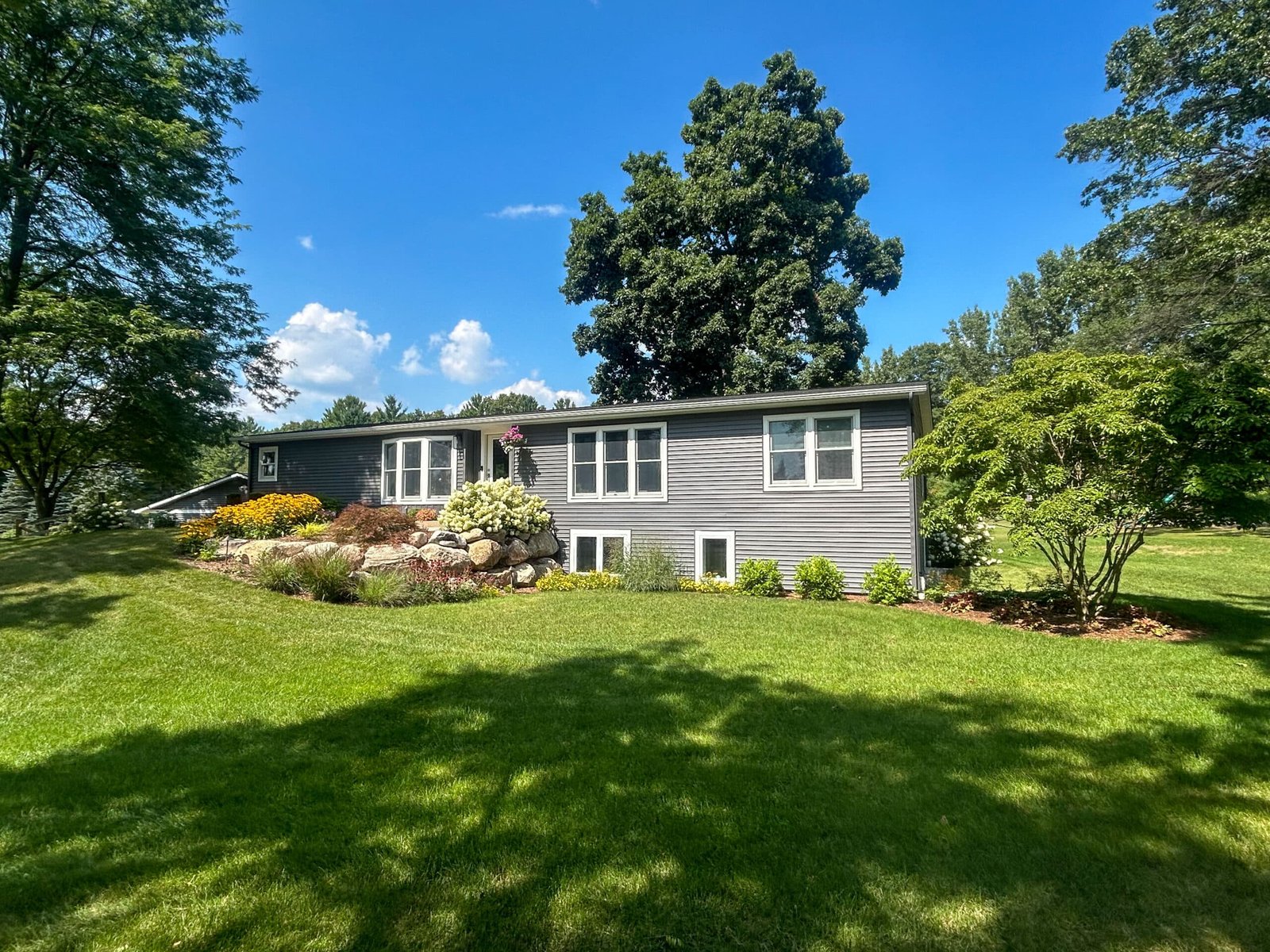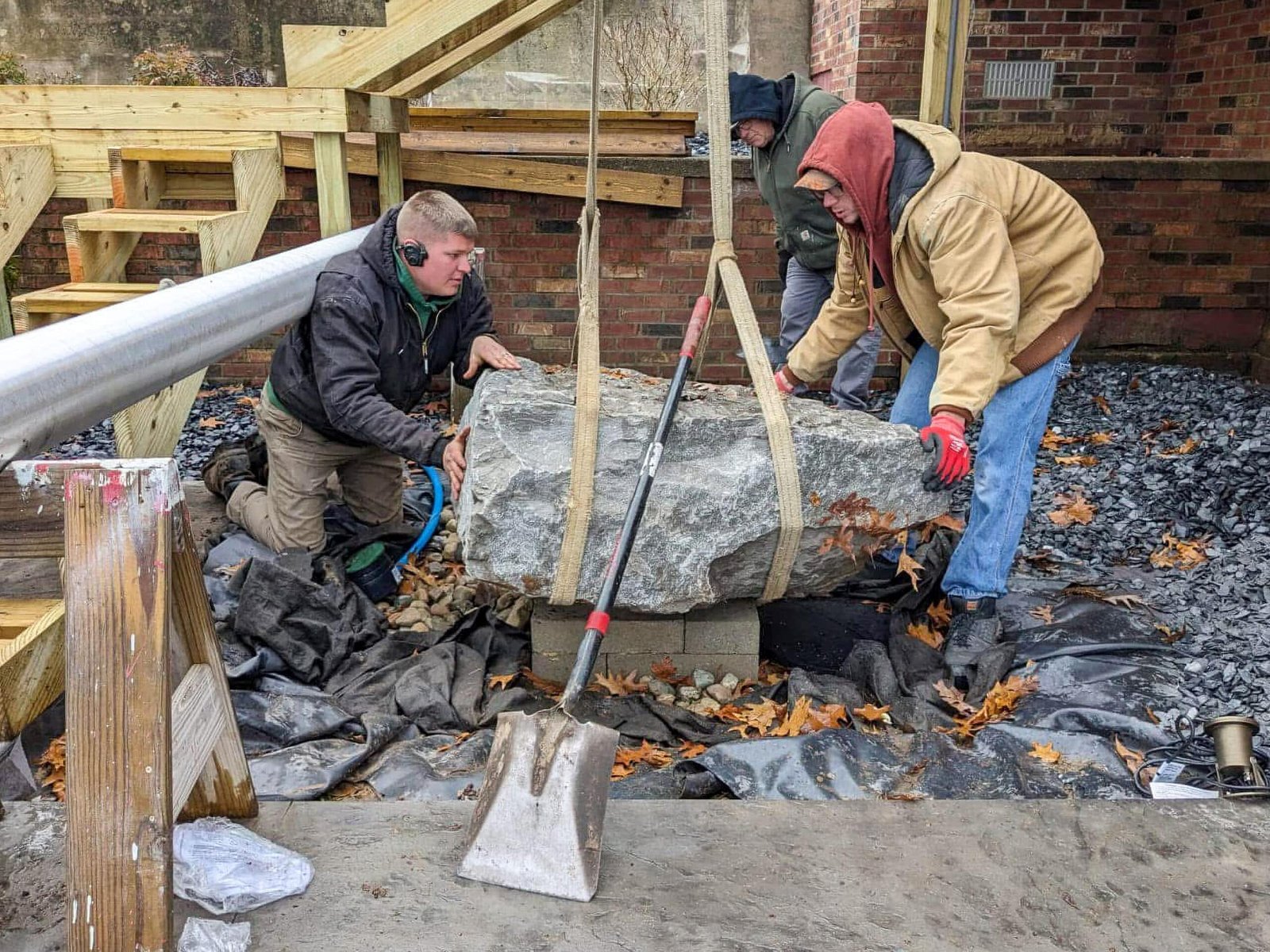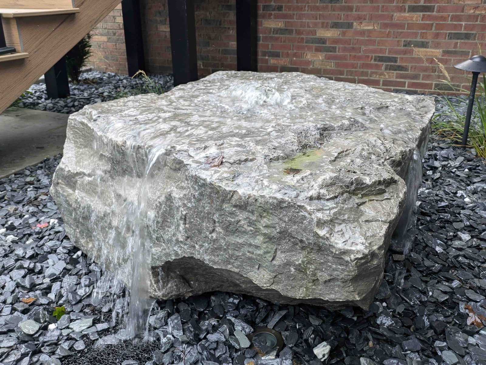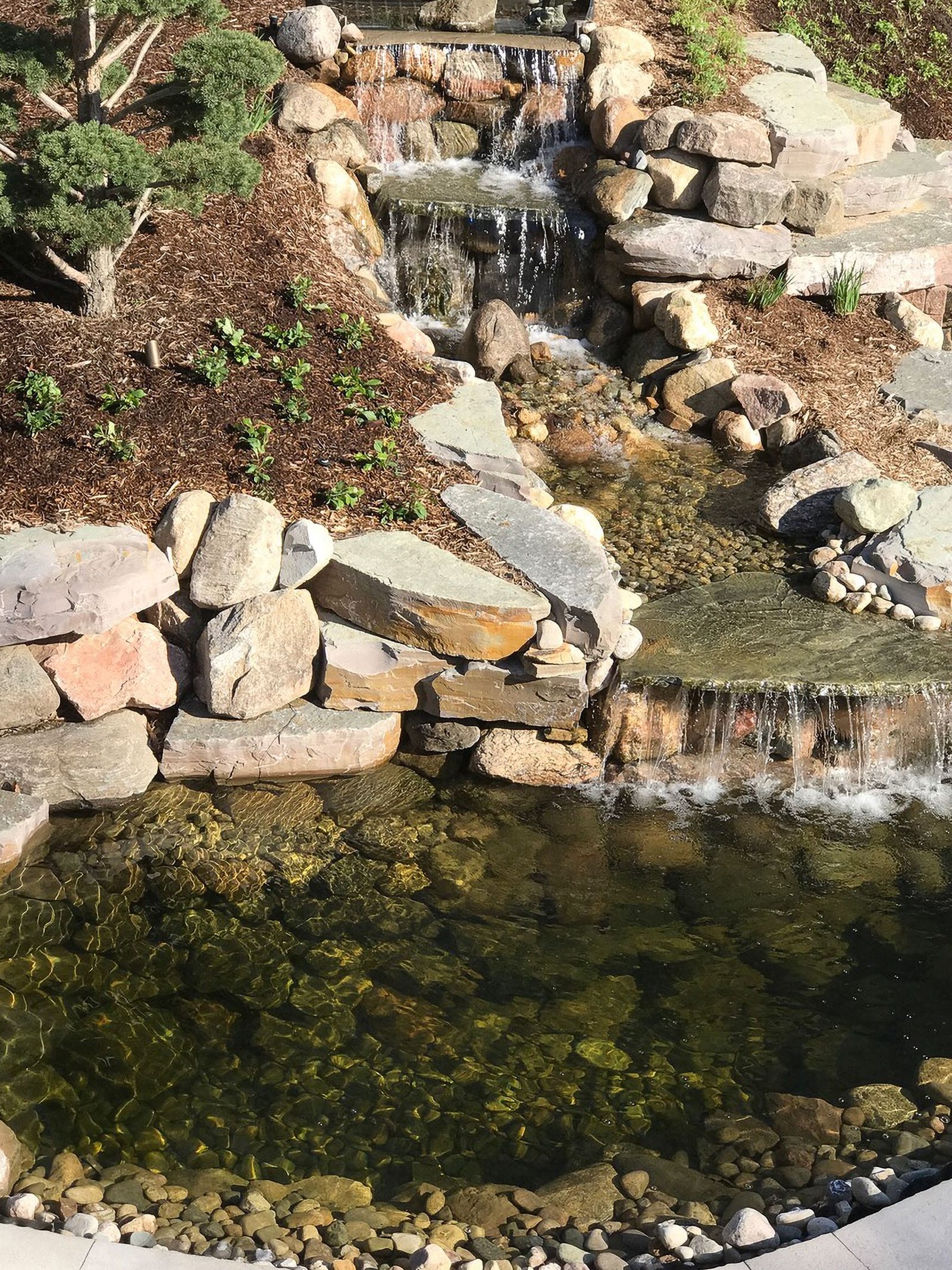 The property was transformed with multi-tiered stone retaining walls, expansive paver patios, a pool, modern railings, lush plantings, a fire pit area, and integrated beach access—creating a stunning, resort-style lakefront retreat.