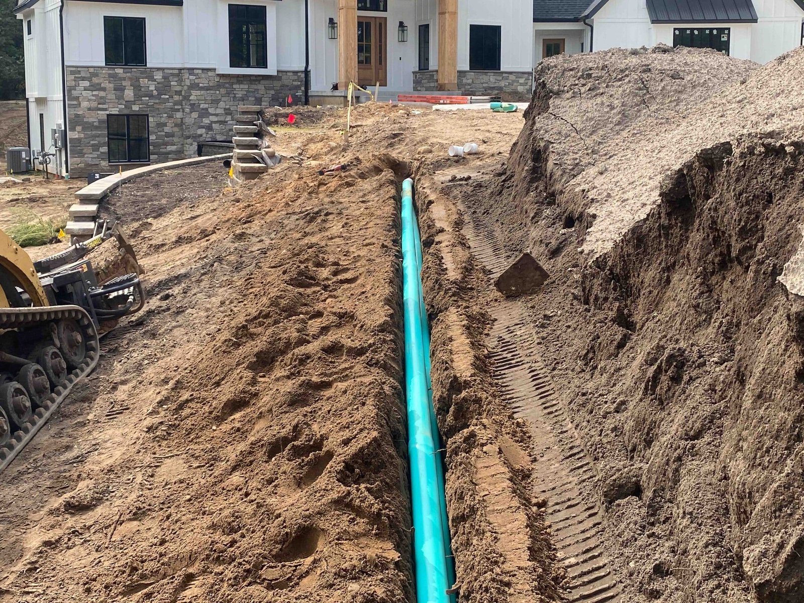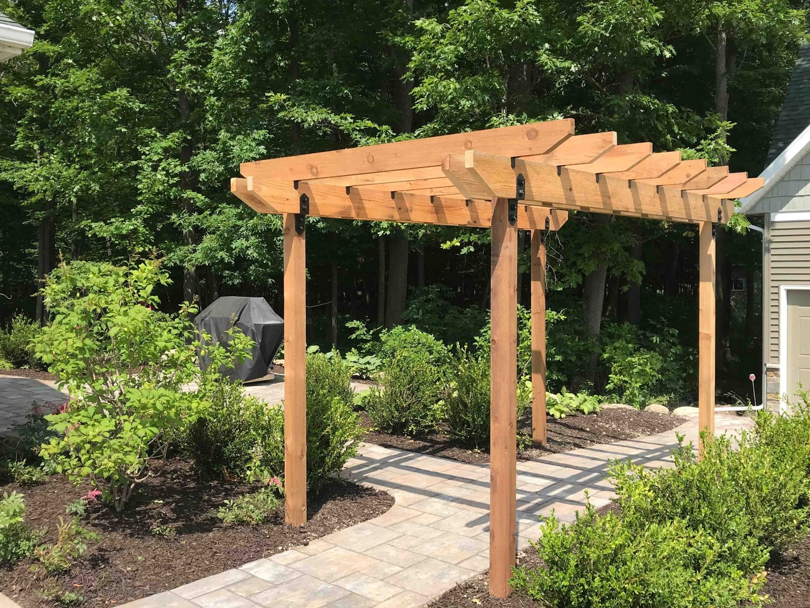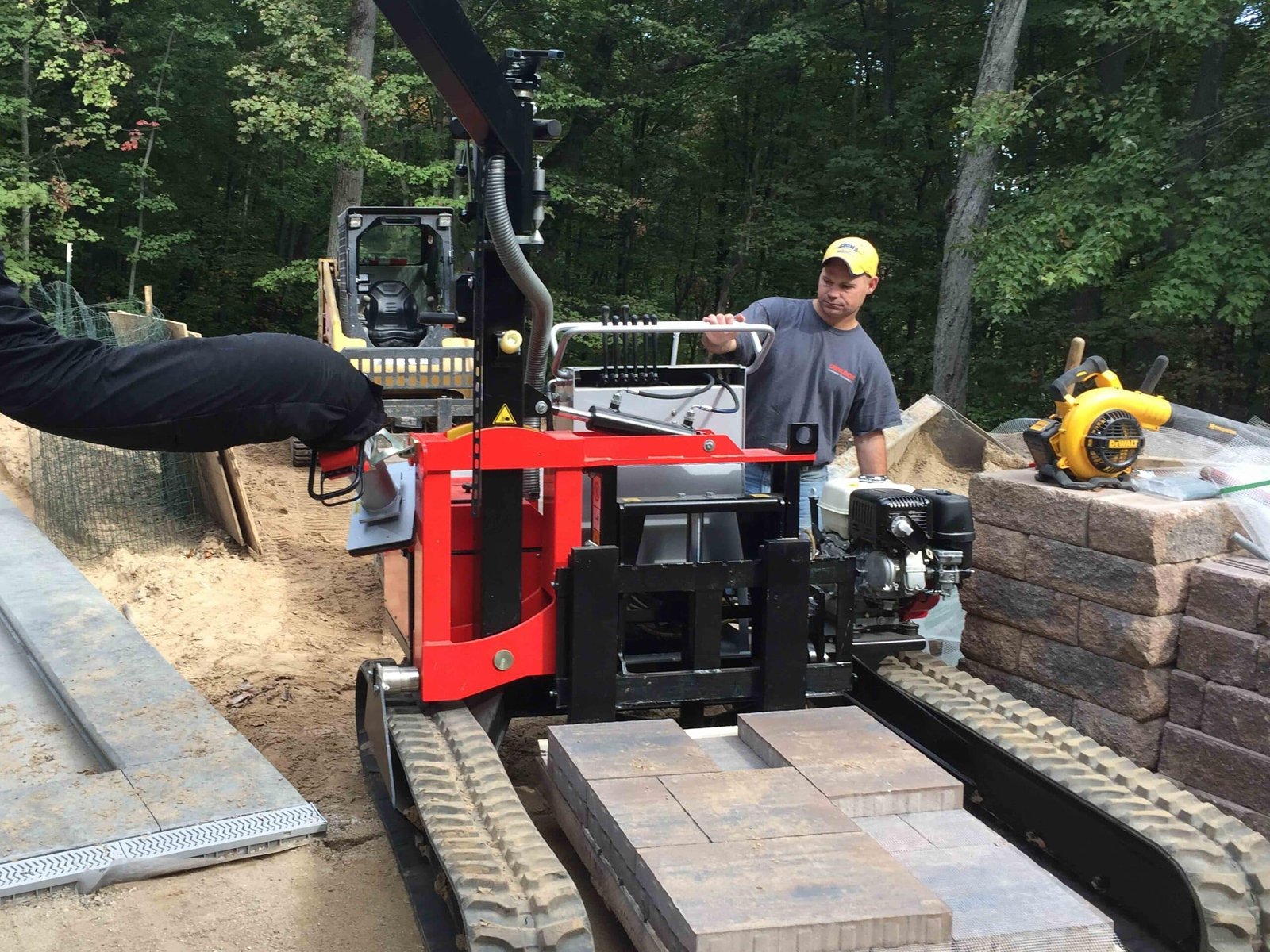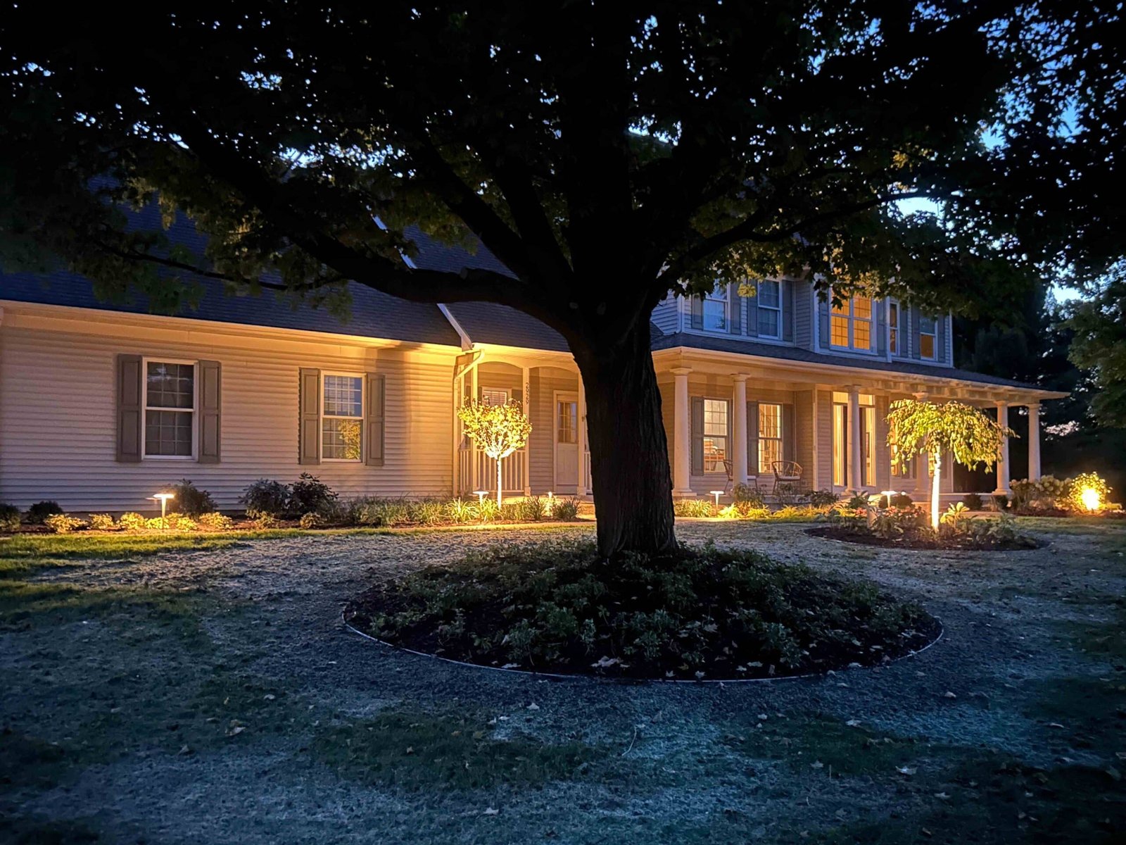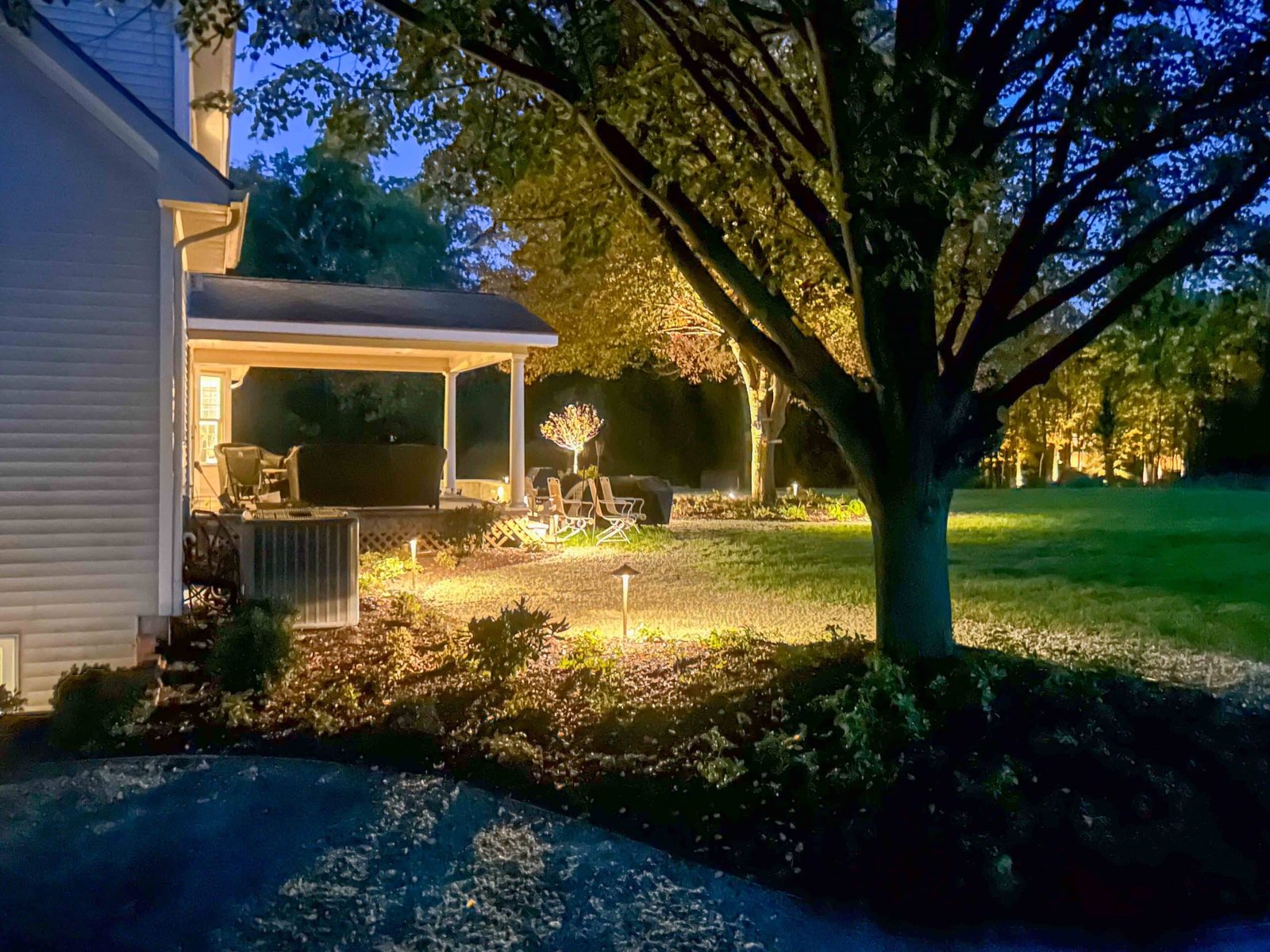 The property was transformed with multi-tiered stone retaining walls, expansive paver patios, a pool, modern railings, lush plantings, a fire pit area, and integrated beach access—creating a stunning, resort-style lakefront retreat.